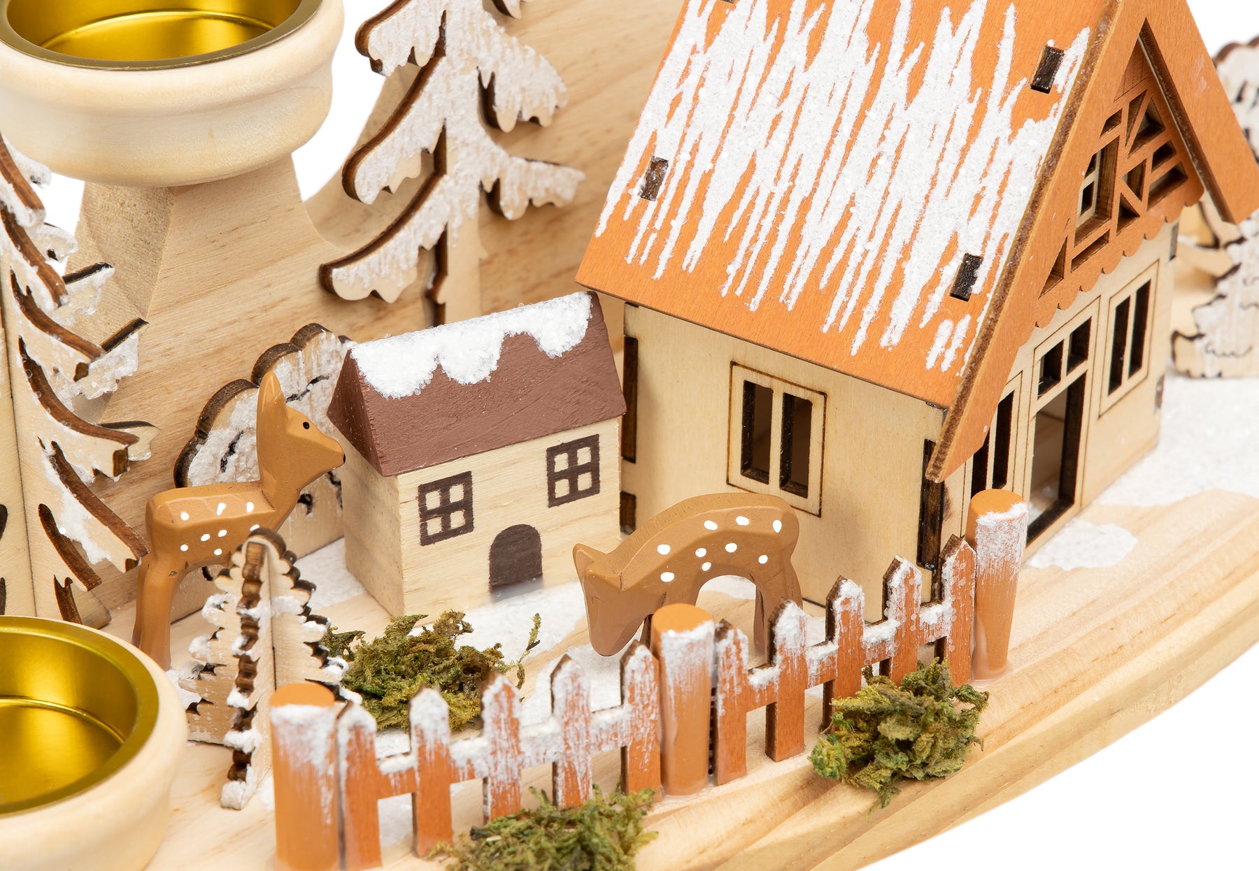 Dieser wunderschöne Teelichthalter bringt weihnachtliche Stimmung in Ihr Zuhause. Mit einem charmanten Design, das sich aus einer verschneiten Landschaft mit feinen Holzschnitten und liebevollen Details zusammensetzt, verleiht der Halter Ihrem Raum eine festliche Atmosphäre. Auf der Basis eines soliden Holzsockels erheben sich stilisierte Tannenbäume und ein malerisches Gebäude, umrahmt von einer glitzernden Schneedecke.