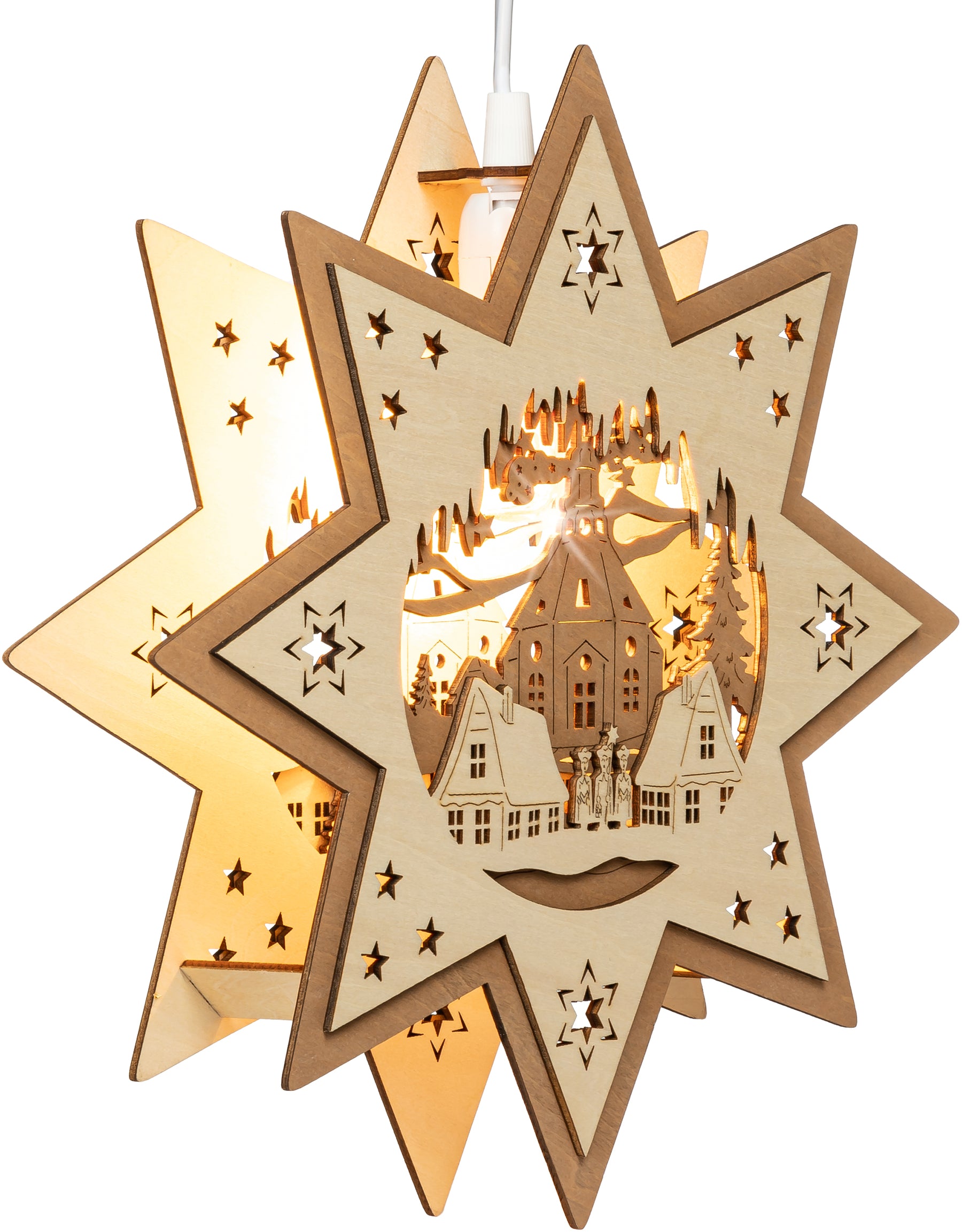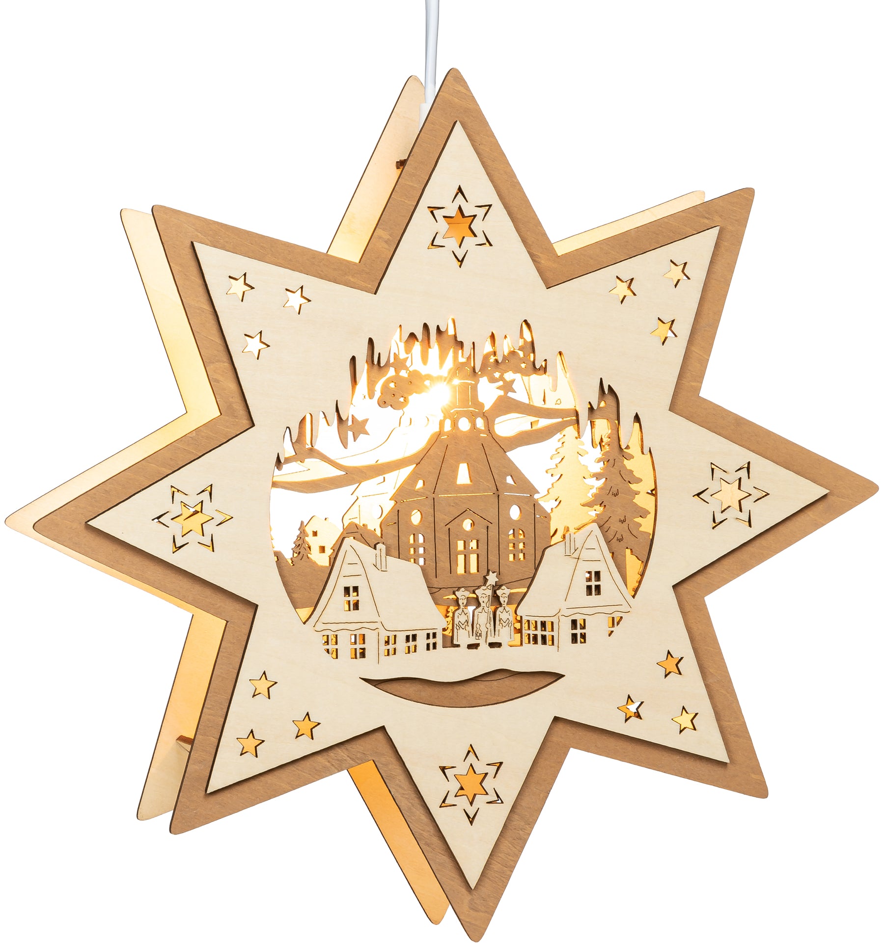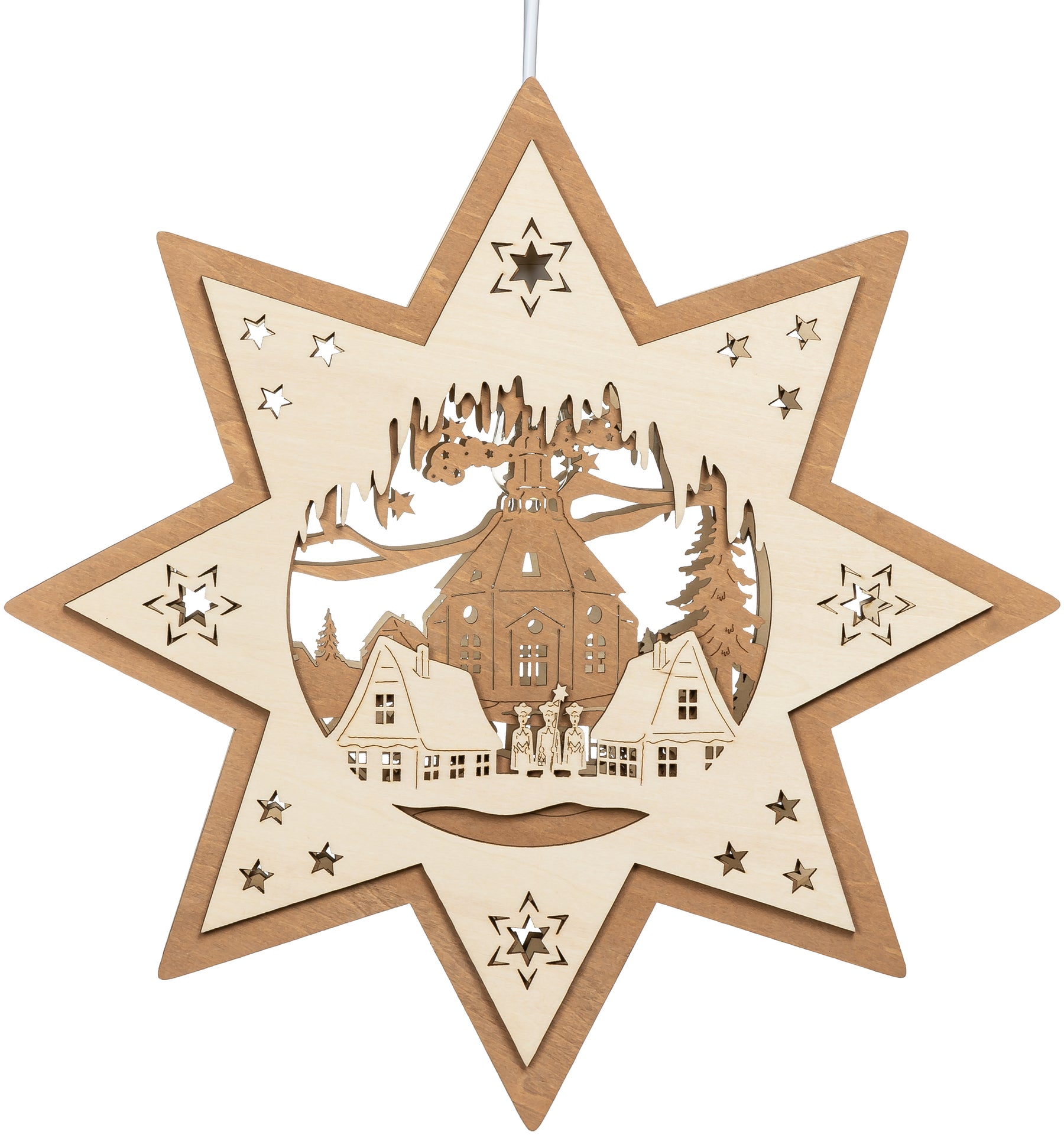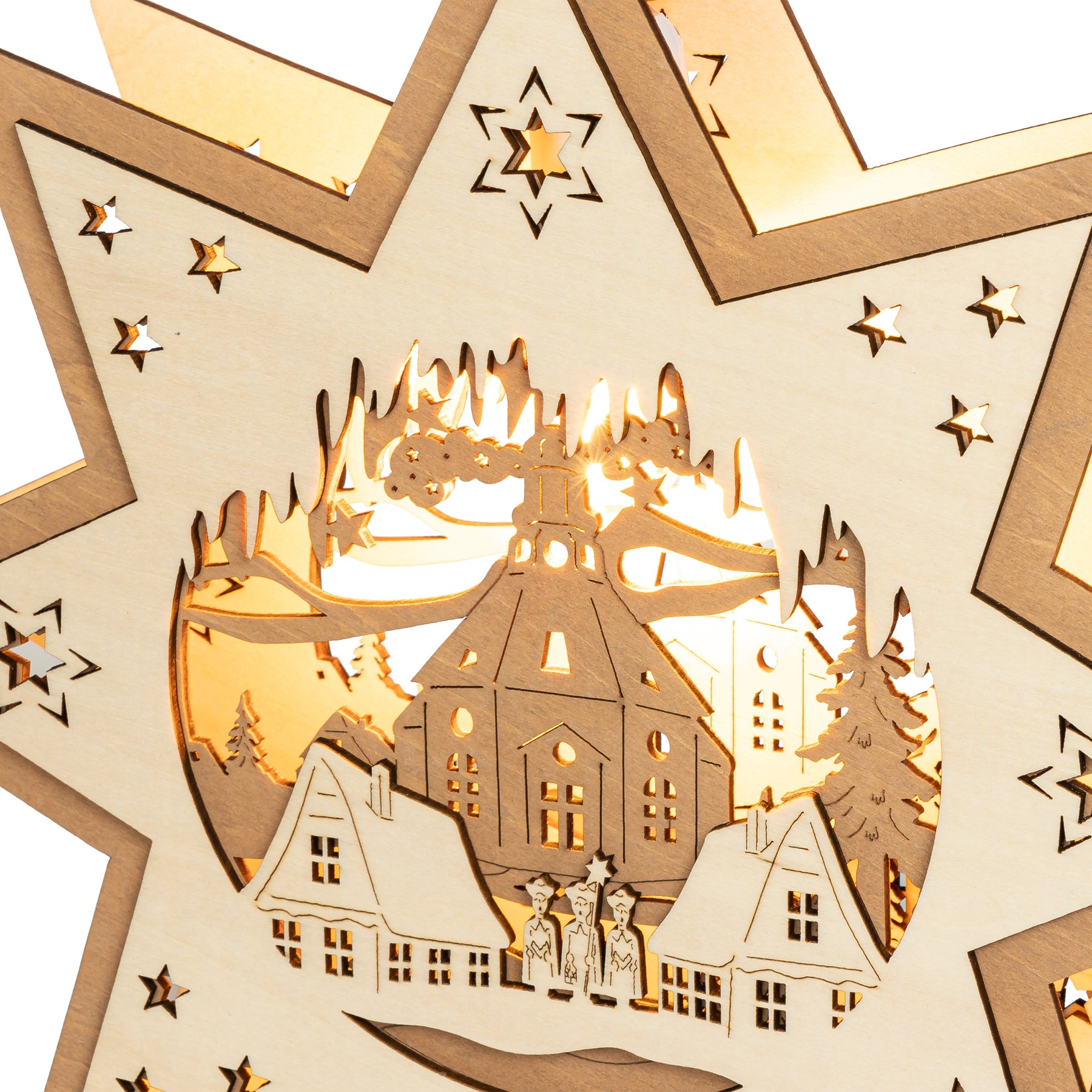 Wunderschönes detailreiches 2-farbiges Holz Fensterbild in Form eines Sterns. Mit seinem verdeckt angebrachtem Leuchtmittel strahlt dieser Fensterschmuck eine sanfte, weihnachtliche Stimmung aus. Es zeigt eine winterliche Stadtszene mit Kirche, Dreikönigssängern und schneebedeckten Häusern und ist teilweise mit einen warmen Braunton lasiert. Der Stern hat ein ca. 1,50 m langes, weißes Kabel mit Stecker, praktischen An-/Aus-Schalter, E10-Fassung und ein wechselbares Leuchtmittel, das in der Mitte angebracht ist, beleuchtet. Eine liebevoll aufwändige Arbeit für Ihre weihnachtliche Fensterdekoration! Maße ca. BxHxT: 29,5 x 32 x 5,5 cm, Gewicht ca. 270 gr - SIKORA Weihnachtswelt
