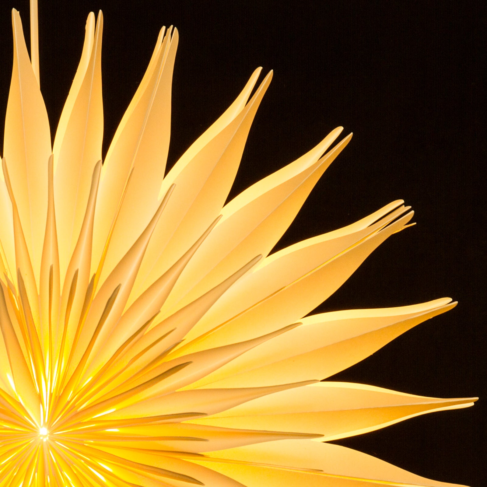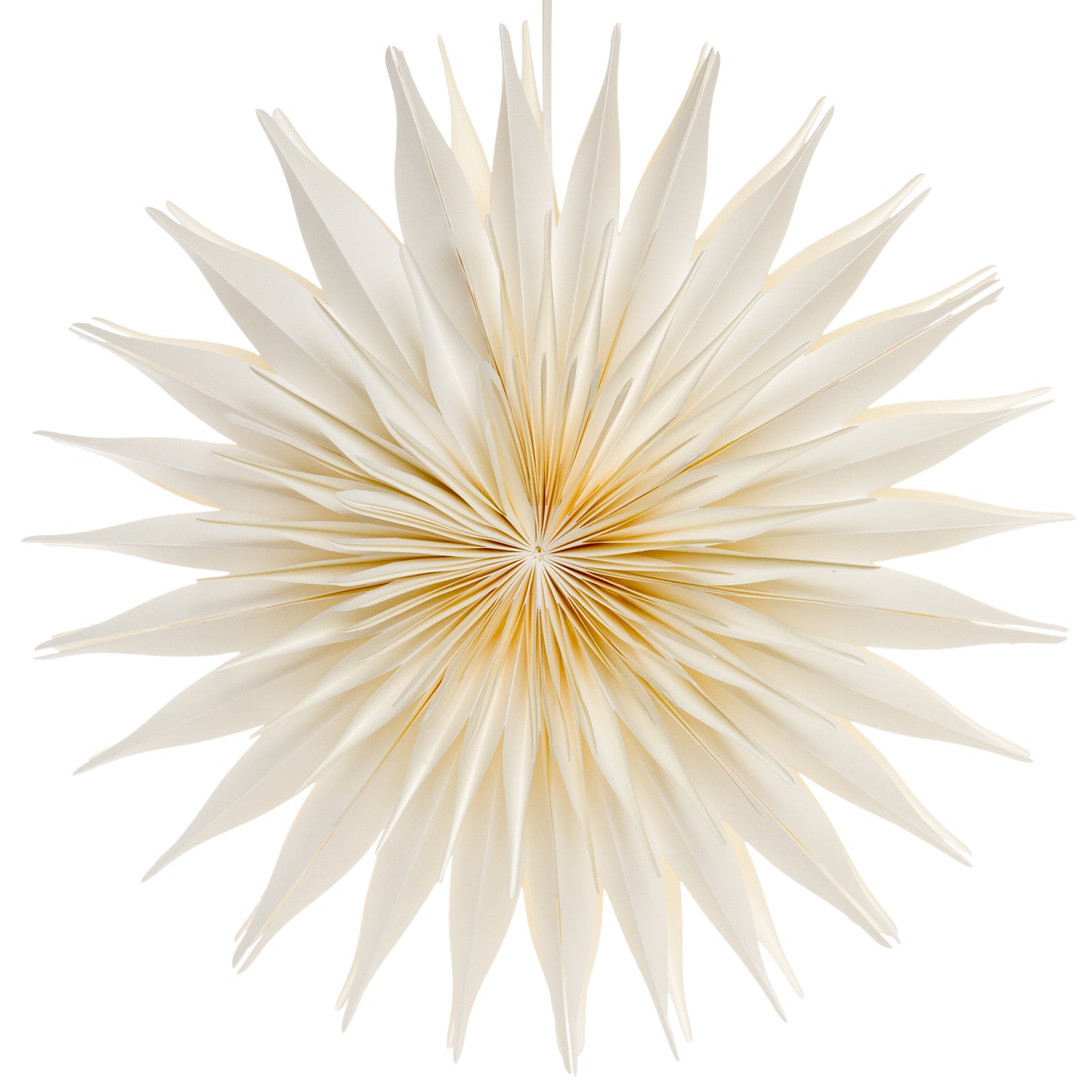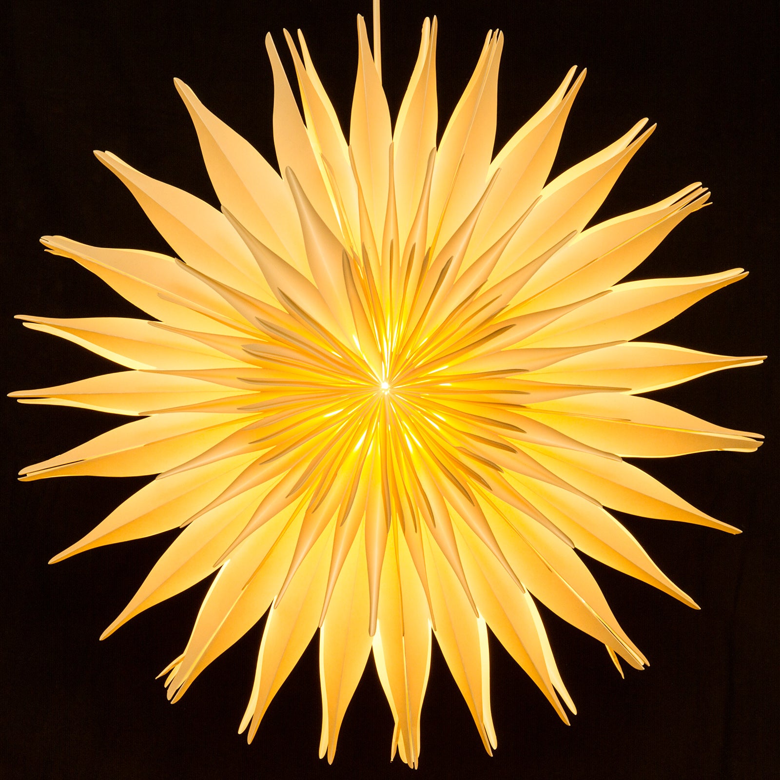 Wunderschöner riesengroßer XXL Papierstern mit Beleuchtung. Dieser Stern mit Premium Qualität ist in mühevoller Arbeit aus handgeschöpftem naturfarbenem Papier gefertigt. Die Dicke des Papiers ist dabei so gewählt, daß das durch das Leuchtmittel im Inneren des Sterns erzeugte Licht auf besonders angenehme und stimmungsvolle Art durch die Hülle hindurchscheint. Dem Stern liegt ein 4m langes, weißes Kabel mit Stecker, An-/Aus-Schalter, Fassung, ein Leuchtmittel mit Schutzhülle bei. Der Stern hat einen Durchmesser von ca. 60cm und ist auch perfekt als stimmungsvolle Zimmer- Decken oder Wandleuchte für das ganze Jahr geeignet. SIKORA Weihnachtswelt.