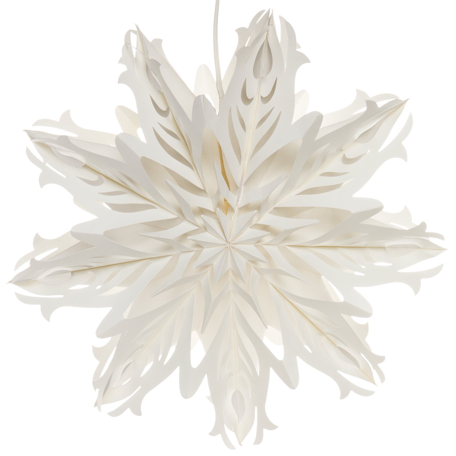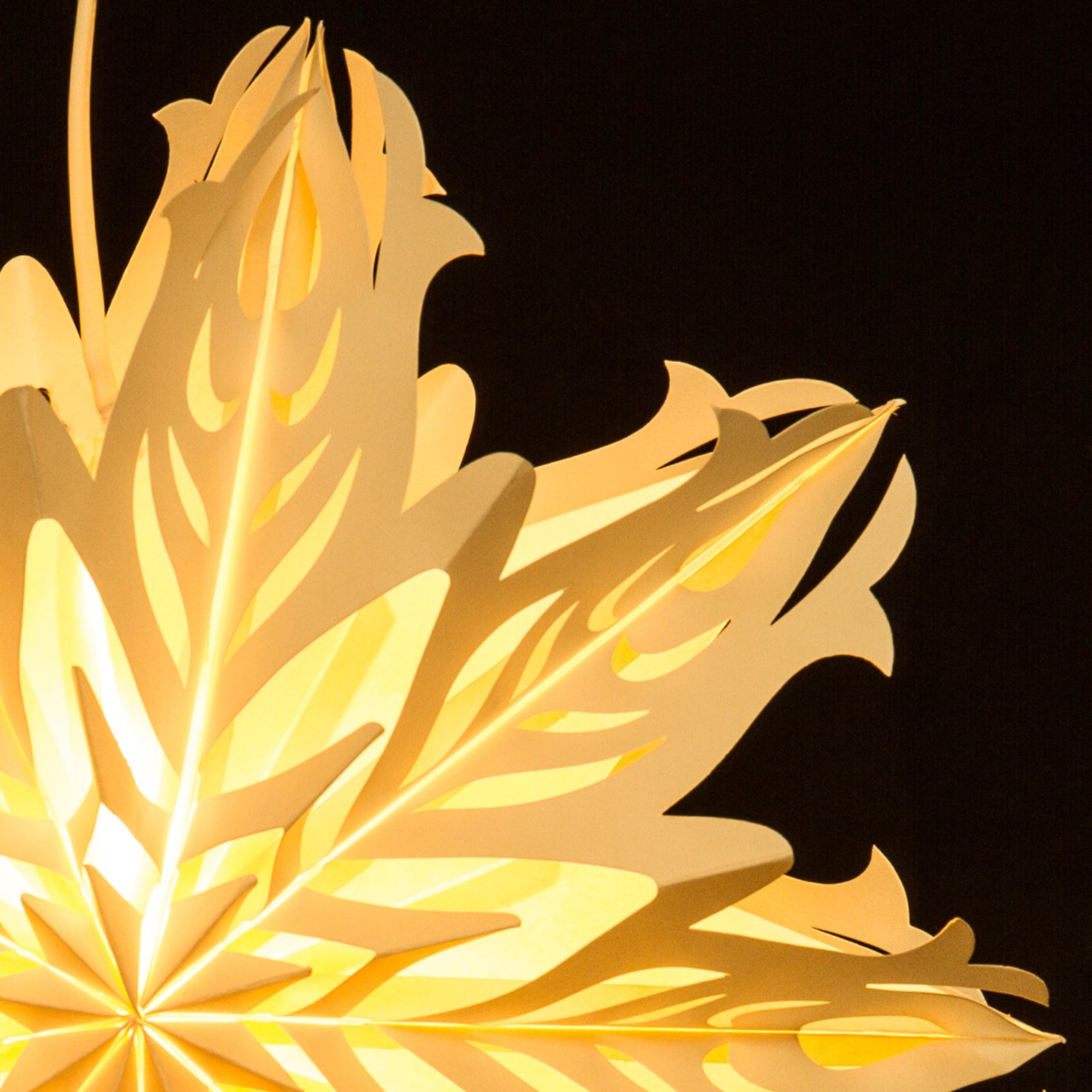 Wunderschöner großer XL Papierstern / EISKRISTALL mit Beleuchtung. Dieser Stern mit Premium Qualität ist in mühevoller Arbeit aus handgeschöpftem naturfarbenem Papier gefertigt. Die Dicke des Papiers ist dabei so gewählt, daß das durch das Leuchtmittel im Inneren des Sterns erzeugte Licht auf besonders angenehme und stimmungsvolle Art durch die Hülle hindurchscheint. Dem Stern liegt ein 4m langes, weißes Kabel mit Stecker, An-/Aus-Schalter, Fassung, ein Leuchtmittel mit Schutzhülle bei. Das Eiskristall hat einen Durchmesser von ca. 42cm und ist auch perfekt als stimmungsvolle Zimmer- Decken oder Wandleuchte für das ganze Jahr geeignet. SIKORA Weihnachtswelt.