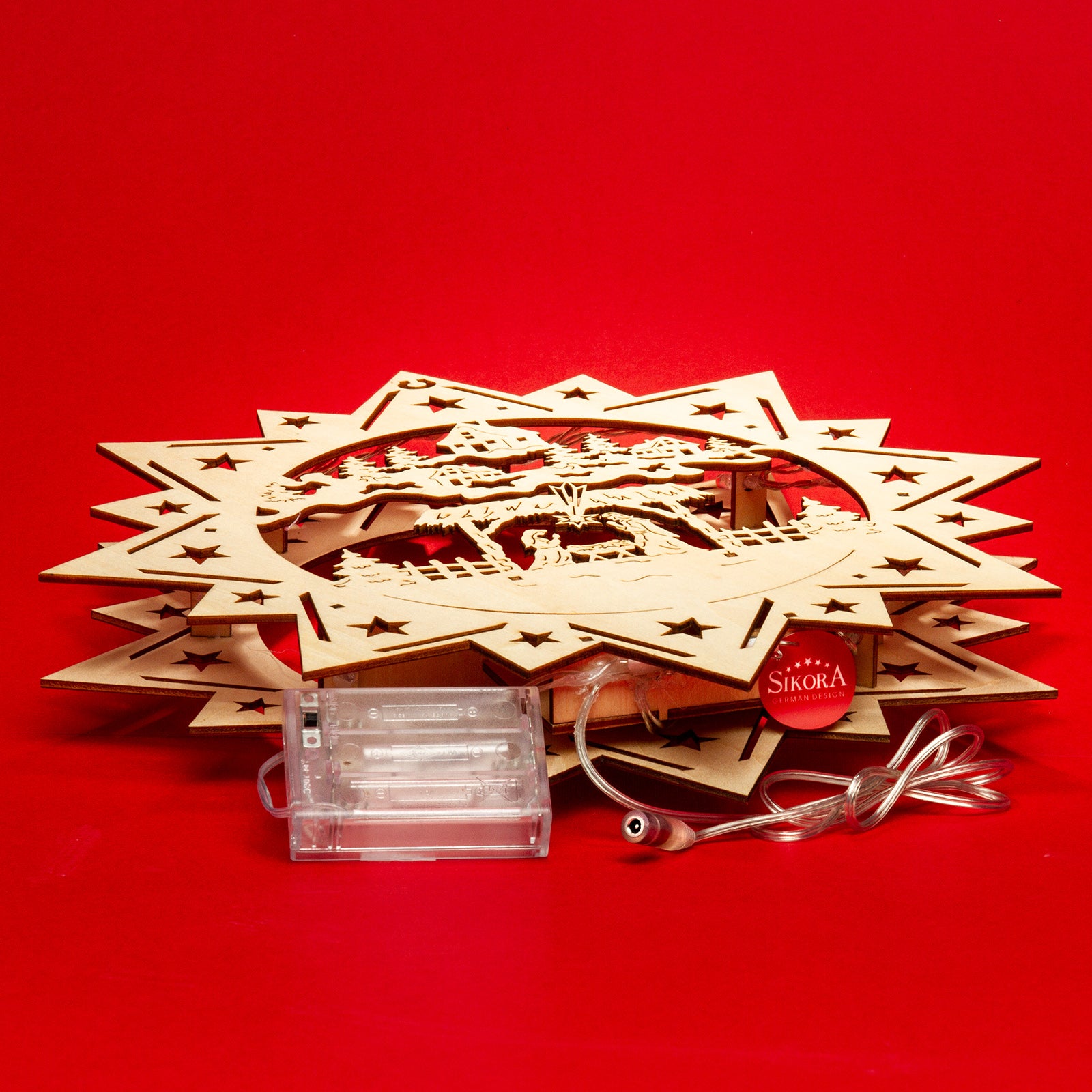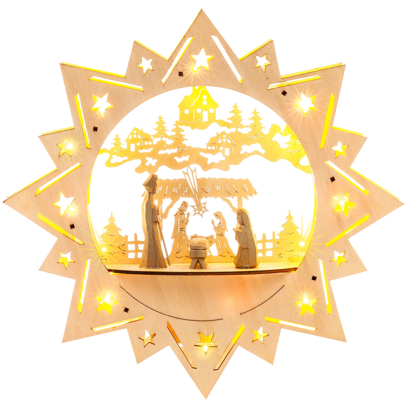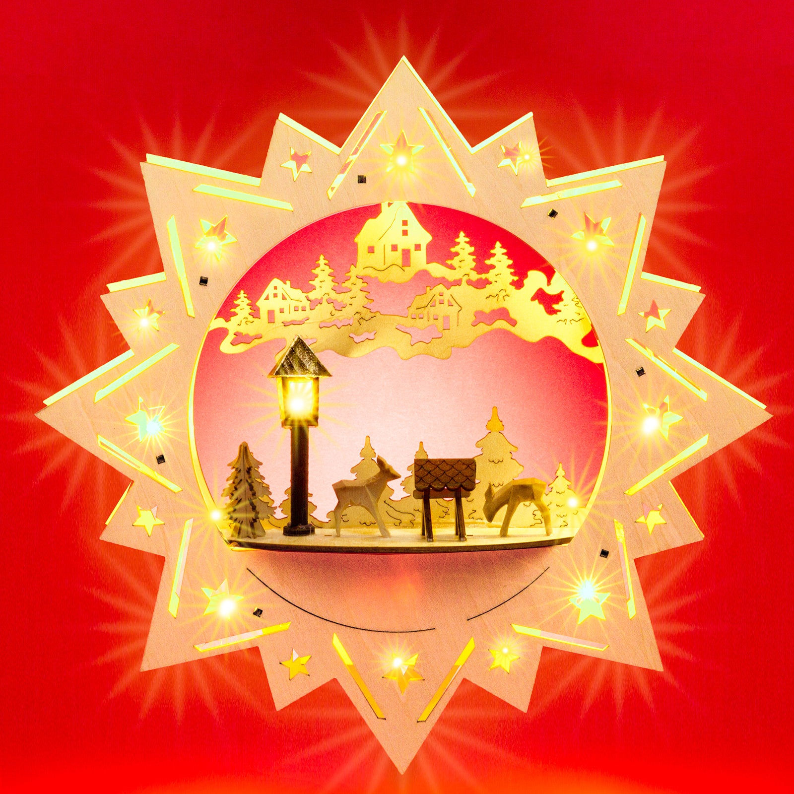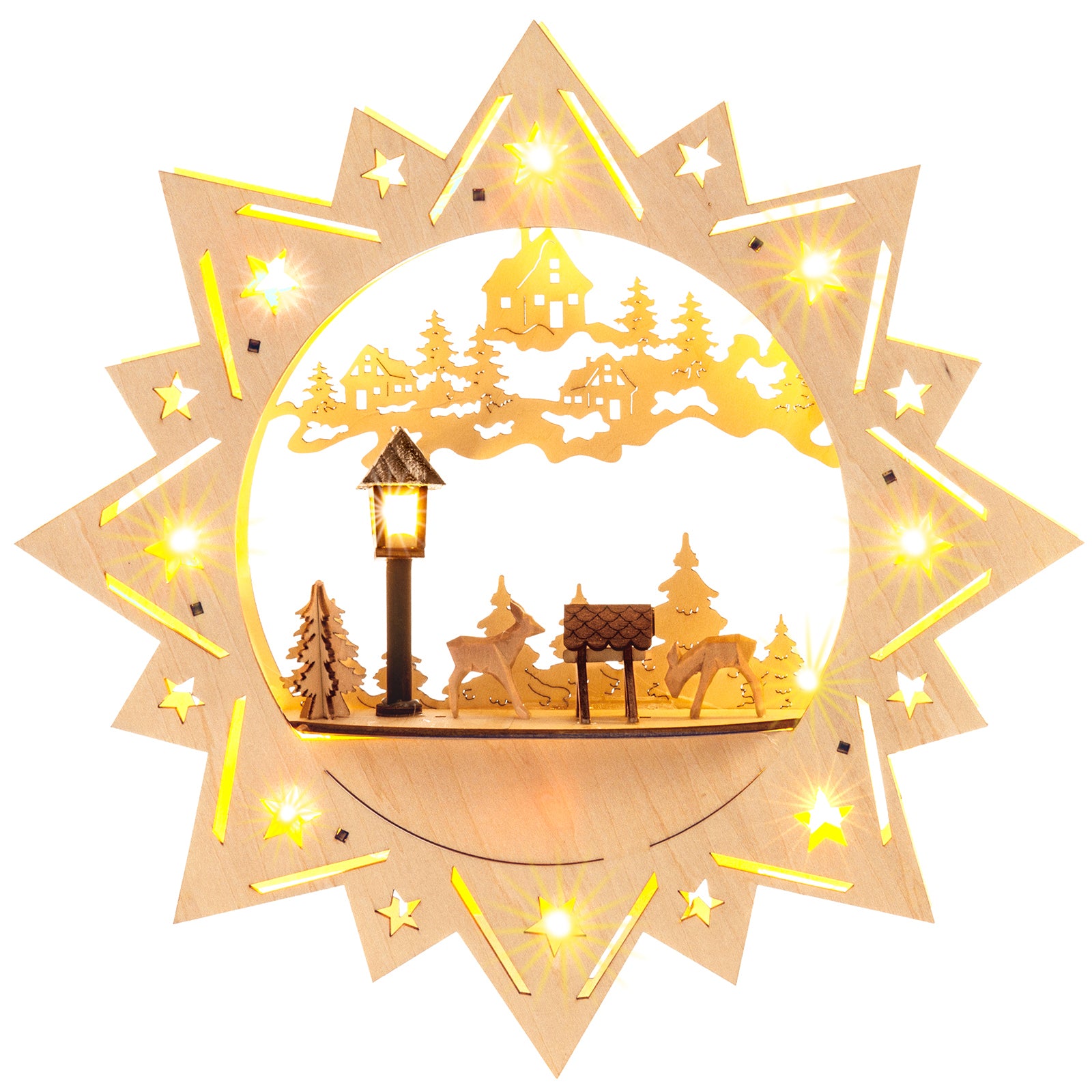 Wunderschönes Holz Fensterbild in drei Ausführungen. Mit seiner innenliegenden, unsichtbar angeordneten LED Beleuchtung verbreitet der Fensterschmuck eine sanfte, weihnachtliche Stimmung. Das Fenstebild kann dauerhaft mit handelsüblichen Batterien betrieben werden. Eine nahegelegene Steckdose oder ein unschönes Kabel wird damit überflüssig. Dank der stromsparenden LED Technologie erreicht die Leuchtdauer mit einem Batteriesatz bis zu 120 Stunden. Natürlich können Sie das Fensterbild aber auch mit Hilfe eines Trafos über die Steckdose betreiben (Trafo nicht im Lieferumfang enthalten). Sie finden den passenden Trafo unter dem Suchbegriff "Sikora Trafo". Die verschiedenen Motive dieses Fensterbildes sind mit handgedrechselten bzw. handgeschnitzten Holzfiguren dekoriert und teilweise mit beleuchteten Laternen versehen. Eine liebevoll aufwändige Arbeit für Ihre Fensterdekoration! Maße ca. 32 x 32 x 7 cm. SIKORA Weihnachtswelt.