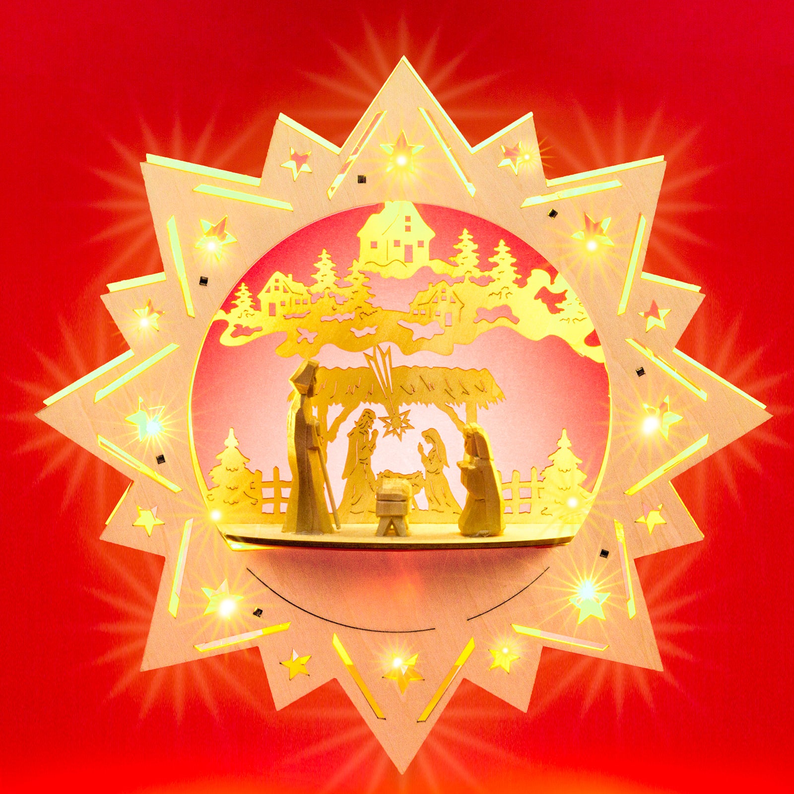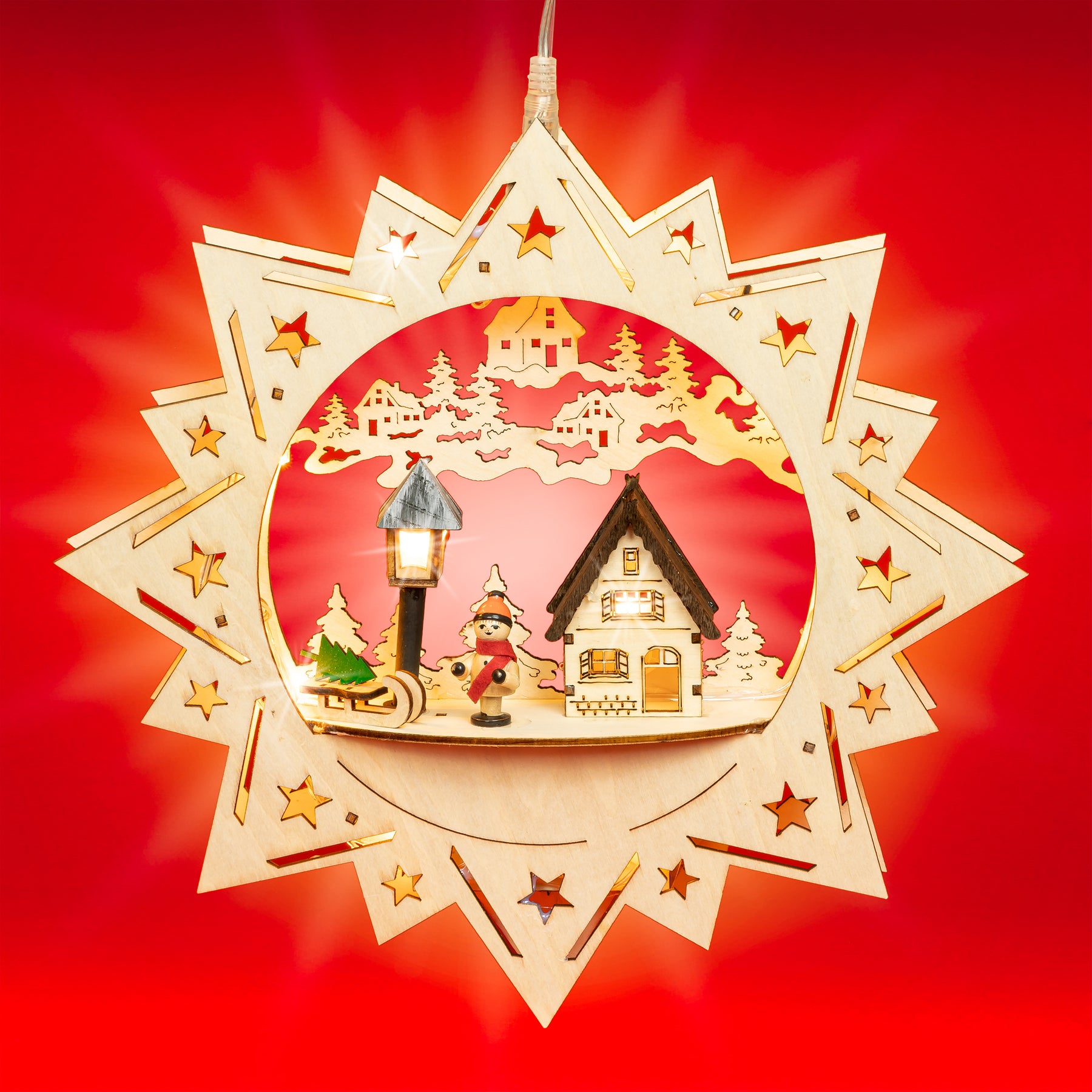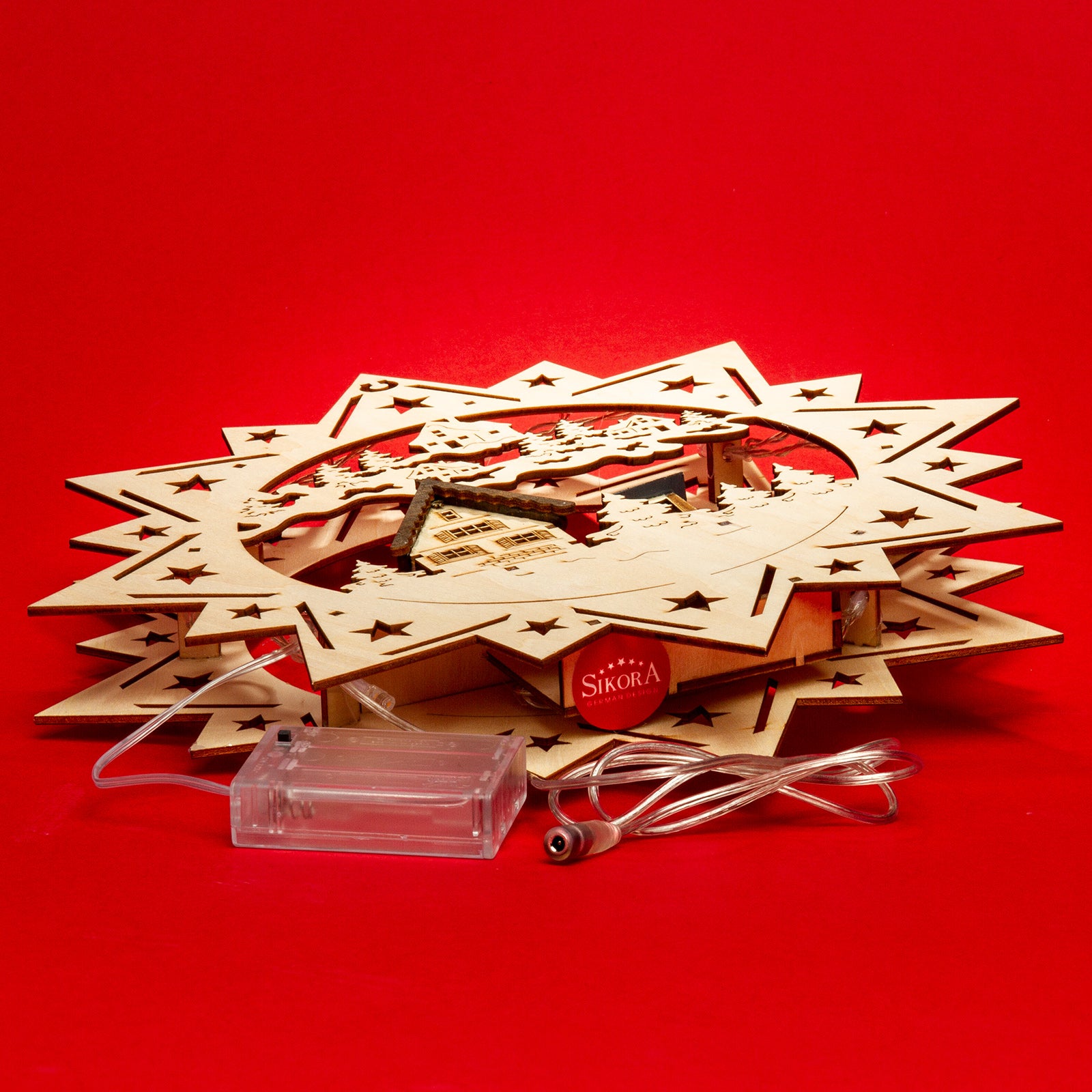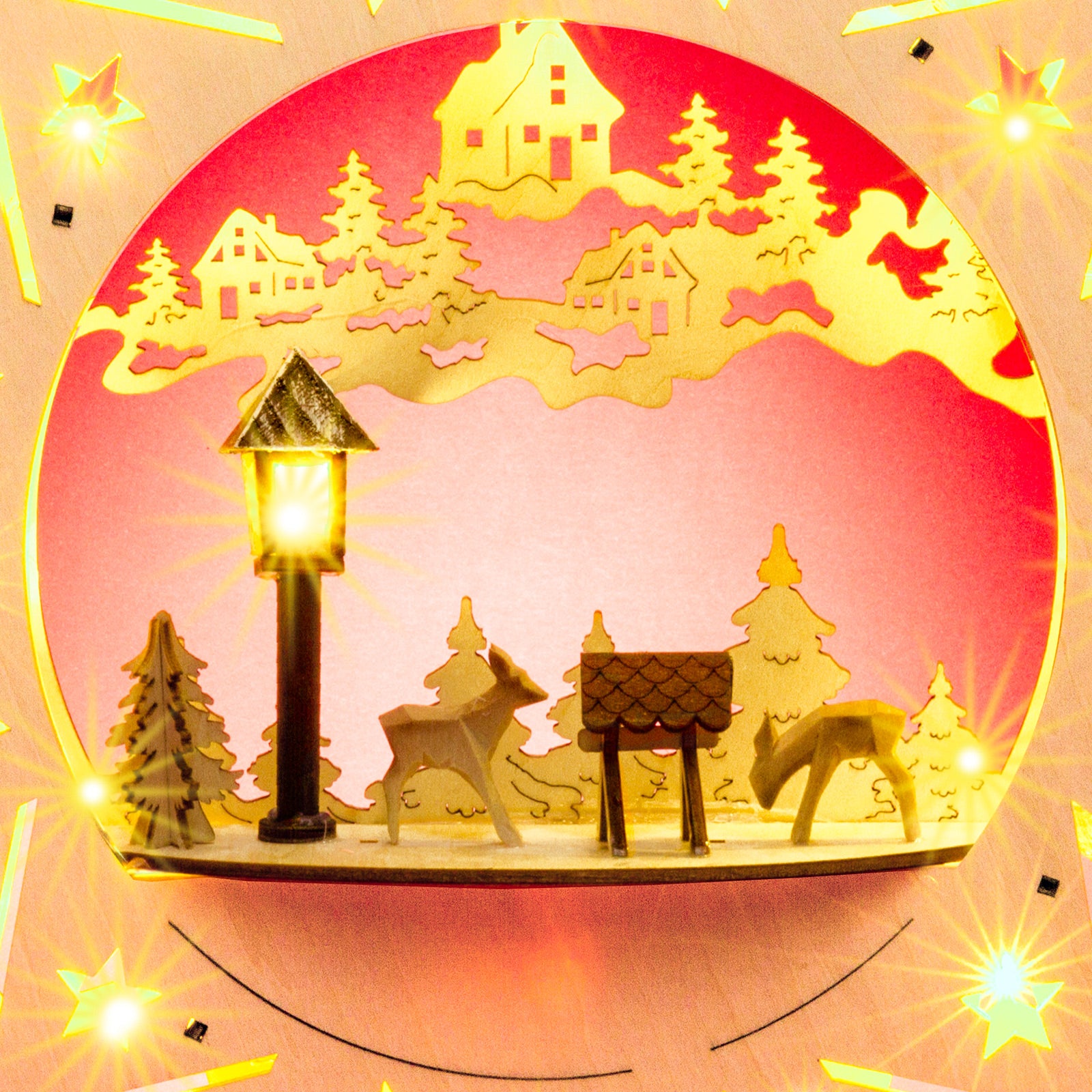 Wunderschönes Holz Fensterbild in drei Ausführungen. Mit seiner innenliegenden, unsichtbar angeordneten LED Beleuchtung verbreitet der Fensterschmuck eine sanfte, weihnachtliche Stimmung. Das Fenstebild kann dauerhaft mit handelsüblichen Batterien betrieben werden. Eine nahegelegene Steckdose oder ein unschönes Kabel wird damit überflüssig. Dank der stromsparenden LED Technologie erreicht die Leuchtdauer mit einem Batteriesatz bis zu 120 Stunden. Natürlich können Sie das Fensterbild aber auch mit Hilfe eines Trafos über die Steckdose betreiben (Trafo nicht im Lieferumfang enthalten). Sie finden den passenden Trafo unter dem Suchbegriff "Sikora Trafo". Die verschiedenen Motive dieses Fensterbildes sind mit handgedrechselten bzw. handgeschnitzten Holzfiguren dekoriert und teilweise mit beleuchteten Laternen versehen. Eine liebevoll aufwändige Arbeit für Ihre Fensterdekoration! Maße ca. 32 x 32 x 7 cm. SIKORA Weihnachtswelt.