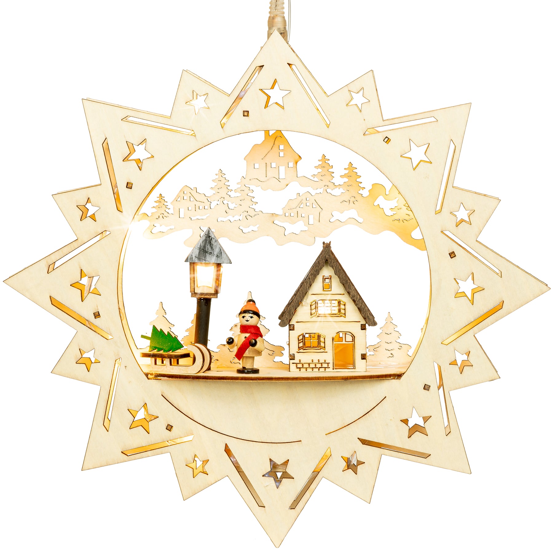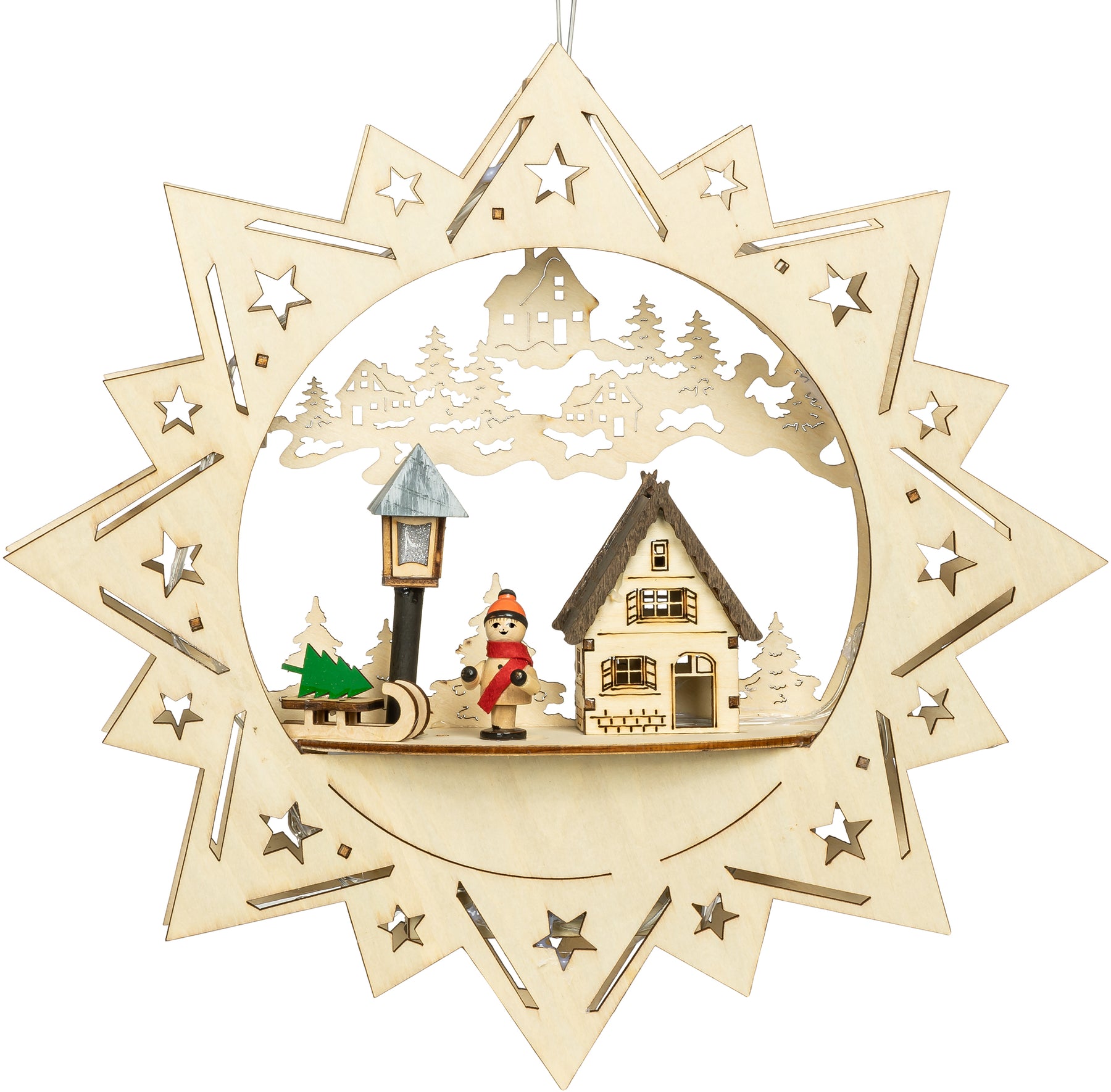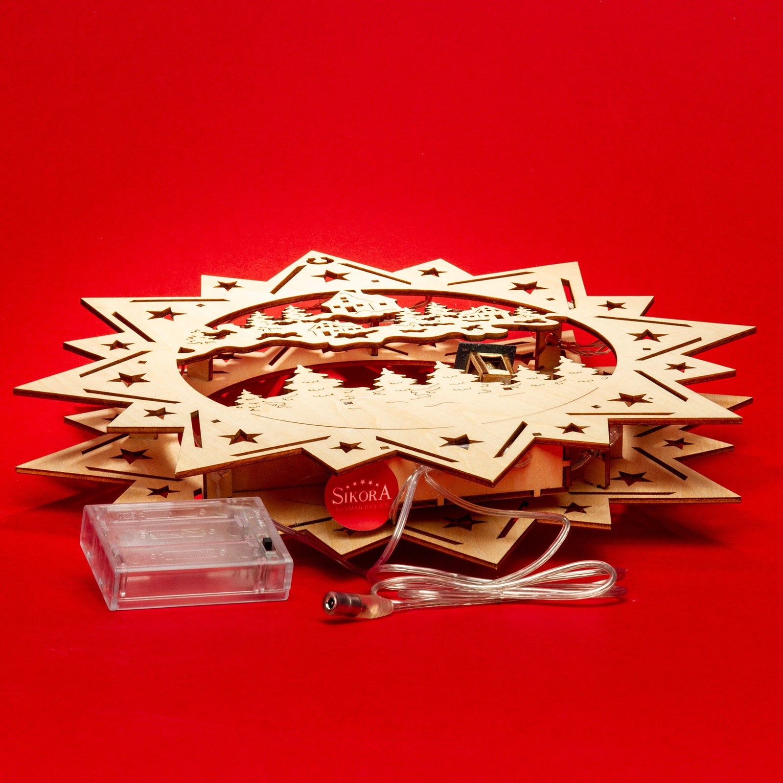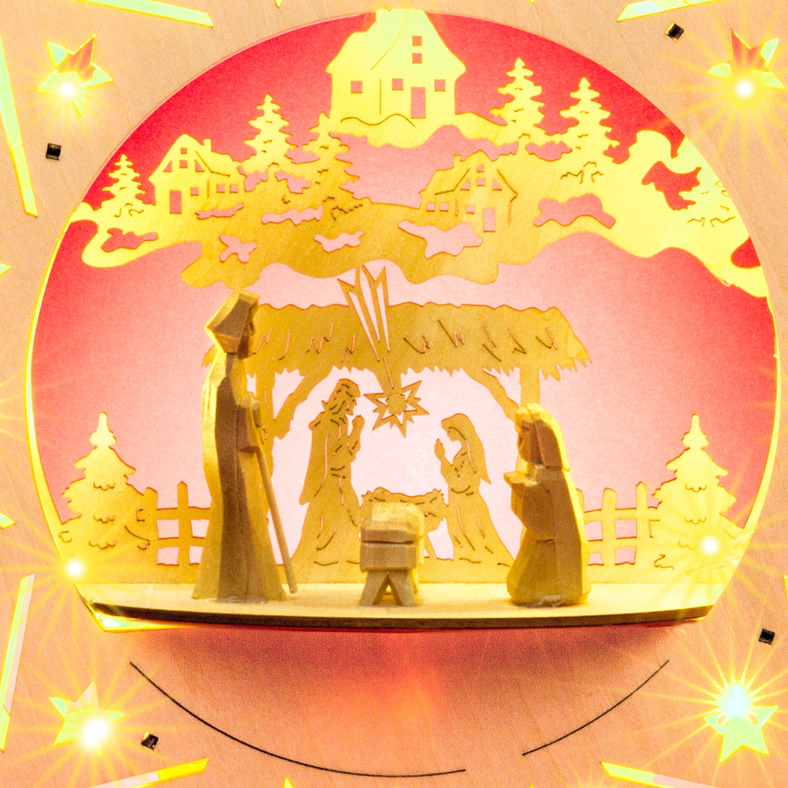 Wunderschönes Holz Fensterbild in drei Ausführungen. Mit seiner innenliegenden, unsichtbar angeordneten LED Beleuchtung verbreitet der Fensterschmuck eine sanfte, weihnachtliche Stimmung. Das Fenstebild kann dauerhaft mit handelsüblichen Batterien betrieben werden. Eine nahegelegene Steckdose oder ein unschönes Kabel wird damit überflüssig. Dank der stromsparenden LED Technologie erreicht die Leuchtdauer mit einem Batteriesatz bis zu 120 Stunden. Natürlich können Sie das Fensterbild aber auch mit Hilfe eines Trafos über die Steckdose betreiben (Trafo nicht im Lieferumfang enthalten). Sie finden den passenden Trafo unter dem Suchbegriff "Sikora Trafo". Die verschiedenen Motive dieses Fensterbildes sind mit handgedrechselten bzw. handgeschnitzten Holzfiguren dekoriert und teilweise mit beleuchteten Laternen versehen. Eine liebevoll aufwändige Arbeit für Ihre Fensterdekoration! Maße ca. 32 x 32 x 7 cm. SIKORA Weihnachtswelt.