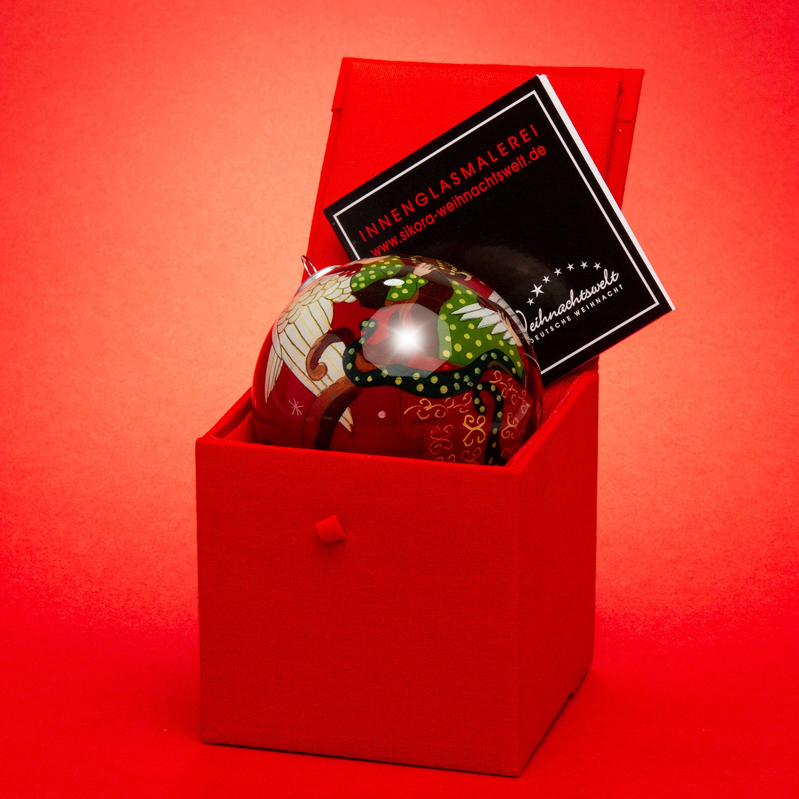 Mit Hilfe eines gebogenen Pinsels werden unsere Glaskugeln durch das obere kleine Loch einzeln mit der Hand von innen bemalt. Diese uralte Tradition der Innenglasmalerei entstammt der nordchinesischen Provinz Hebei, wo Bauersfamilien schon seit Jahrhunderten kleine Schnupftabakfläschchen aufwändig von innen bemalen. Und noch heute werden unsere von Innen bemalten Kugeln vornehmlich in Heimarbeit und in den ernteschwachen Wintermonaten von Familienmitgliedern bemalt. Dabei fertigt jede Künstlerin nur wenige Motive, die sie dann perfekt beherrscht und nahezu fehlerfrei malt. Wir haben diese Tradition nun in die bei uns Europäern beliebten runden Glaskugeln transformiert, die sich ideal als ausgefallener Baumschmuck oder auch als kleines, besonderes Geschenk eignen. Auch bei Sammlern sind die kleinen Kunstwerke beliebte Objekte. Wie bei der Hinterglasmalerei werden zunächst die Konturen mit dunklen Farben aufgetragen und diese dann im Folgenden mit halbtransparenten oder deckenden Farben von hell nach dunkel ausgemalt, also genau in gegenteiliger Reihenfolge wie bei der gewöhnlichen Malerei. Durch den Farbauftrag von innen behält die Glaskugel ihren Oberflächenglanz und die Farben erhalten eine ganz besondere Sättigung und Tiefe. Unsere Glaskugeln sind erhältlich in vielen verschiedenen Motiven und 2 Größen mit Kugeldurchmessern von 7,5 und 10 cm. Jede einzelne Kugel ist in einem mit Stoff bezogenem Kästchen geborgen und es liegt ein Zertifikat bei. SIKORA Weihnachtswelt.