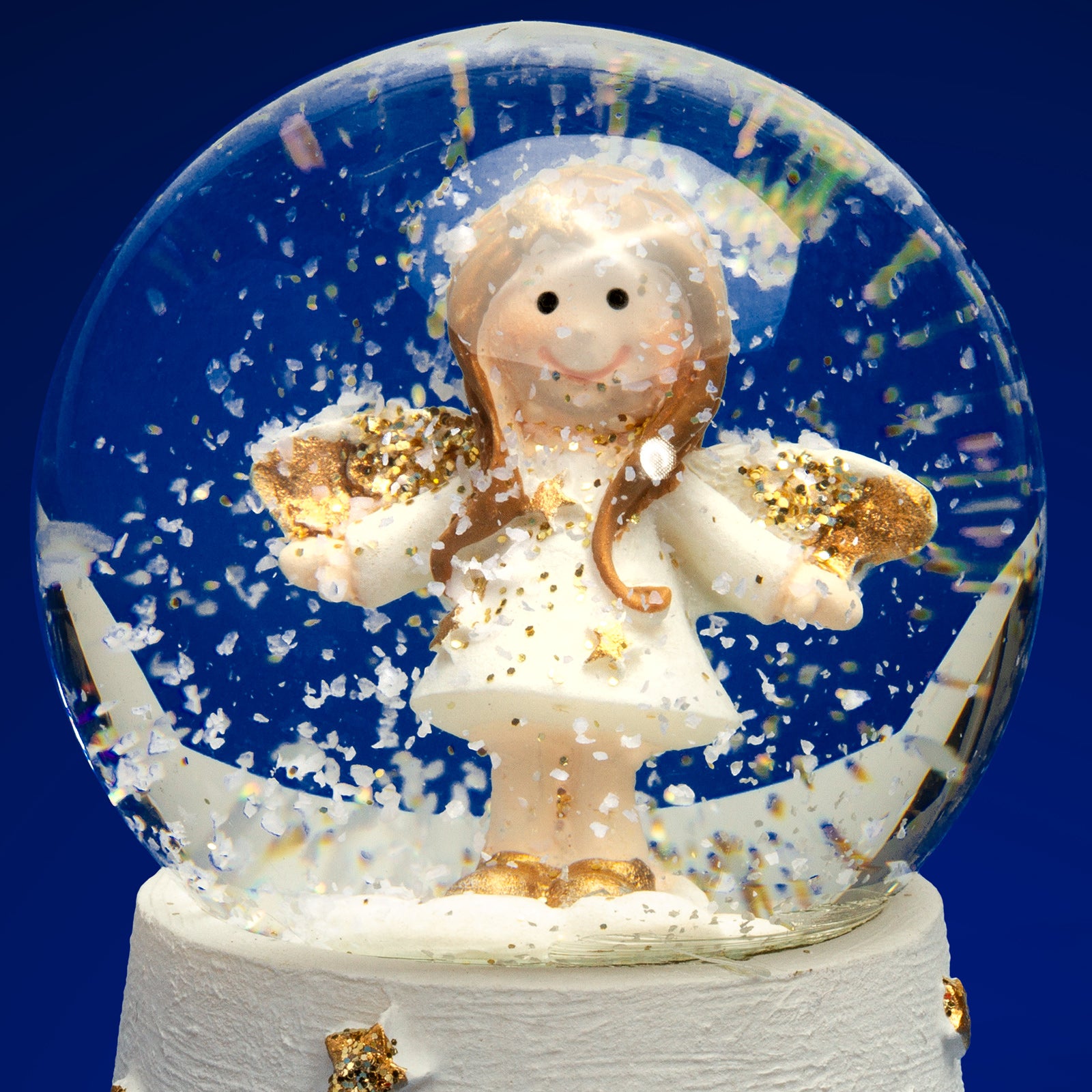 Kleine Schneekugel mit einem Glasdurchmesser von ca. 45 mm. Mit dem wunderschönen Engelmotiv in schlichtem Weiß und Gold ist dieses kleine Kunstwerk perfekt für leuchtende Mädchenaugen. In der Flüssigkeit der Glaskugel befinden sich kleine künstliche Schneeflocken, die beim und nach dem Schütteln der Kugel für eine ordentliches Schneegestöber sorgen. Der liebevoll von Hand bemalte und verzierte Sockel besteht aus Gießkeramik, einer Mischung aus Steinmehl und synthetischen, bindenden Anteilen. So können die zahlreichen Details und Formen bestens gestaltet werden. Ein kleines Kunstwerk von SIKORA Weihnachtswelt.