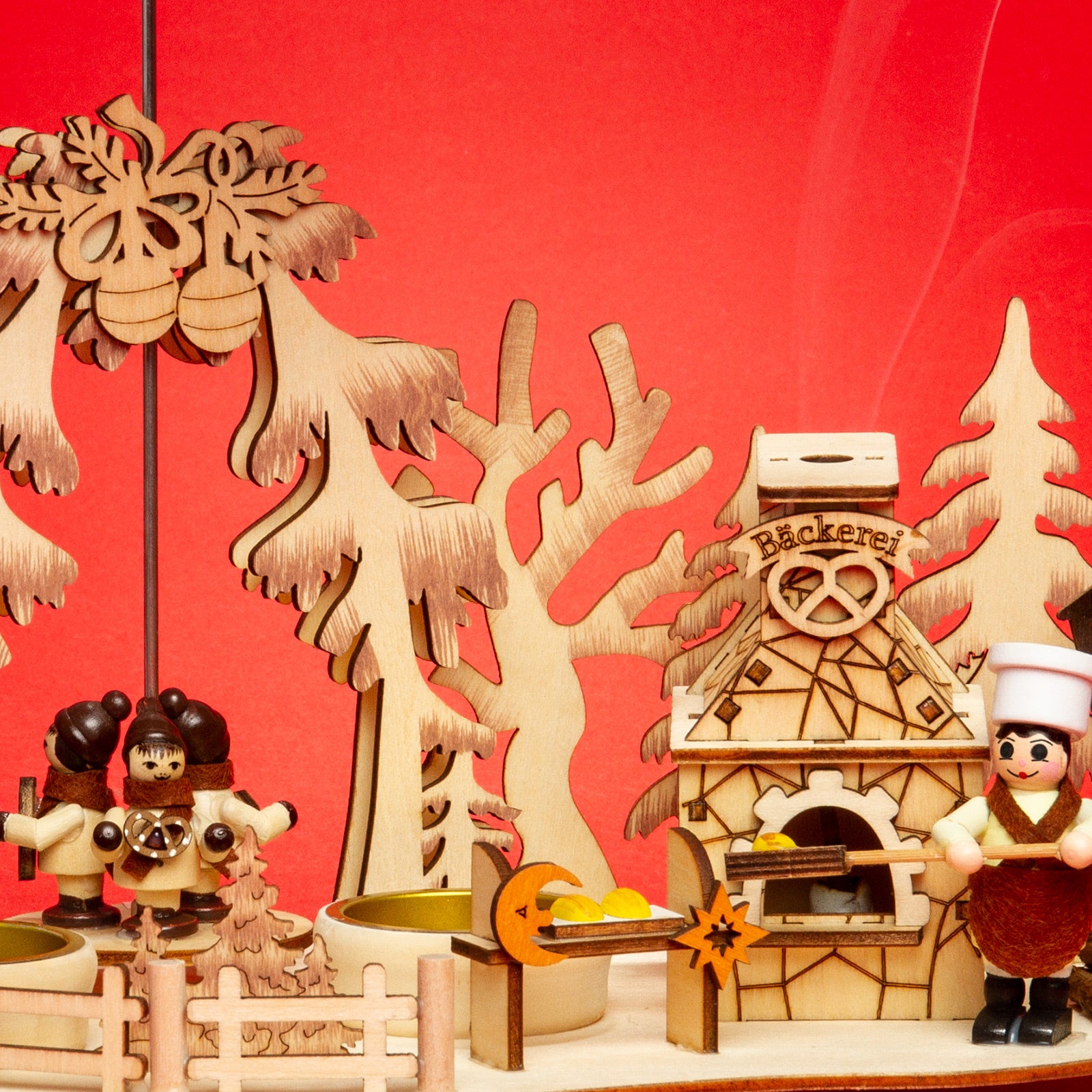 Wunderschöne, kompakte Teelicht Weihnachtspyramide aus hochwertigem Birken Sperrholz. Mit funktionsfähigem bzw. rauchendem Backofen (Räuchermännchen). Diese 2-in-1 Weihnachtspyramide bringt nicht nur Kinderaugen zum Leuchten... Die sich durch den warmen Kerzenschein langsam drehende Pyramide, bestückt mit bunt bemalten Figuren verbreitet eine angenehm ruhige, weihnachtliche Stimmung. Die Pyramide ist zur praktischen Benutzung mit 3 Teelichtern vorgesehen (nicht im Lieferumfang enthalten). Neben der Pyramide steht der Backofen welcher als Räuchermännchen benutzt werden kann indem man einen kleinen Räucherkegel hineinstellt. Die Pyramide hat eine Höhe von ca. 23 cm. SIKORA Weihnachtswelt.