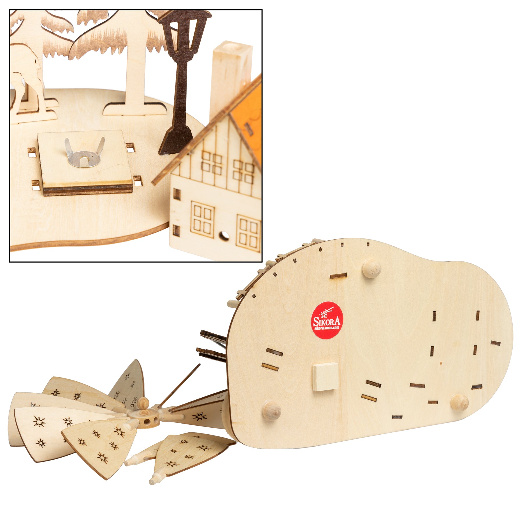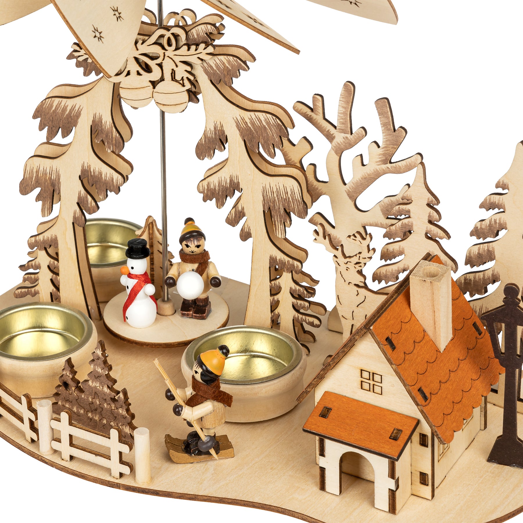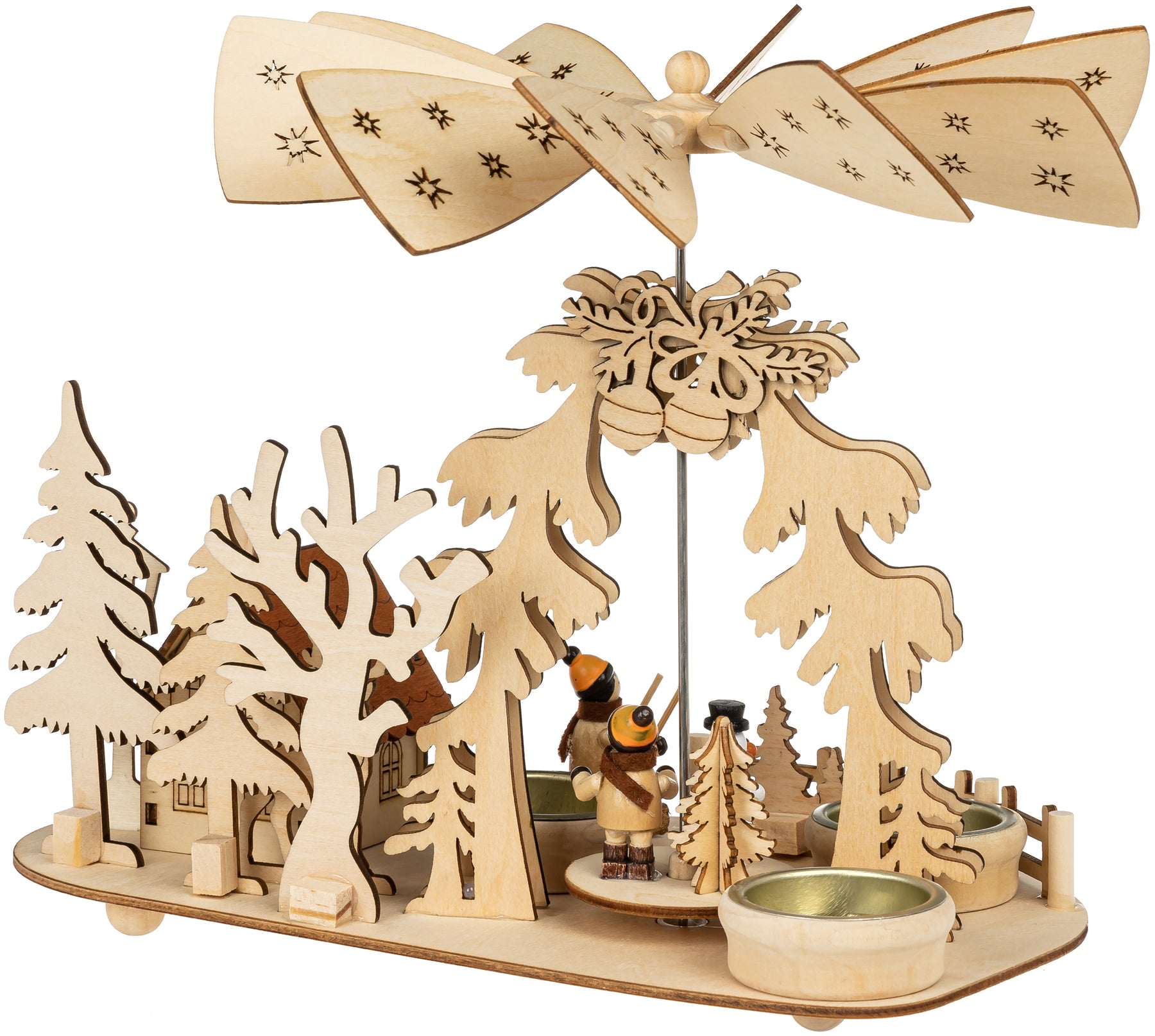 Wunderschöne, kompakte Teelicht Weihnachtspyramide aus hochwertigem Birken Sperrholz. Mit funktionsfähigem bzw. rauchendem Haus (Räuchermännchen). Diese 2-in-1 Weihnachtspyramide bringt nicht nur Kinderaugen zum Leuchten... Die sich durch den warmen Kerzenschein langsam drehende Pyramide, bestückt mit bunt bemalten Figuren verbreitet eine angenehm ruhige, weihnachtliche Stimmung. Die Pyramide ist zur praktischen Benutzung mit 3 Teelichtern vorgesehen (nicht im Lieferumfang enthalten). Neben der Pyramide steht die Hütte welcher als Räuchermännchen benutzt werden kann indem man einen kleinen Räucherkegel hineinstellt. Die Pyramide hat eine Höhe von ca. 23 cm.
