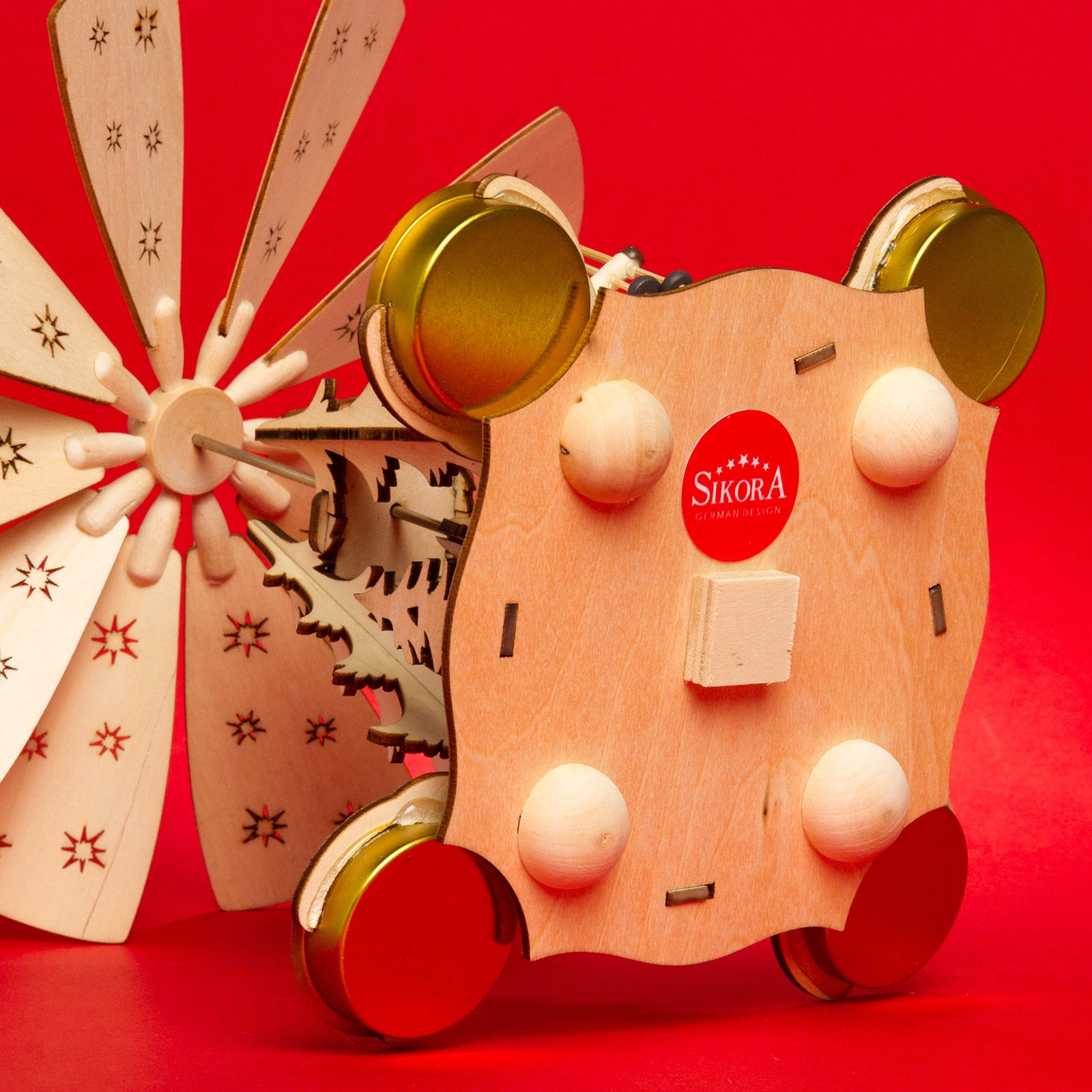 Durch den Schein von vier handelsüblichen Teelichtern (nicht im Lieferumfang enthalten) beginnen sich die Flügel sanft zu drehen und versetzen die kleine Winter-Szene mit Schneemann und Kindern in Bewegung. Das Zusammenspiel von Holzkunst und Kerzenschein sorgt für ein stimmungsvolles Ambiente, das Kinder wie Erwachsene gleichermaßen begeistert.
