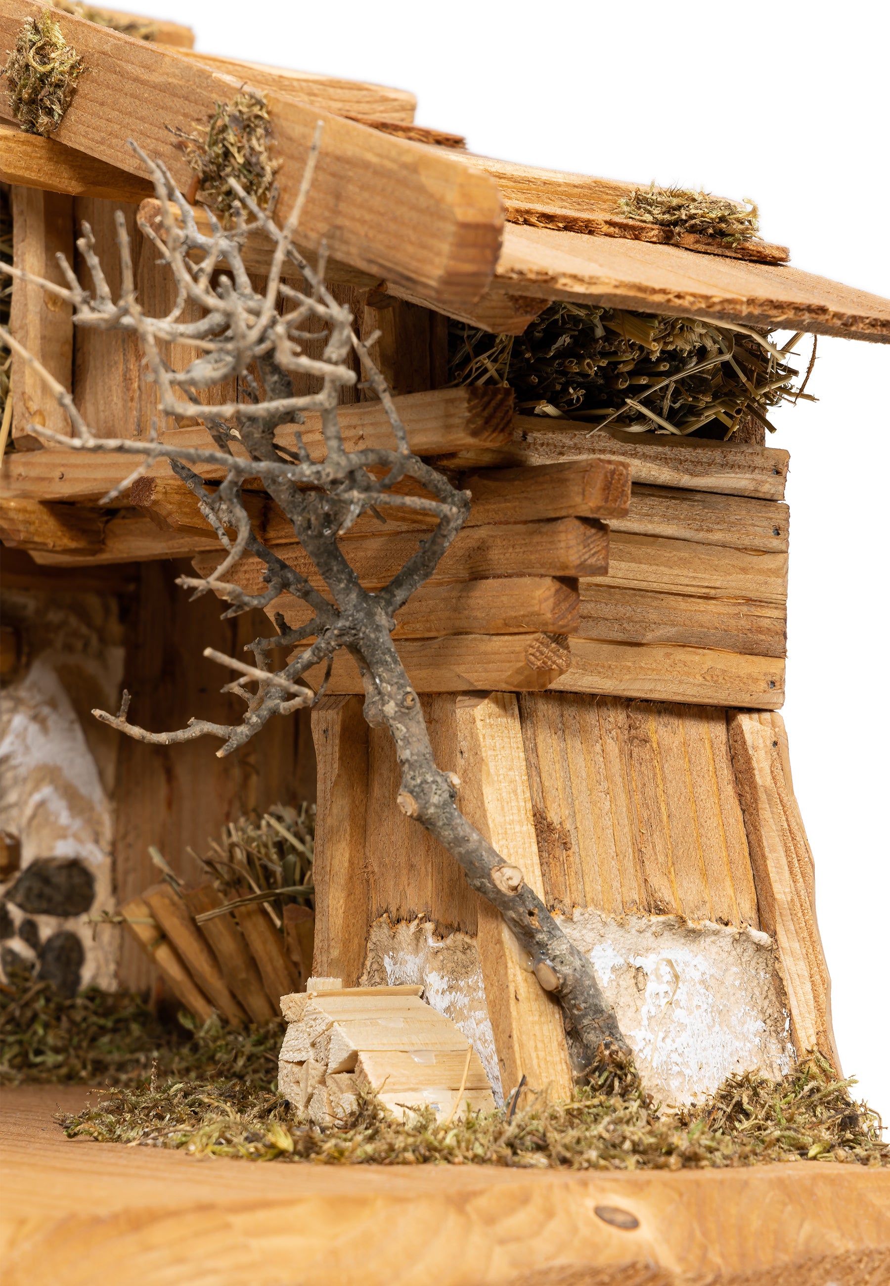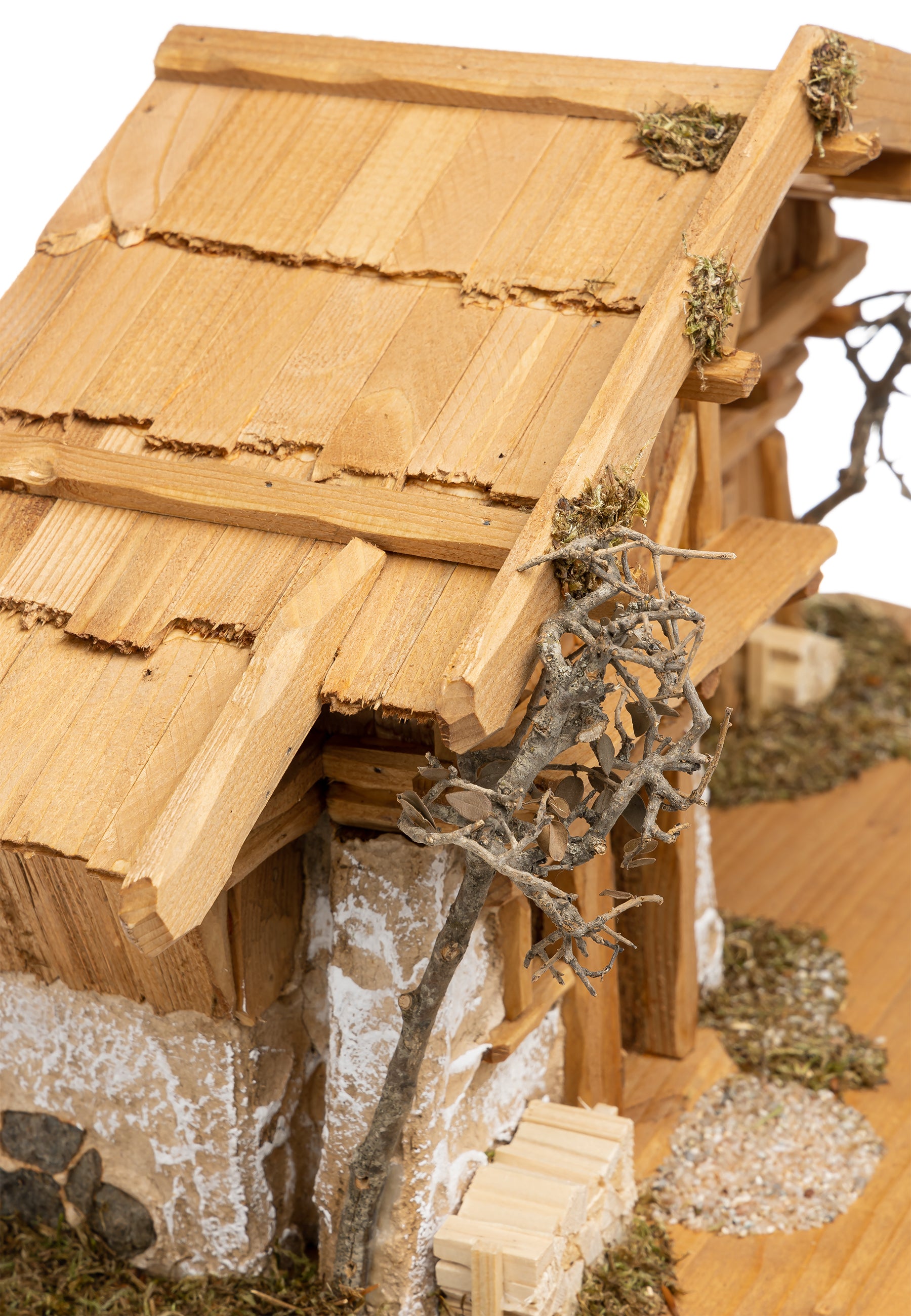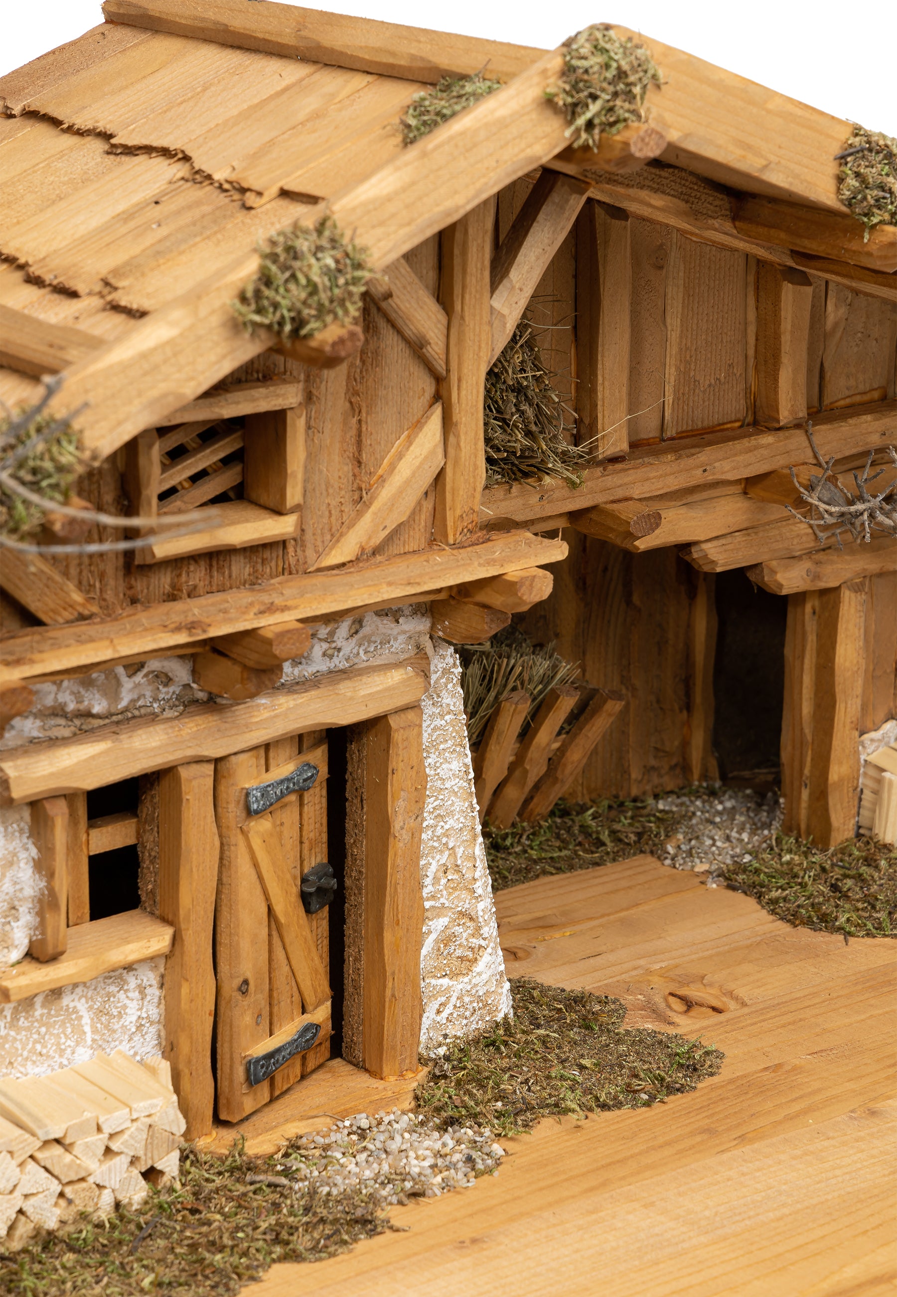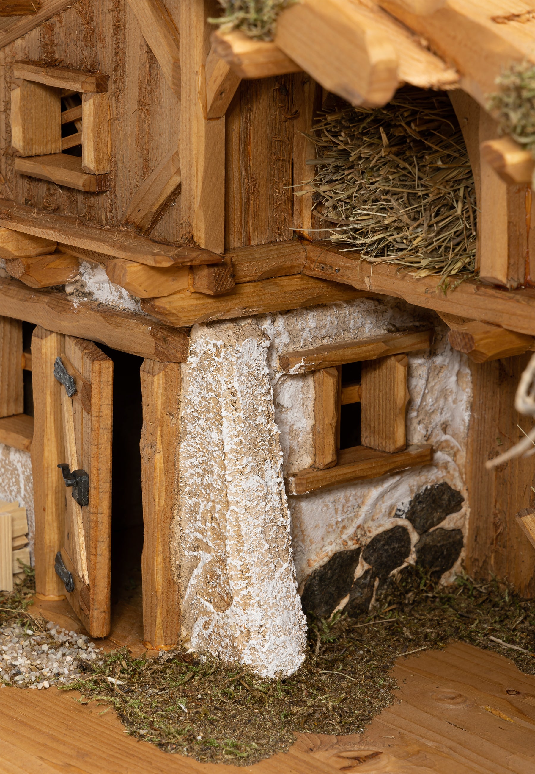 Dieser Stall wurde mit viel Liebe zum Detail in sorgfältiger Handarbeit hergestellt. Dank seiner realistischen Gestaltung ist er ideal geeignet, um eine authentische, heimatliche Weihnachtsdarstellung zu schaffen.