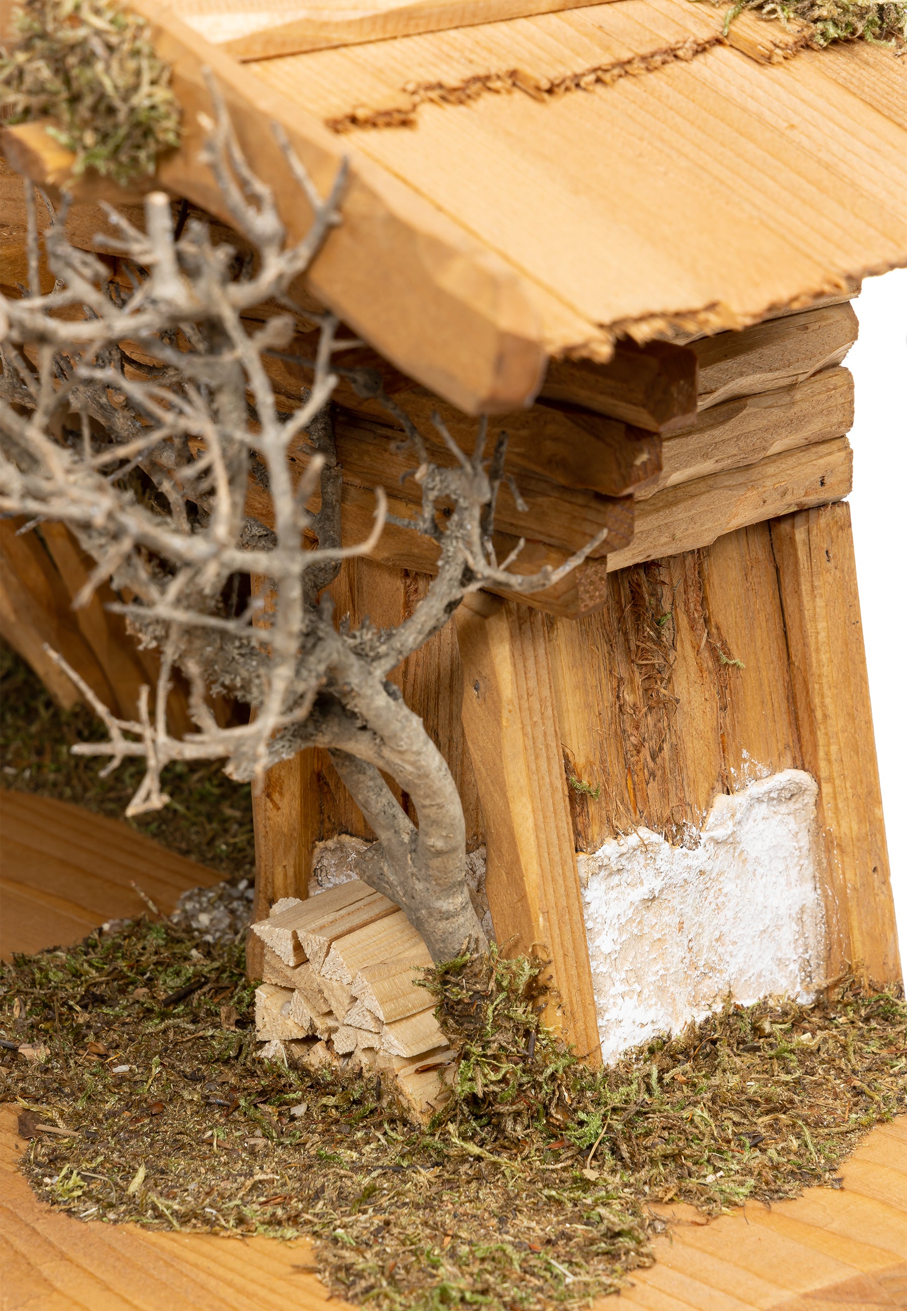 Lassen Sie sich von der Schönheit des Krippenstalls „Bozen“ begeistern – einem meisterhaft gefertigten Stück, das den Charme traditioneller Weihnachtskrippen aufgreift. Mit seiner kunstvollen Verarbeitung aus massivem Fichtenholz und der gebeizten Holzstruktur zieht dieser Stall sofort die Blicke auf sich. Die Vorderseite ist mit Krippenmörtel verputzt, was ihm eine rustikale und heimelige Ausstrahlung verleiht. Der Stall wird liebevoll mit Sand und Moos dekoriert und zeigt viele kleine Details wie eine Futterraufe, Bäumchen und Holzstapel – ein wahres Meisterwerk der Handwerkskunst!
