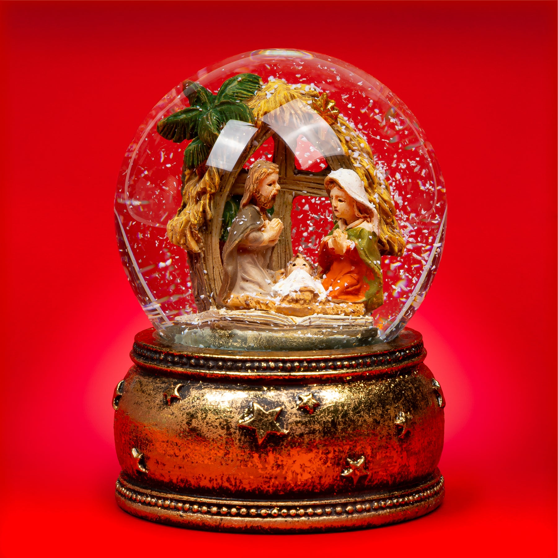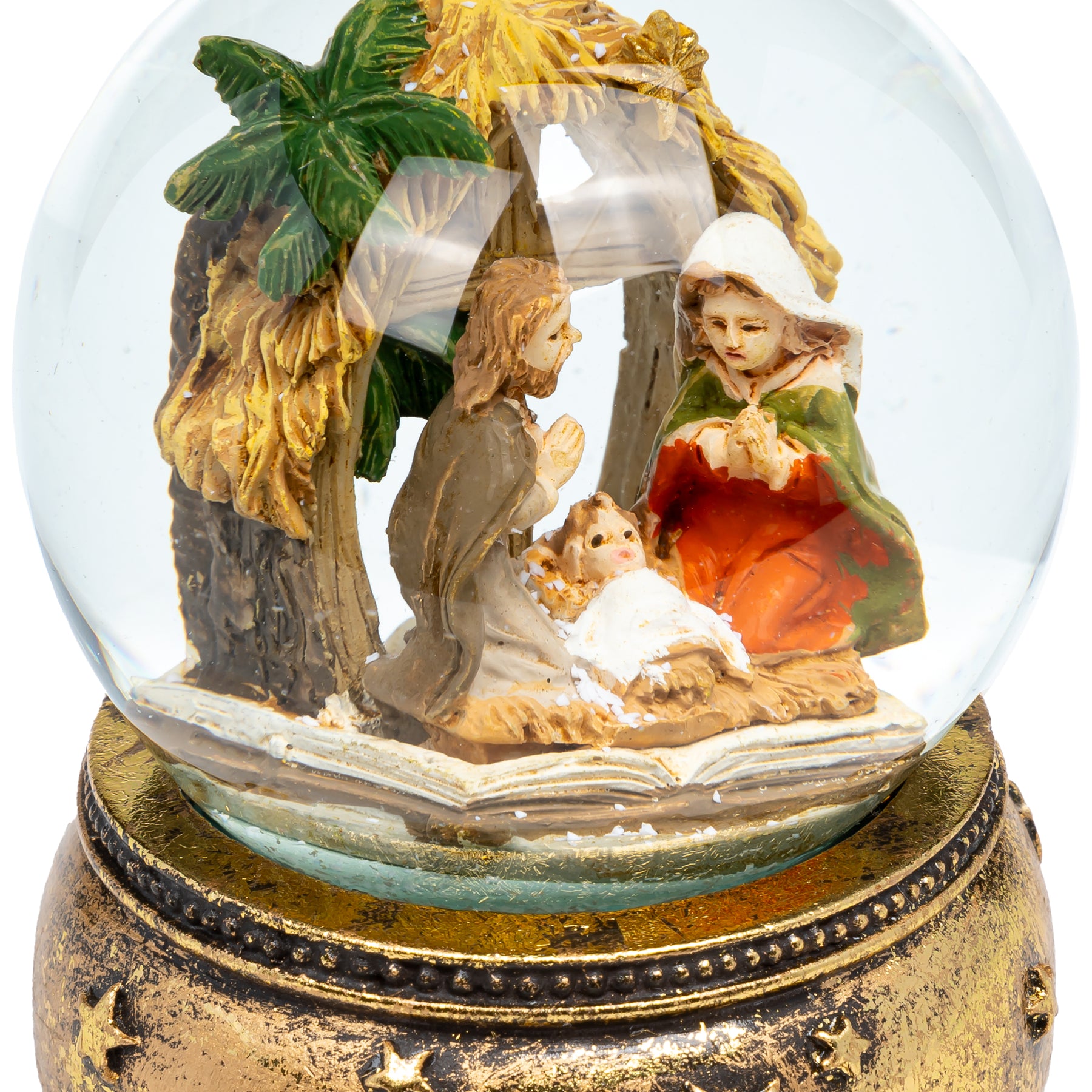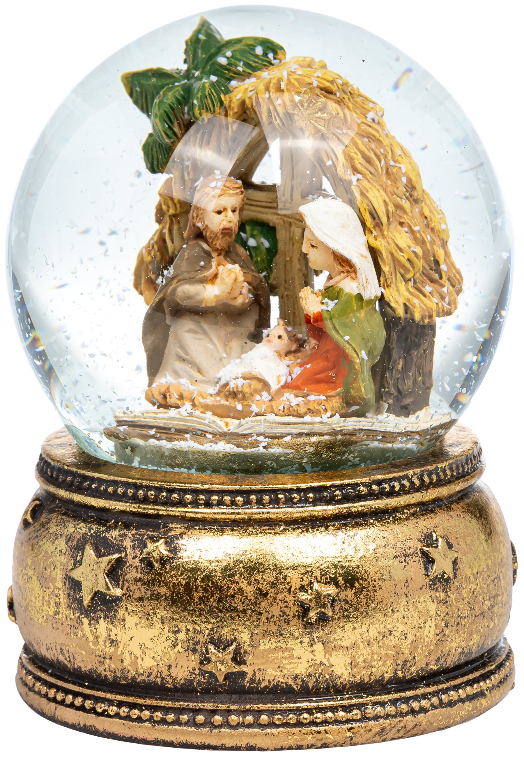 Mittelgroße Schneekugel mit einem Glasdurchmesser von ca. 65 mm. Mit dem "Heilige Familie" Motiv ist dieses kleine Kunstwerk perfekt für leuchtende Kinderaugen. In der Flüssigkeit der Glaskugel befinden sich kleine künstliche Schneeflocken, die beim und nach dem Schütteln der Kugel für eine ordentliches Schneegestöber sorgen. Der liebevoll von Hand bemalte und verzierte Sockel besteht aus Gießkeramik, einer Mischung aus Steinmehl und synthetischen, bindenden Anteilen. So können die zahlreichen Details und Formen bestens gestaltet werden. Ein kleines Kunstwerk von SIKORA Weihnachtswelt.