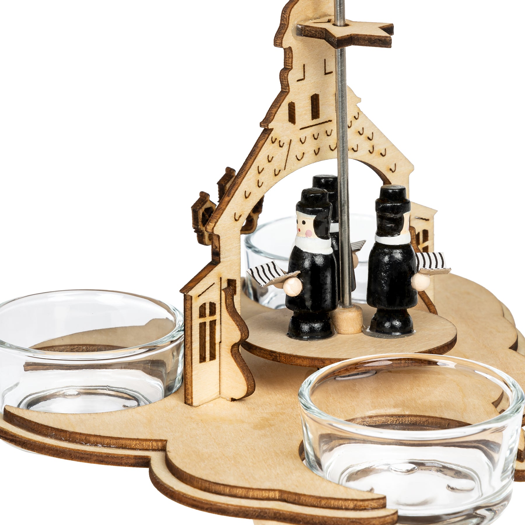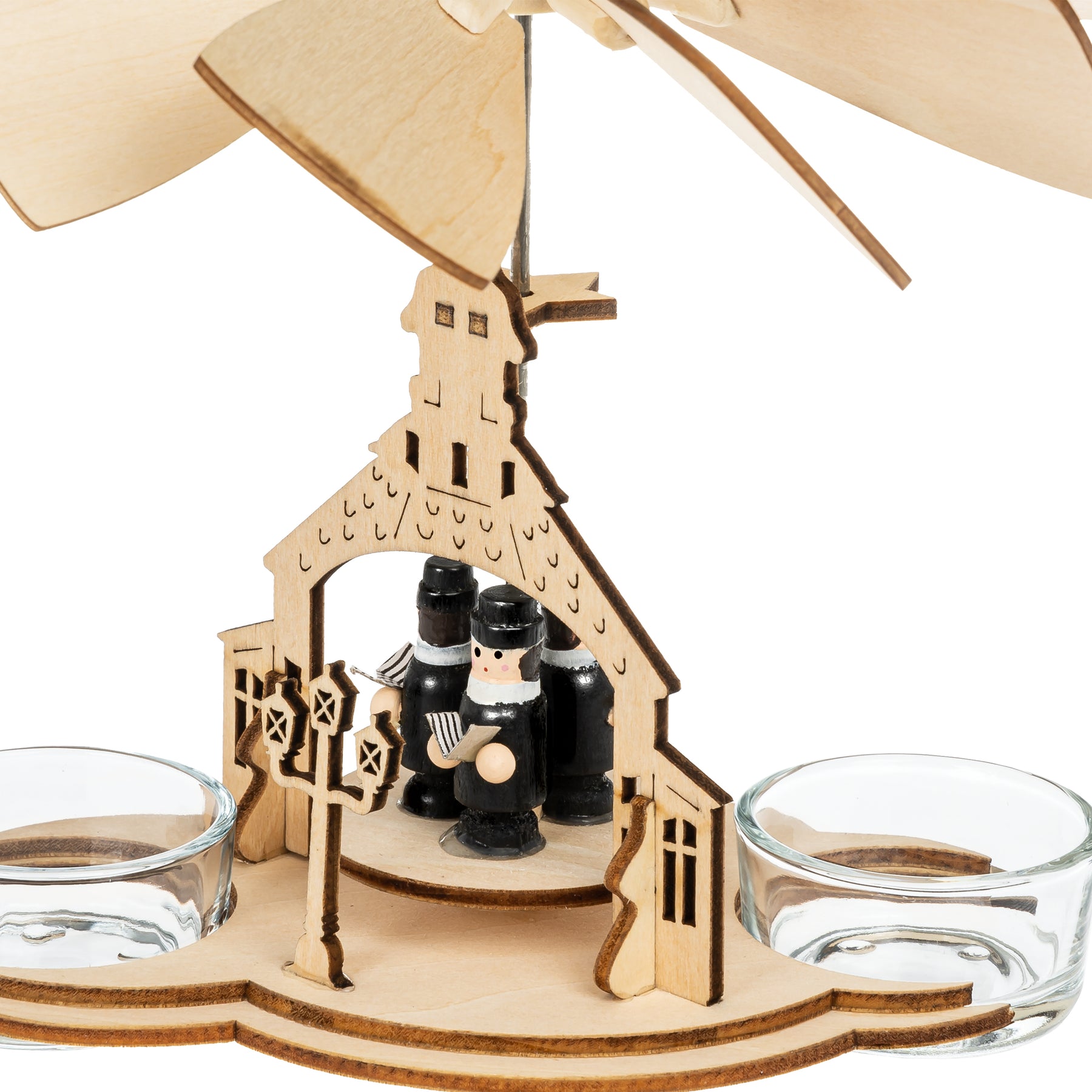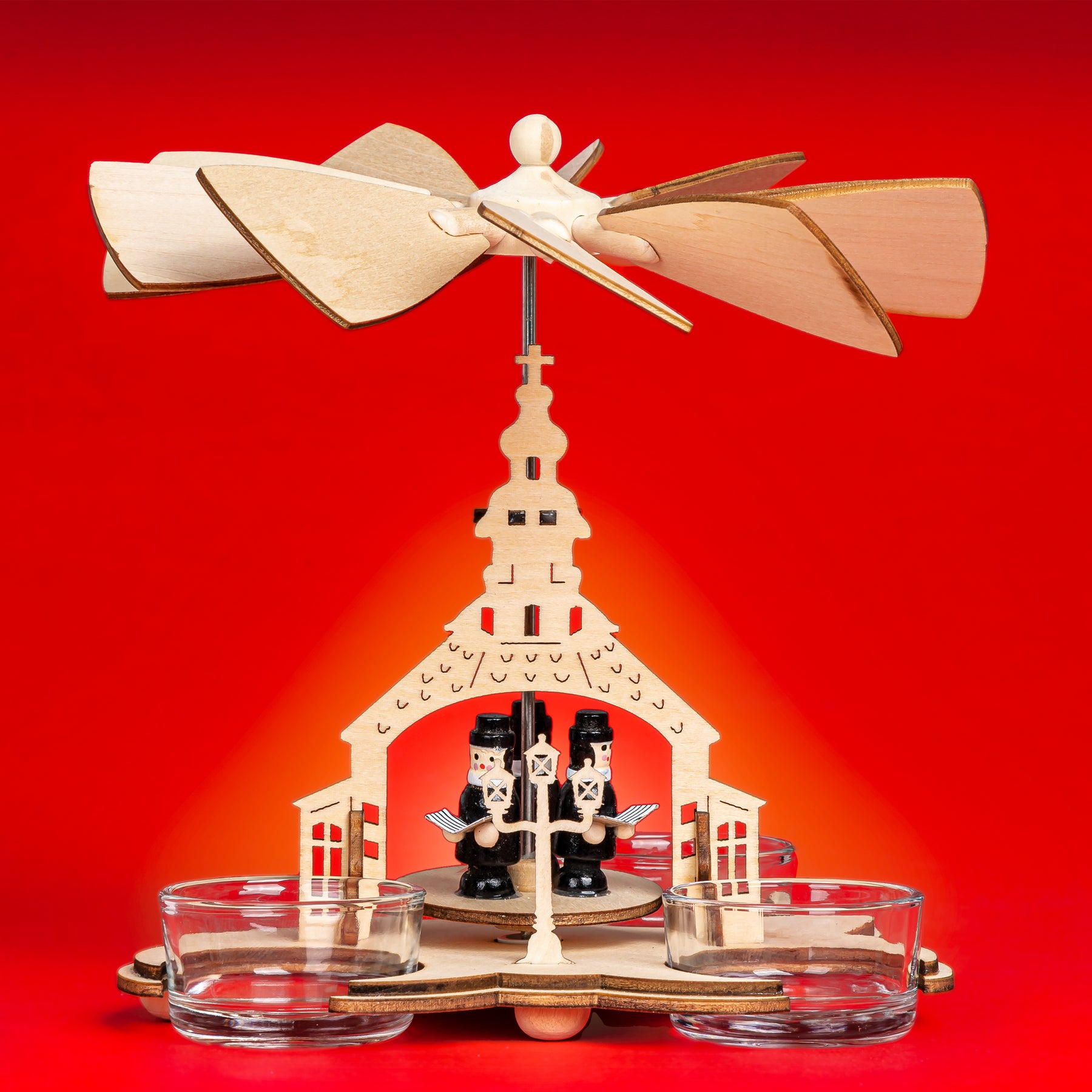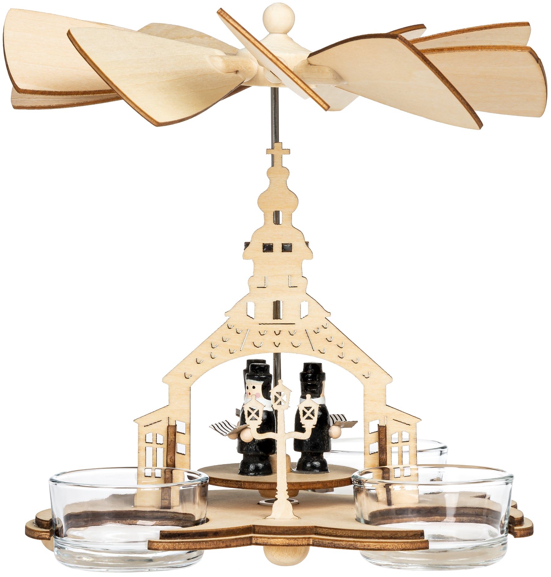 Unsere wunderschöne Weihnachtspyramide aus hellem Holz bringt festliche Bewegung und traditionellen Charme in dein Zuhause. Sie ist in zwei Varianten erhältlich - mit zwei oder drei Teelichthaltern - und zeigt eine liebevoll gestaltete Szenerie mit musizierenden Figuren vor der Seiffener Kirche. Durch die aufsteigende Wärme der Teelichter setzt sich das Flügelrad sanft in Bewegung und lässt die Plattform mit den Figuren rotieren.