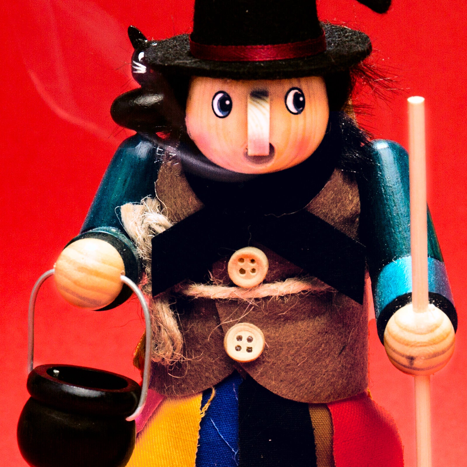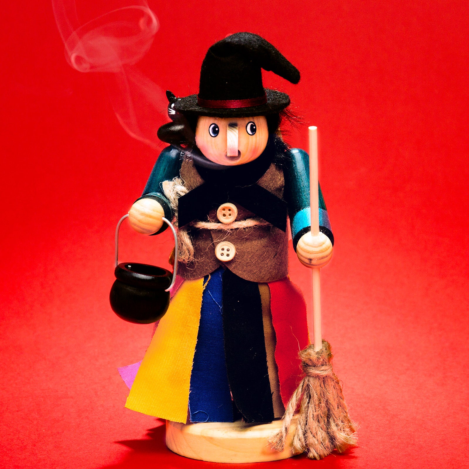 Dieses Räuchermännchen in Gestalt einer Hexe beeindruckt mit den herrlich bunten Farben des Bekleidungsstoffes und einem hohen Detailreichtum mit Figuren einer Katze, eines Besens und Topfes. Der Rock und die Weste werden aus ausgesuchten Materialien gefertigt. Die Grundform der Hauptfigur überzeugt durch ihre harmonische Gestaltung und perfekt aufeinander abgestimmte Proportionen. In liebevoller Handarbeit werden zunächst die zahlreichen Einzelteile gedrechselt, verleimt und im Anschluß von Hand bemalt. Für dieses Räuchermännchen verwenden wir ausschließlich gut abgelagertes und durchgetrocknetes Holz das sich im Laufe der Zeit nicht verzieht oder reißt. Somit haben Sie viele Jahre Freude an Ihrer neuen Mitbewohnerin. Die Hexe hat im Innern eine innovative Metallschlinge zur Aufnahme wohlduftender Räucherkegel. Die im Boden eingearbeiteten Öffnungen sorgen für eine Art Mini-Kamin-Effekt und lassen so die Luft sanft an der Räucherkerze vorbeiströmen und aus der Mundöffnung wieder austreten. Dieses Räuchermännchen hat eine Höhe von ca. 21.5 cm und ist aus ausgesuchtem Nadelholz gefertigt. Der Rauchfigur liegt eine kleine Anleitung zur richtigen Handhabung bei. Räucherkerzen sind nicht im Lieferumfang enthalten. SIKORA Weihnachtswelt.