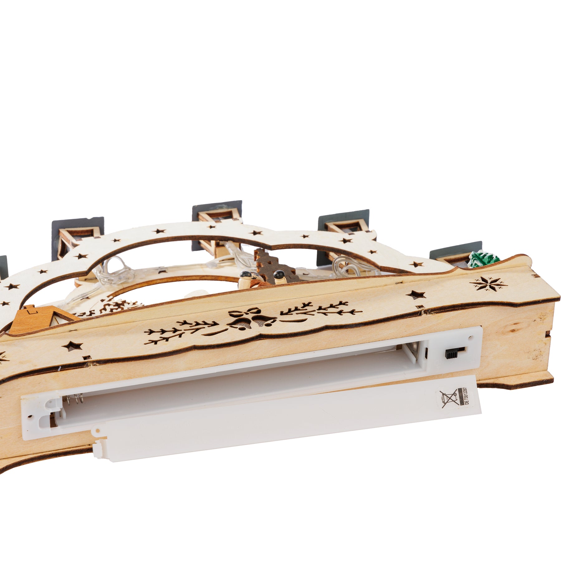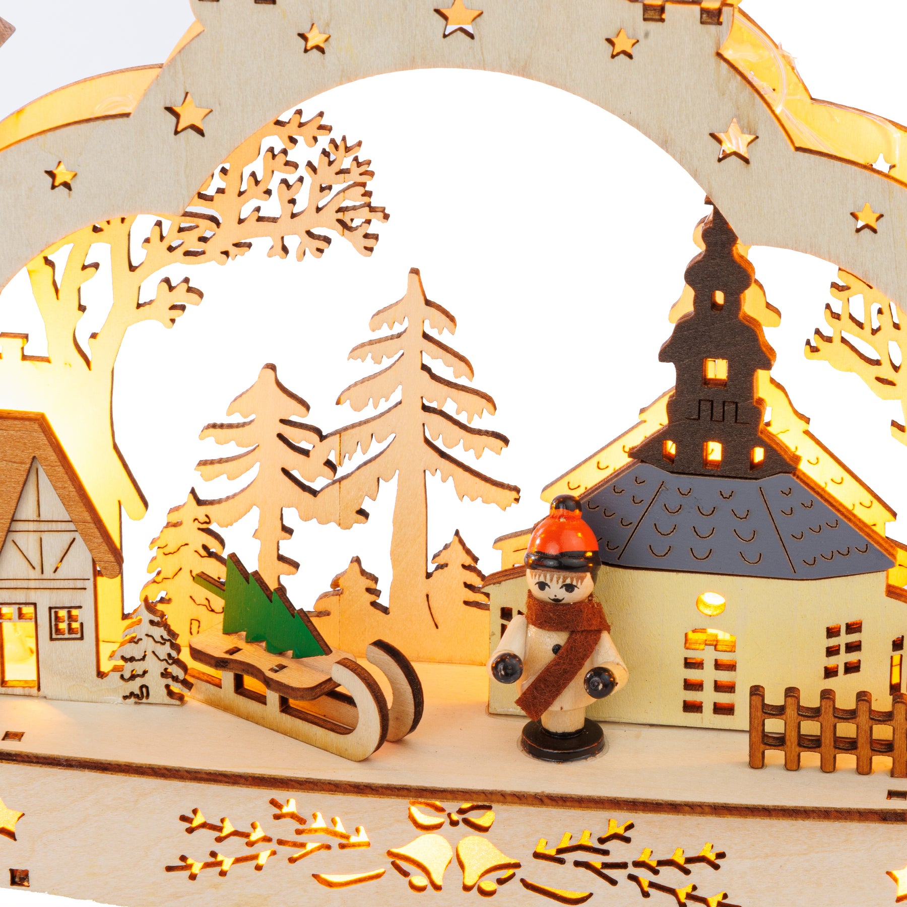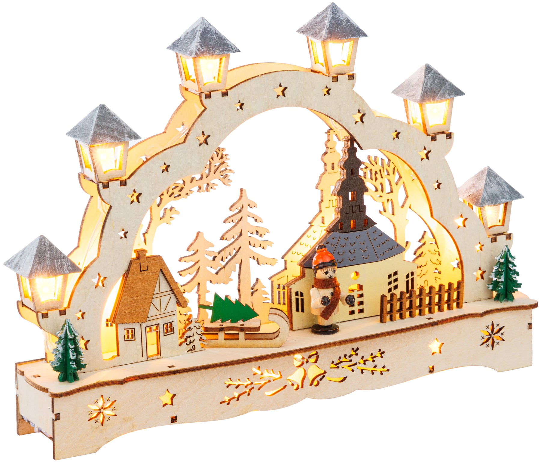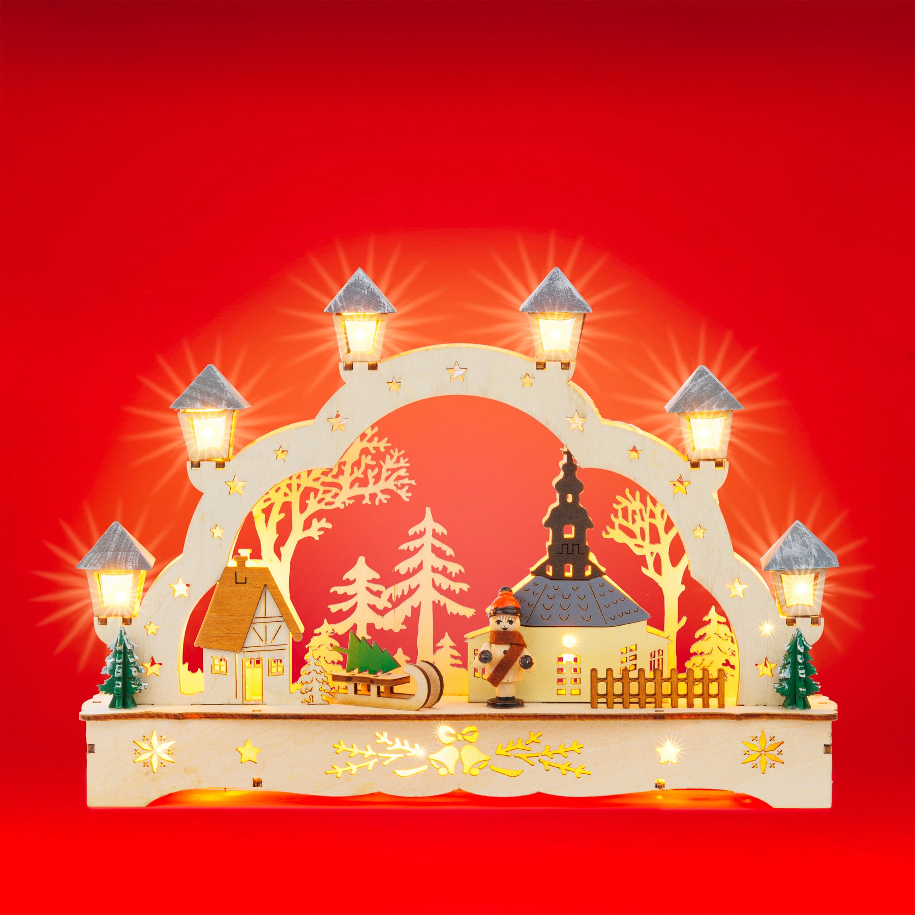 Super schöner, kleiner Holz Schwibbogen mit LED Beleuchtung. Das Lichterbogen ist batteriebetrieben (Batterien nicht enthalten), kann aber auch mit Hilfe eines SIKORA Schwibbogen Trafos (nicht enthalten) auch an der Haussteckdose angeschlossen werden. Dekoriert ist der Bogen mit einem jeweils innenbeleuchteten Häuschen, der Seiffener Kirche sowie kleinen, gedrechselten Holzfiguren und Tannenbäumen. Die 6 oben am Bogen angebrachten Laternen sowie der ca. 3,5 cm hohe Sockel sind ebenfalls beleuchtet. Der Schwibbogen ist ideal als kleines Geschenk, für die Ferienwohnung, das Wohnmobil oder das kleine Fenster zu Hause. Erforderliche Batterien: 3x Mignon AA 1,5V. Material: Holz. SIKORA Weihnachtswelt.