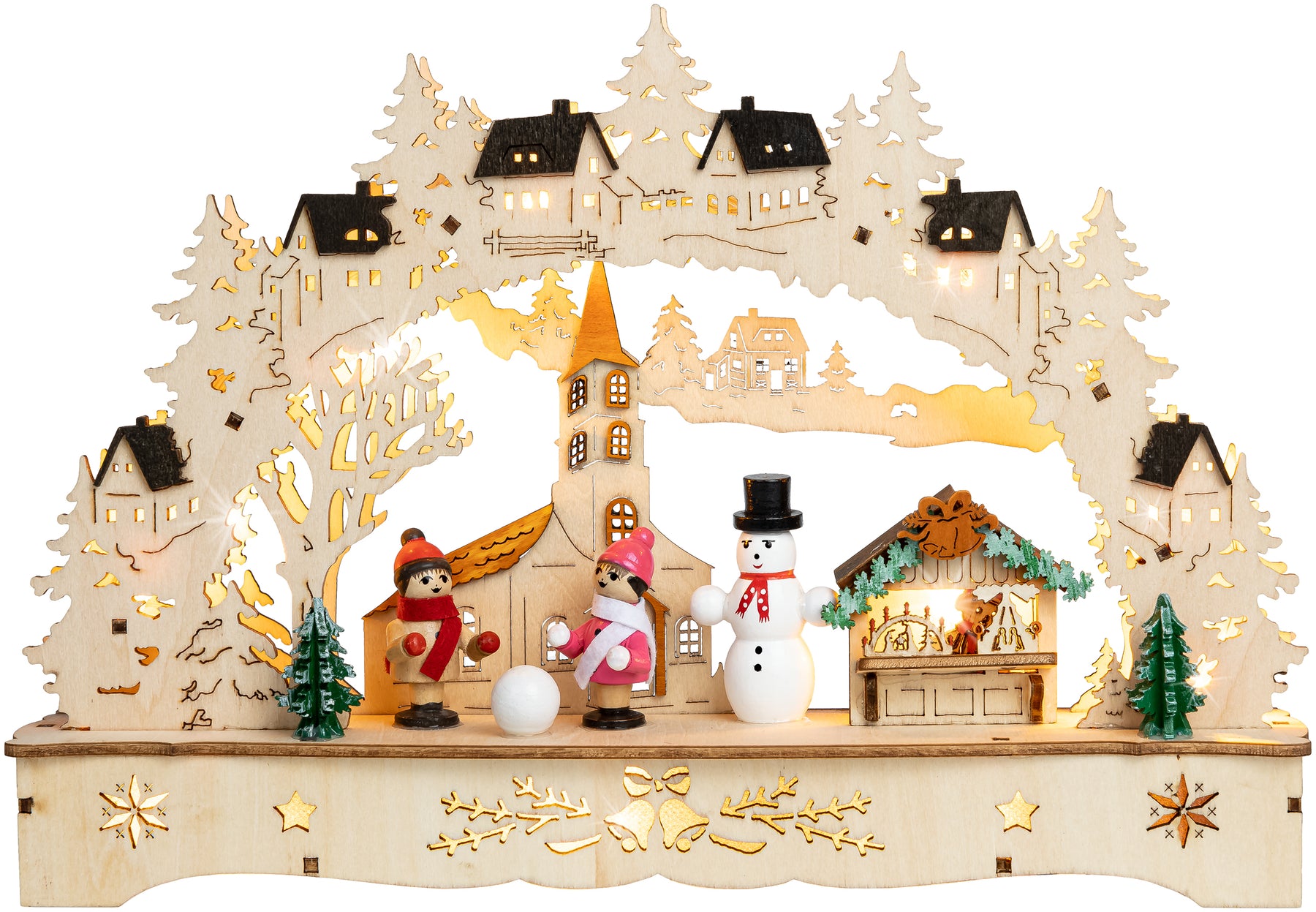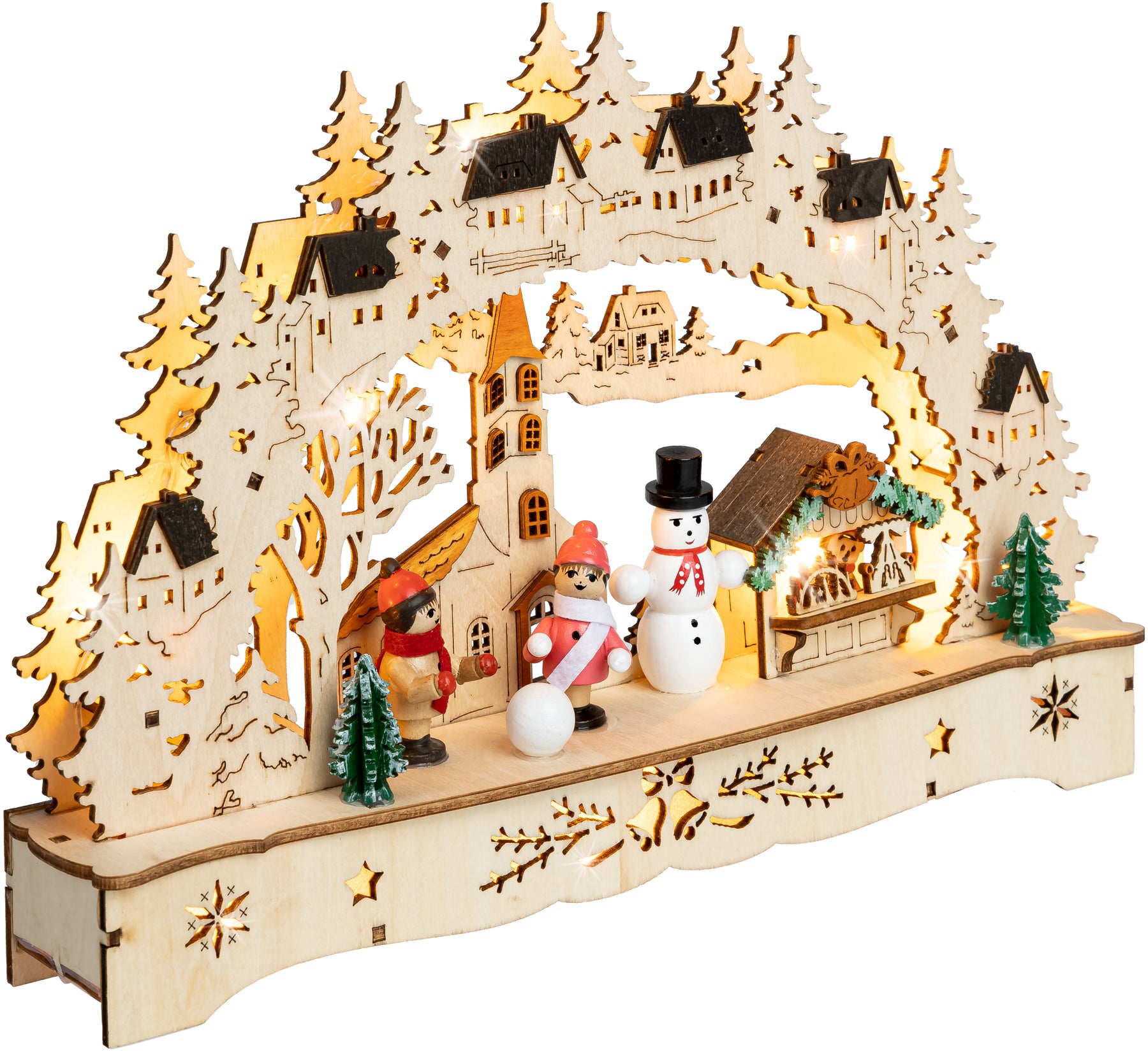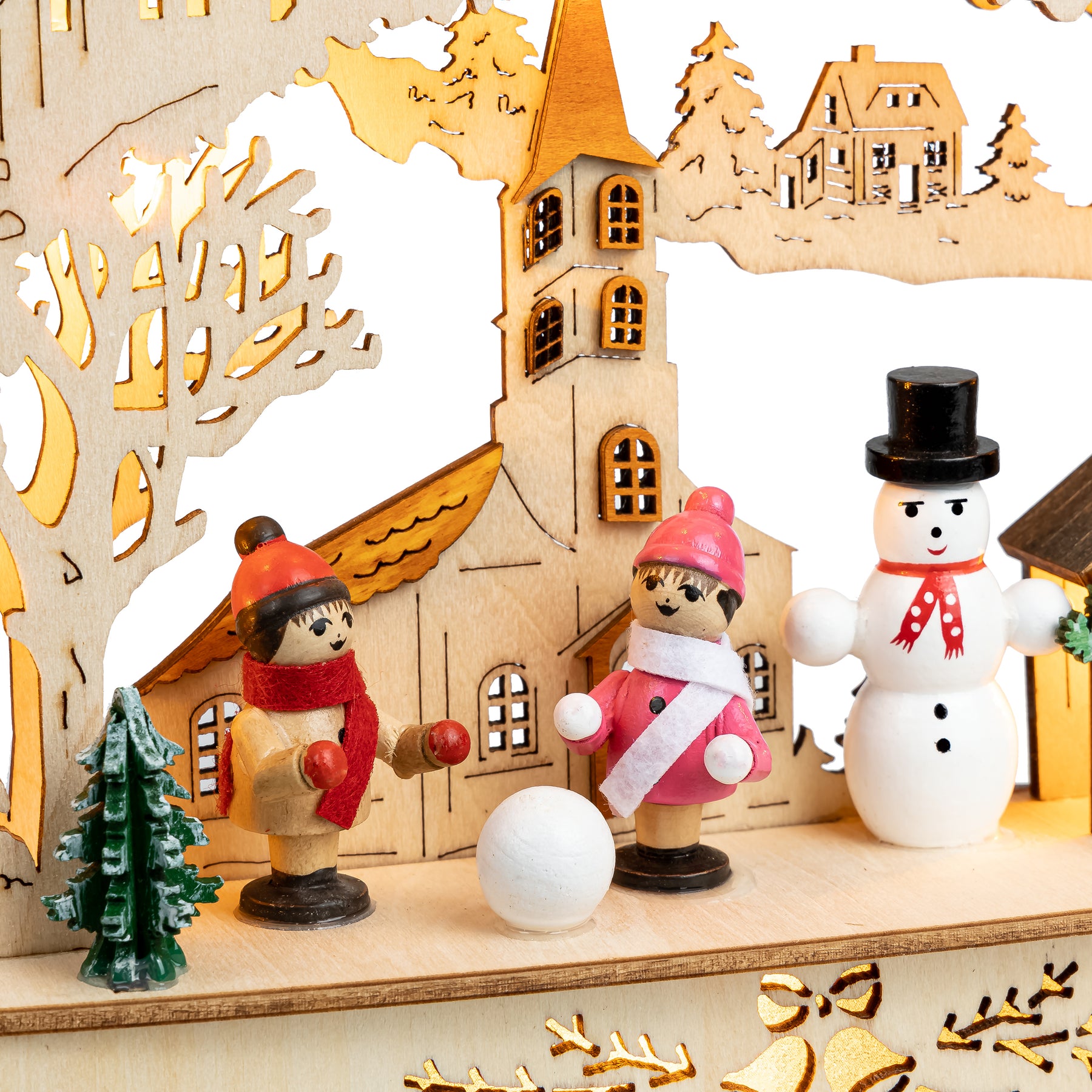 Bringe zauberhafte Weihnachtsstimmung in dein Zuhause mit diesem liebevoll gestalteten Holz-Lichterbogen. Die charmante Szene zeigt ein verschneites Winterdorf, umrahmt von Tannenbäumen und strahlend beleuchteten Häusern. Im Mittelpunkt stehen fröhliche Figuren: Zwei Kinder rollen einen Schneeball, während ein Schneemann fröhlich winkt. Das winterliche Dorf wird durch eine sanfte LED-Beleuchtung erhellt, die eine gemütliche Atmosphäre schafft.