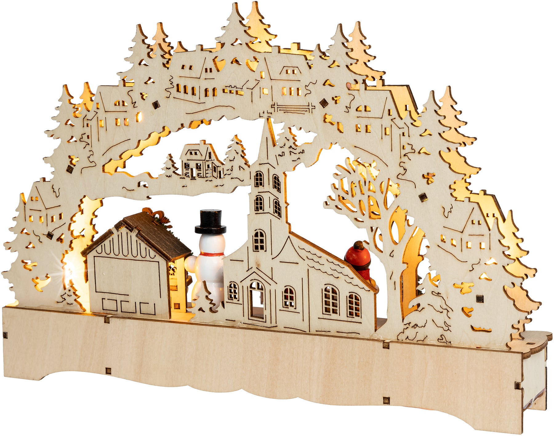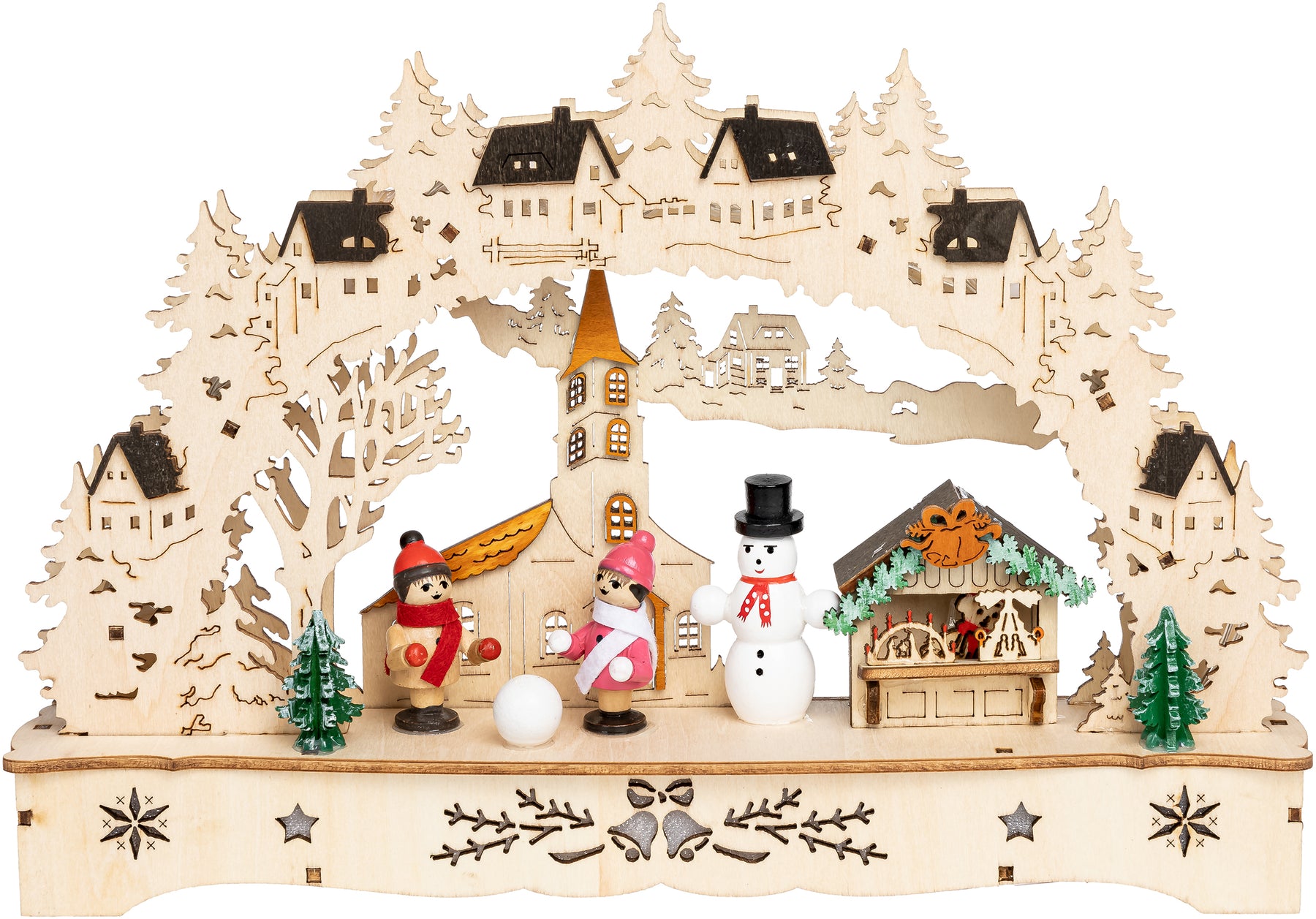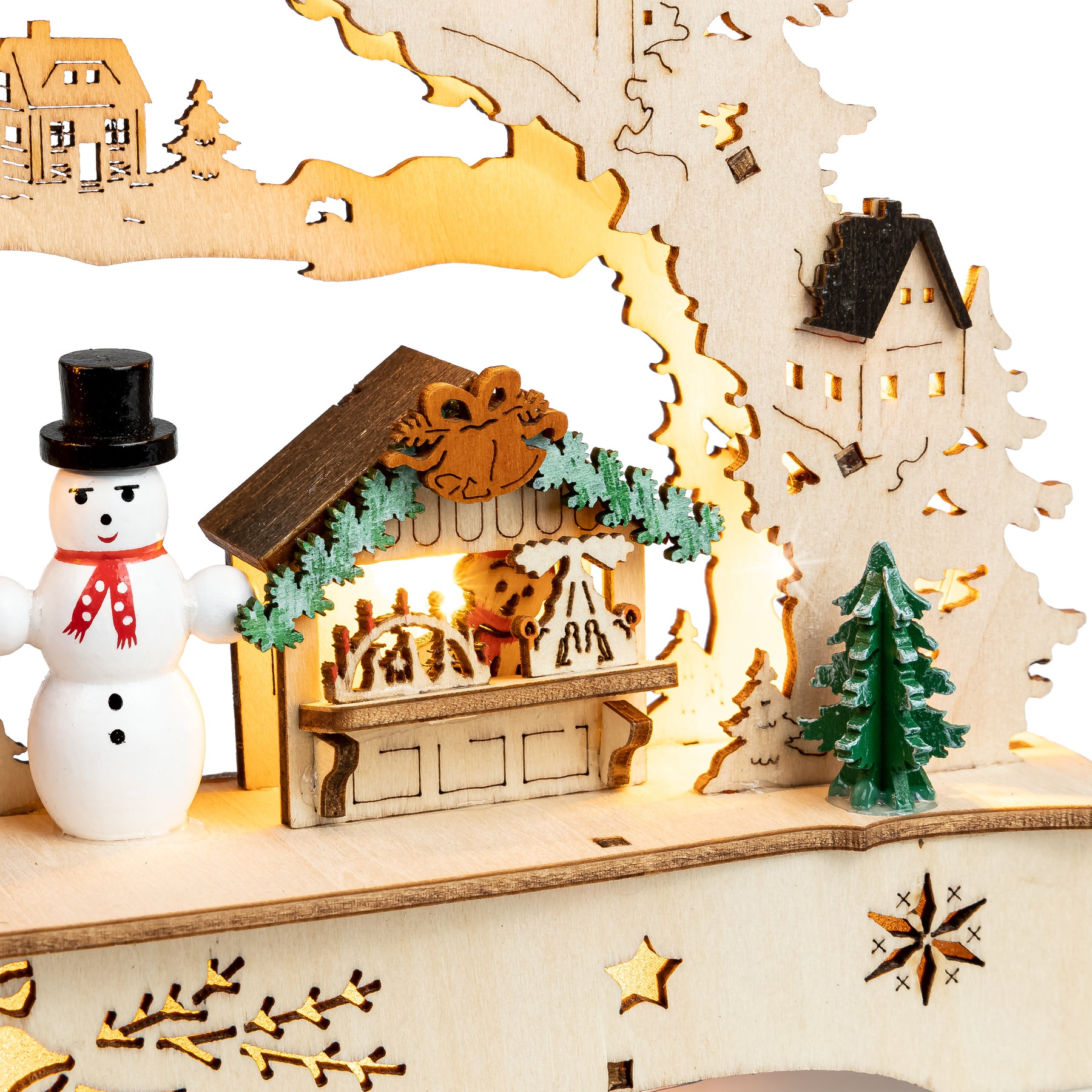 Bringe zauberhafte Weihnachtsstimmung in dein Zuhause mit diesem liebevoll gestalteten Holz-Lichterbogen. Die charmante Szene zeigt ein verschneites Winterdorf, umrahmt von Tannenbäumen und strahlend beleuchteten Häusern. Im Mittelpunkt stehen fröhliche Figuren: Zwei Kinder rollen einen Schneeball, während ein Schneemann fröhlich winkt. Das winterliche Dorf wird durch eine sanfte LED-Beleuchtung erhellt, die eine gemütliche Atmosphäre schafft.