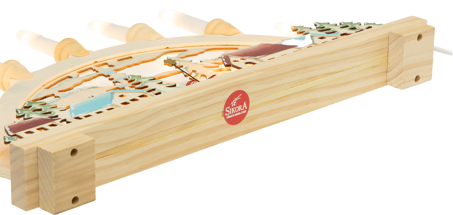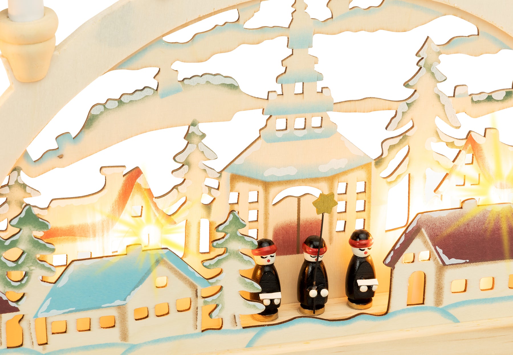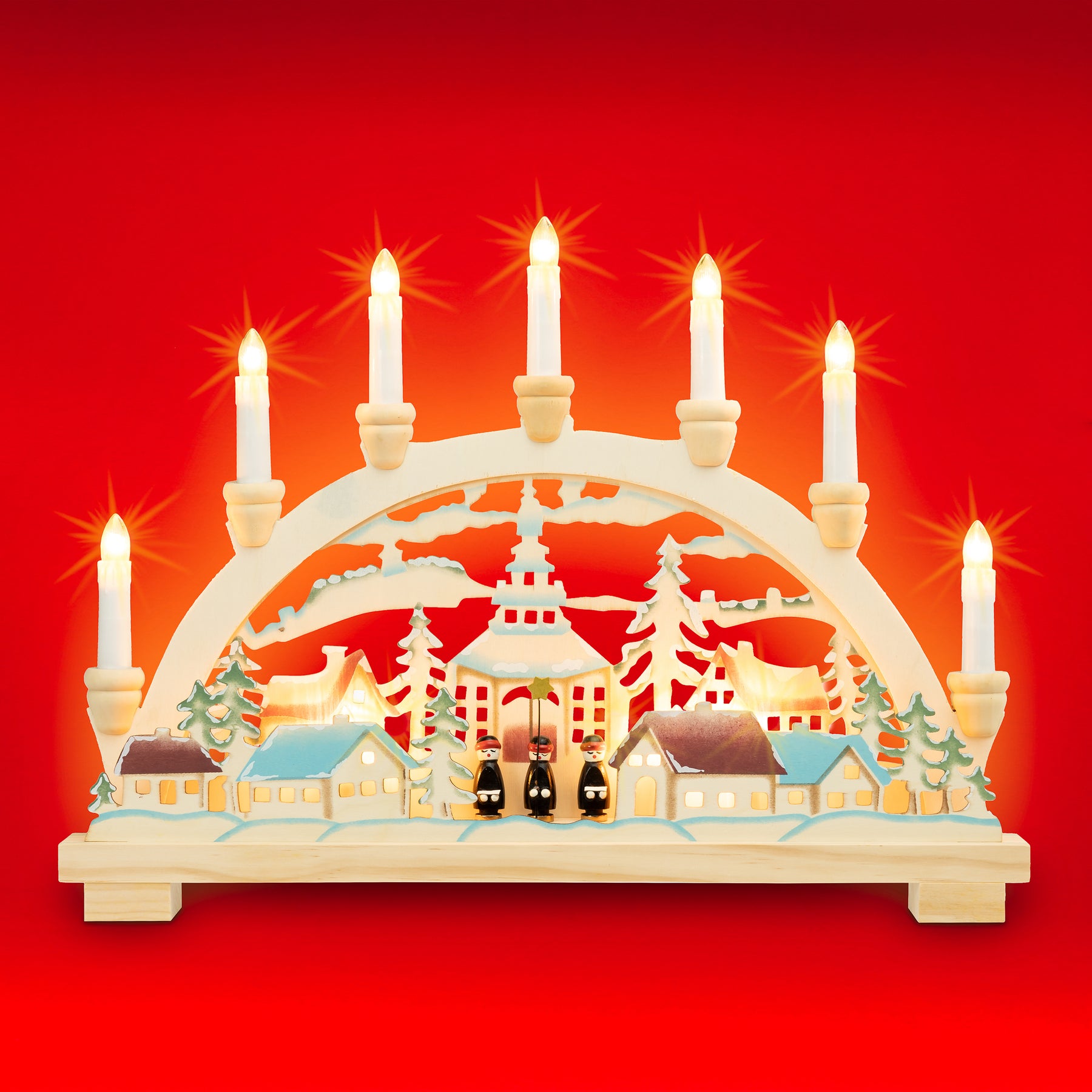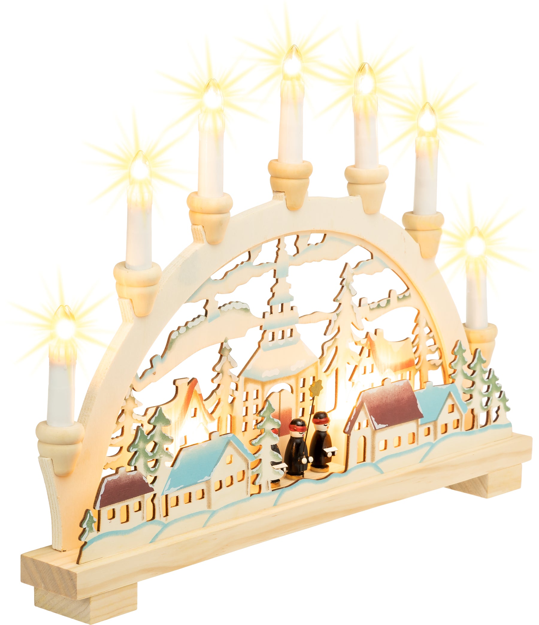 Handwerklich zum Teil aus Vollholz und in liebevoller Handarbeit in zarten Pastelltönen colorierter Holz Schwibbogen mit elektrischer Beleuchtung. Wer klassisch handwerklich hergestellte Produkte liebt liegt mit diesem Lichterbogen mit teilweise verdeckt liegender Beleuchtung genau richtig. Der Lichterbogen besitzt insgesamt 10 (austauschbare) kleine Brennstellen, davon 7 als Kerzen am oberen Bogen und 3 als verdeckt liegende Hinterleuchtung der malerischen Dorfszene im Sockelbereich. Somit erzeugt dieser Bogen eine wundervoll weihnachtliche, stimmungsvolle Atmosphäre. Er wird mit Hilfe des angebrachten Kabels mit Steckdose und An- und Ausschalter einfach an die Haussteckdose angeschlossen. Maße: Breite ca. 45 cm, Höhe (incl Kerzen) ca. 33 cm, Tiefe ca. 5 cm. Leuchtmittel: 10 x 24V 3W Riffelkerzen Fassung E10. SIKORA Weihnachtswelt.
