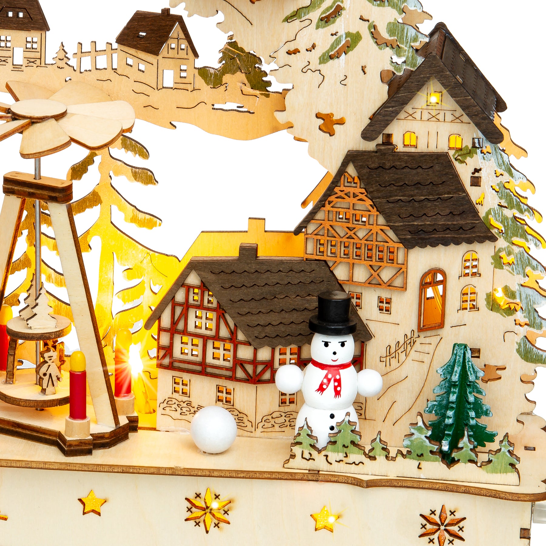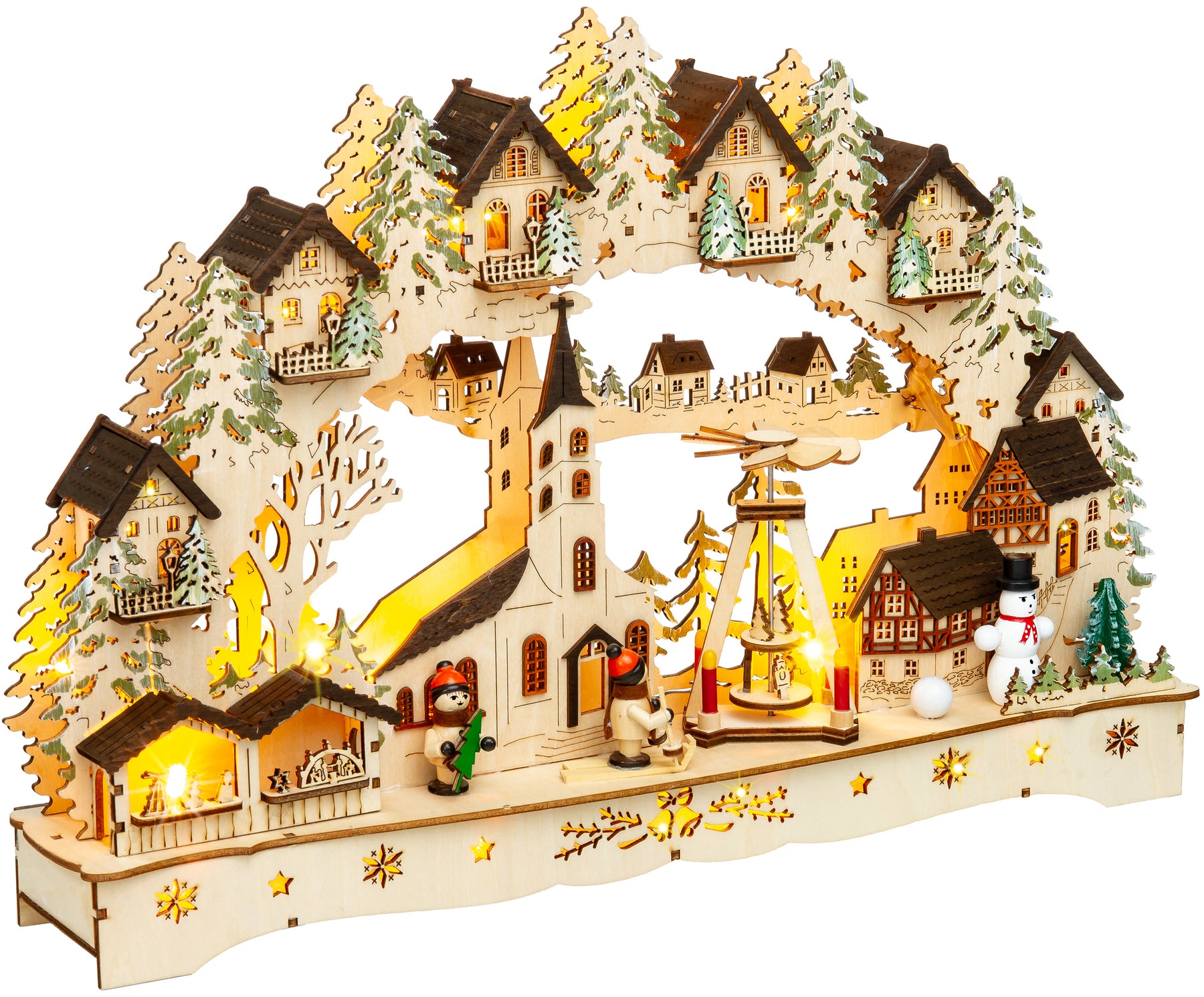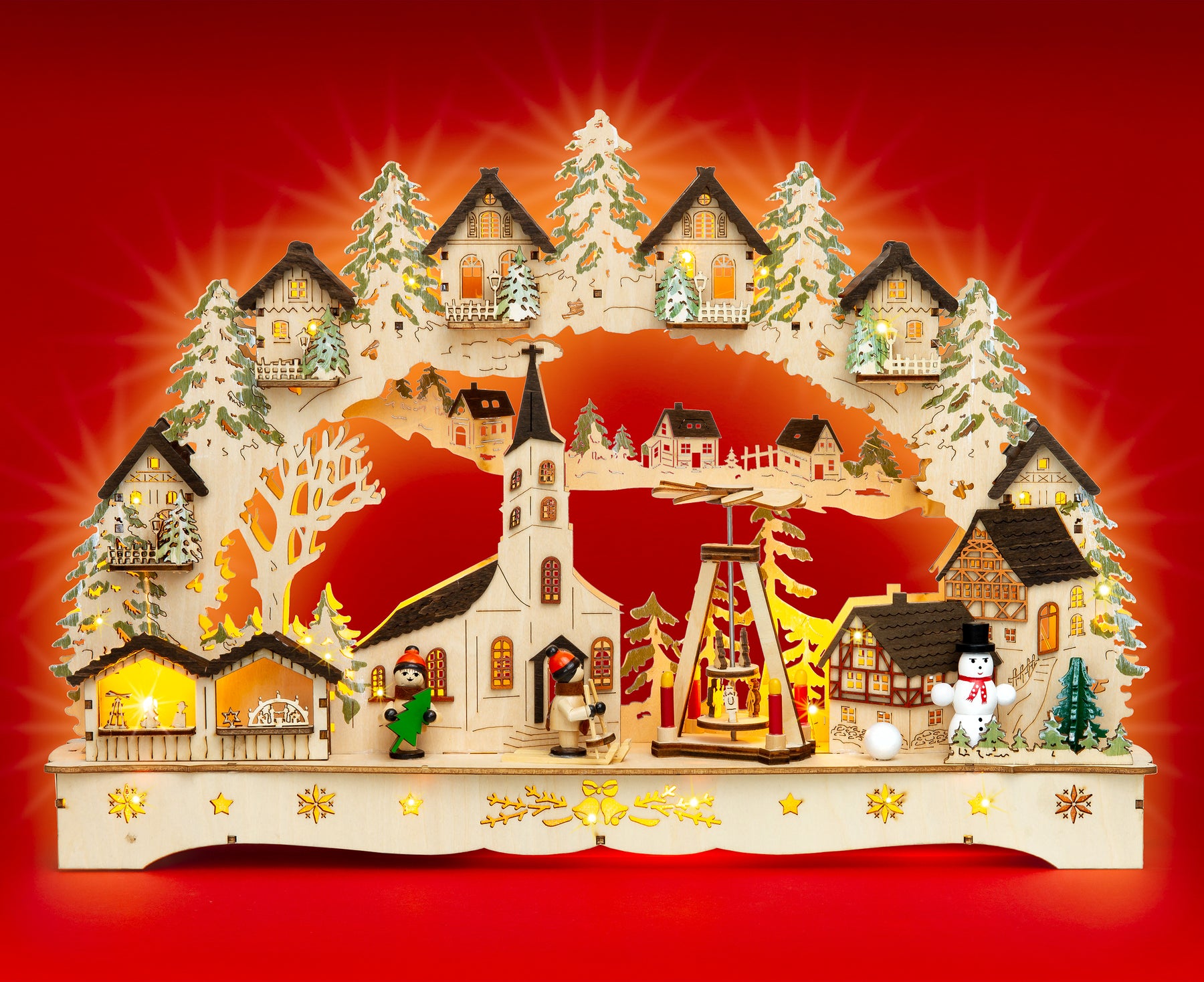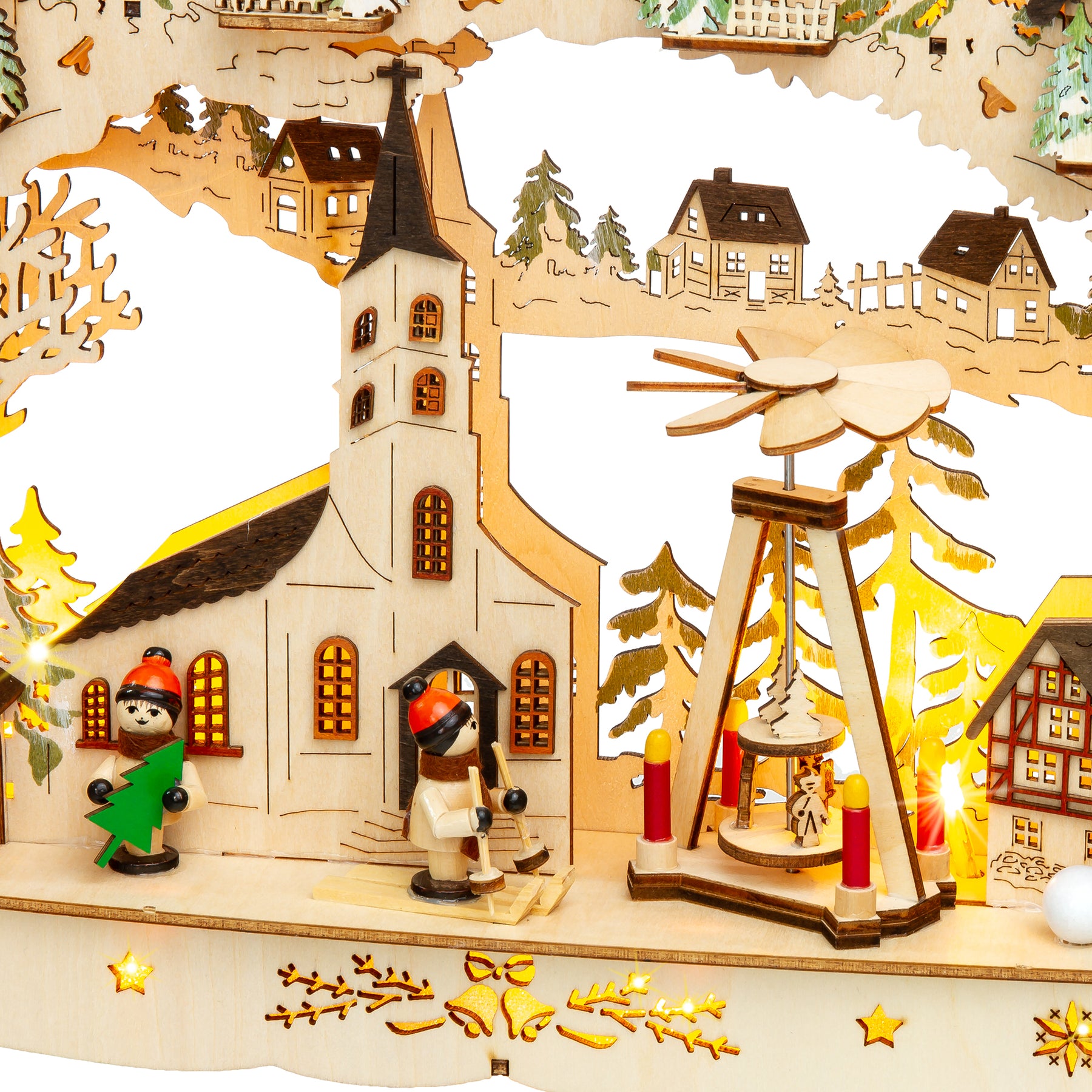 Dieser charmante Holz-Lichterbogen aus der SIKORA Weihnachtswelt bringt festliche Stimmung in jedes Zuhause. Mit seinem ansprechenden Design, das liebevoll gestaltete Häuschen, eine Kirche und eine Weihnachtspyramide umfasst, ist er ein echter Hingucker. Die Beleuchtung ist durch die verdeckt platzierten LEDs besonders stimmungsvoll und sorgt für eine sanfte, weihnachtliche Atmosphäre. Der Lichterbogen nutzt energieeffiziente LED-Technologie und benötigt nur etwa 5 Watt pro Stunde. Trotz des niedrigen Energieverbrauchs verbreitet er ein warmes, festliches Licht.
