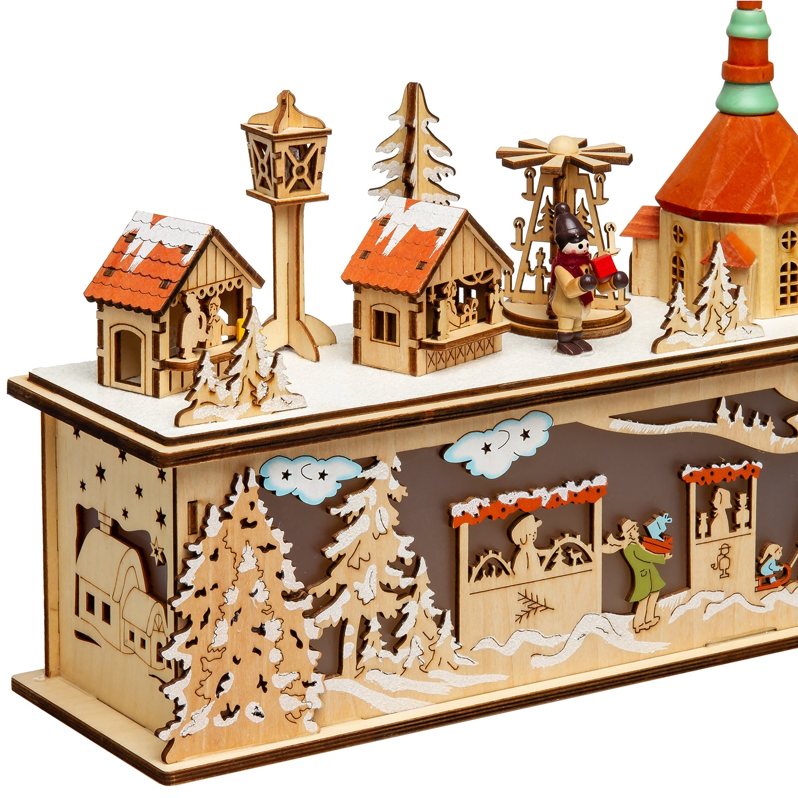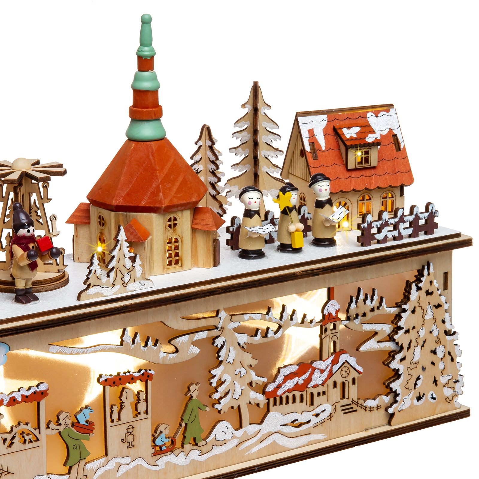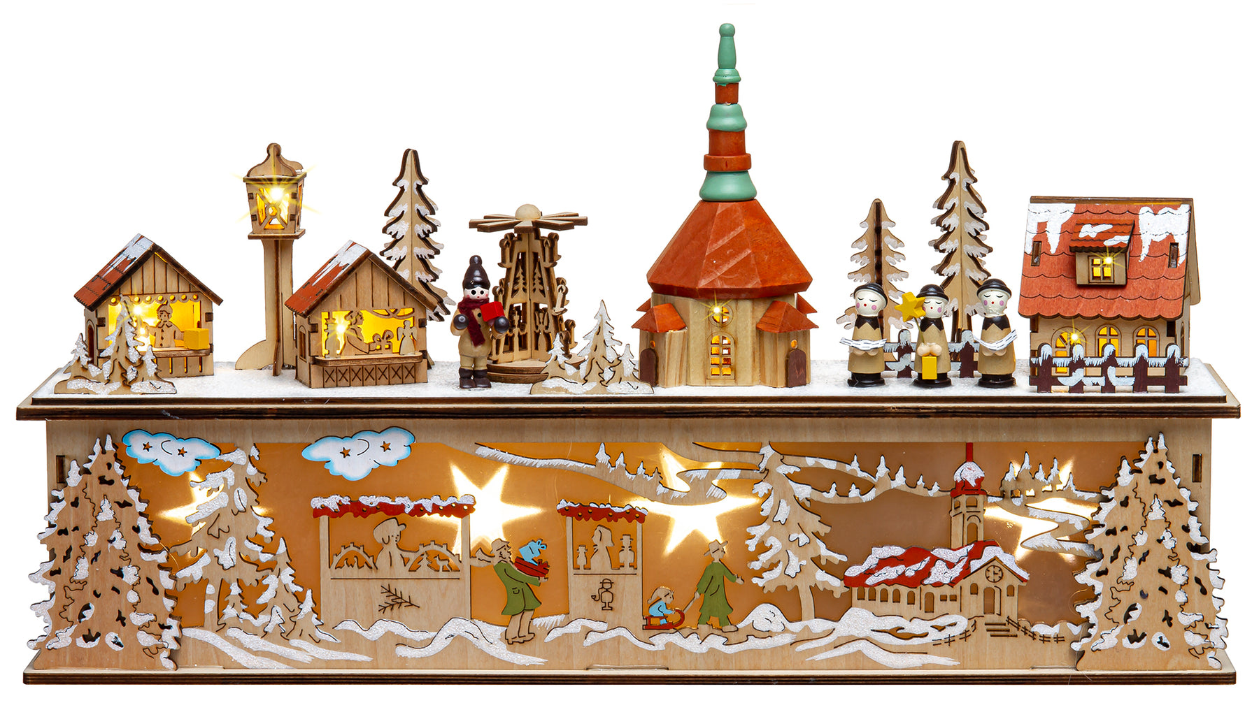 Wundervoller, in liebevoller Handarbeit aufwändig gestalteter Lichtersockel aus Holz mit stromsparender LED Beleuchtung. Besonders reizvoll dekoriert mit mehreren von innen beleuchteten Häuschen, der beleuchteten Seiffener Kirche und einer detailreich gestalteten weihnachtlichen Dorf- und Weihnachtsmarkt-Szene im ebenfalls beleuchteten Sockel. Sie können dieses wirklich einzigartige Weihnachtsdeko sowohl mit Hilfe von Batterien betreiben als auch mit dem beiliegenden passenden Trafo an das Stromnetz bzw. eine Haussteckdose anschließen. Somit müssen Sie auch im Ferienhaus, Wohnmobil oder sonstigen Orten ohne Stromanschluss nicht auf Ihre bezaubernde Weihnachtsdeko verzichten. Maße ca. L45xB10xH25 cm. SIKORA Weihnachtswelt.