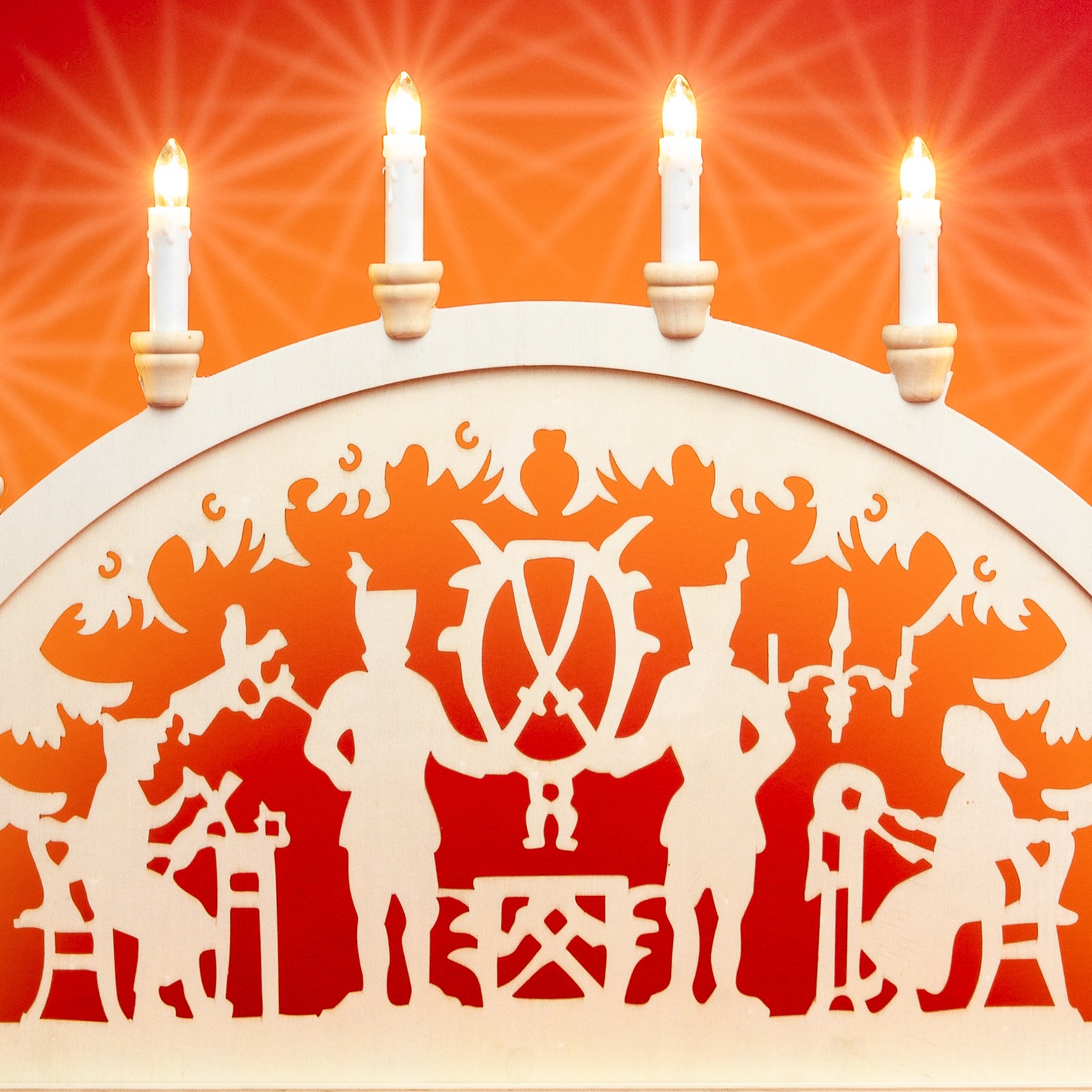 Wunderschöner, traditioneller Holz Lichterbogen mit 10 elektrischen Kerzen. Das klassische BERGMANN Motiv hat seinen Ursprung in Ostdeutschland und wird dort bereits seit langem als Motiv für ursprüngliche Weihnachtsdekorationen und Figuren benutzt. Der Schwibbogen hat 10 Kerzen mit je 3 Watt, ist ca. 42 cm hoch und 71 cm lang. Ein niveauvolles Highlight für Ihre weihnachtliche Dekoration! Mit Anschlussleitung und An / Aus Schalter für die 220 V Haussteckdose. SIKORA Weihnachtswelt.