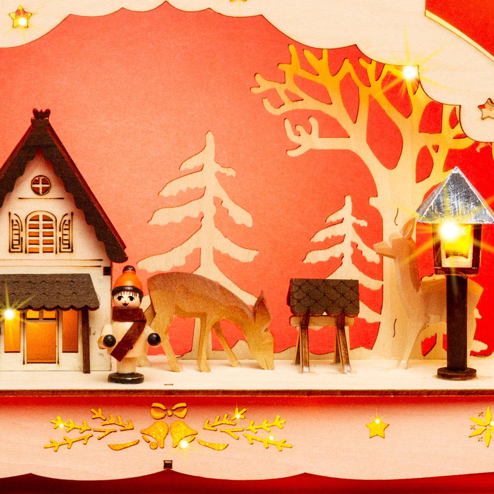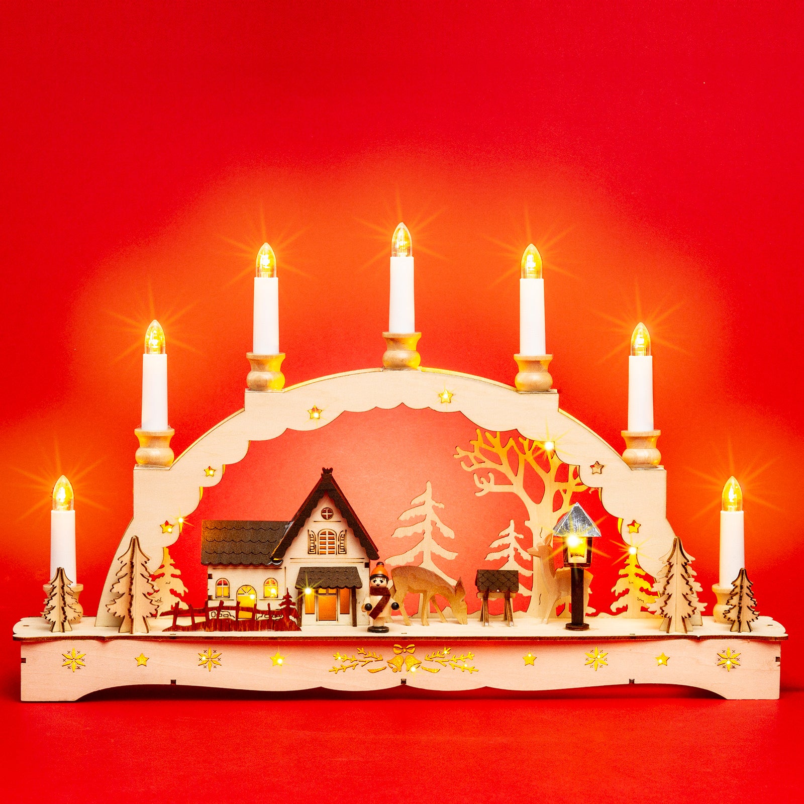 Wunderschöner, klassische natürlicher Holz Lichterbogen mit WALDMOTIV und teilweise verdeckt liegender Beleuchtung. Neben dem außergewöhnlich ansprechenden Design mit dem beleuchteten Häuschen und Laterne, den in liebevoller Handarbeit geschnitzten kleinen Rehfiguren, der guten Verarbeitung unter Verwendung vornehmlich natürlicher Materialien sind es vor allem die technischen Vorzüge, die diesen Lichterbogen zu einem echten Bestseller machen. Denn die verbaute LED Beleuchtung zaubert nicht nur eine wudervoll weihnachtliche Stimmung sondern verbraucht auch noch sehr wenig Strom. Gefertigt wird dieser Lichterbogen aus sorgfältig ausgesuchten hochwertigen Hölzern und unter Anwendung klassischer Handwerkstraditionen. Die Maße des Lichterbogens sind: Höhe: ca. 29 cm, Breite: ca. 47,5 cm, Tiefe: ca. 7,5 cm. Er besitzt 7 sichtbare Brennstellen in Kerzenoptik sowie zahlreiche weitere verdeckt liegende Lämpchen in Sockel, Häuschen, Laterne und innerhalb des Bogens. Ein Trafo mit extra langer Zuleitung zum Anschluß an eine normale Haussteckdose liegt dem Schwibbogen bei. Alternativ kann der Bogen auch mit Batterien betrieben werden (nicht im Lieferumfang enthalten). SIKORA Weihnachtswelt.