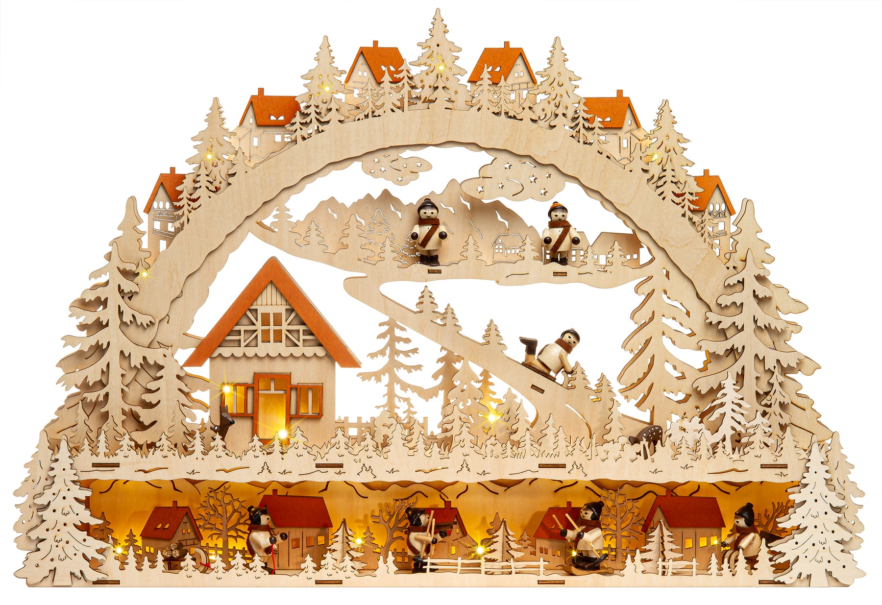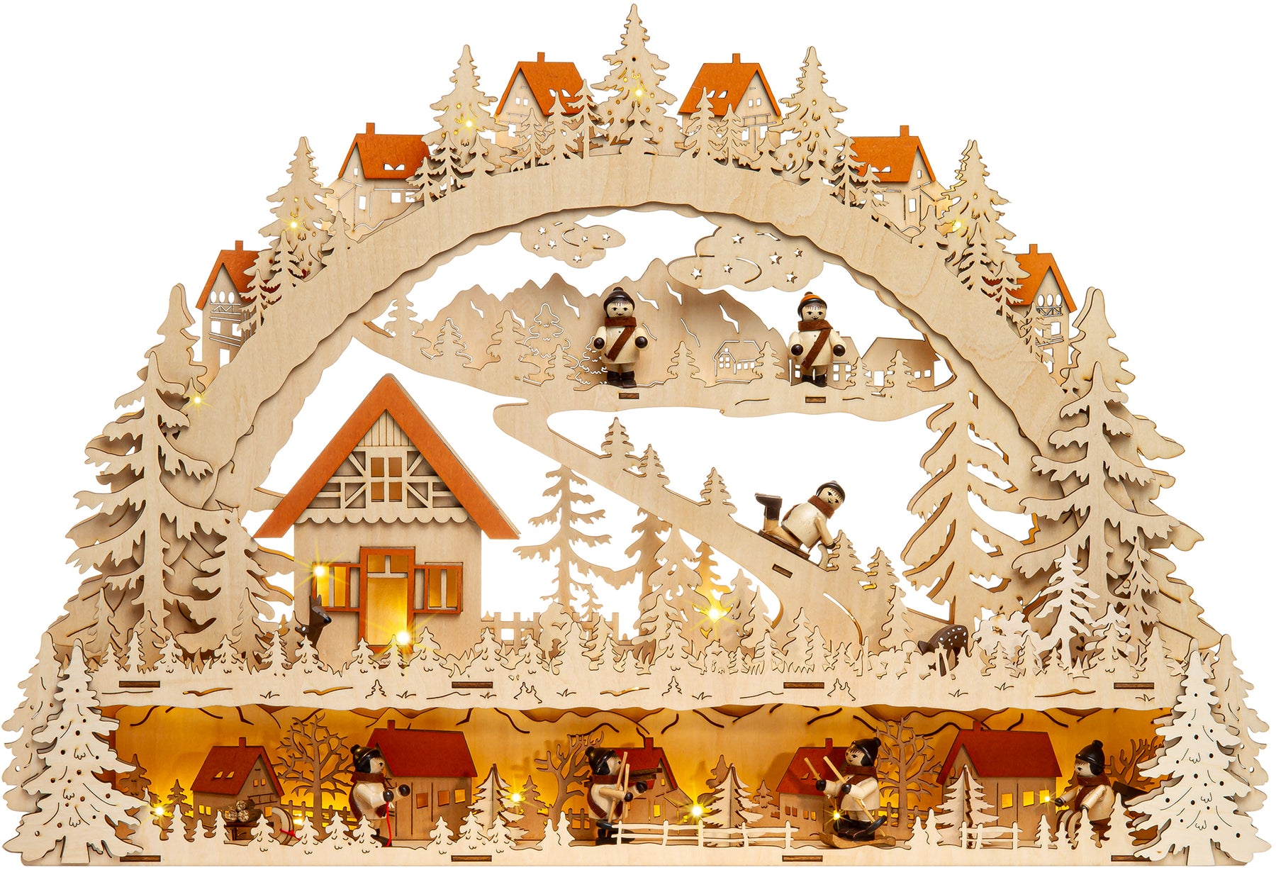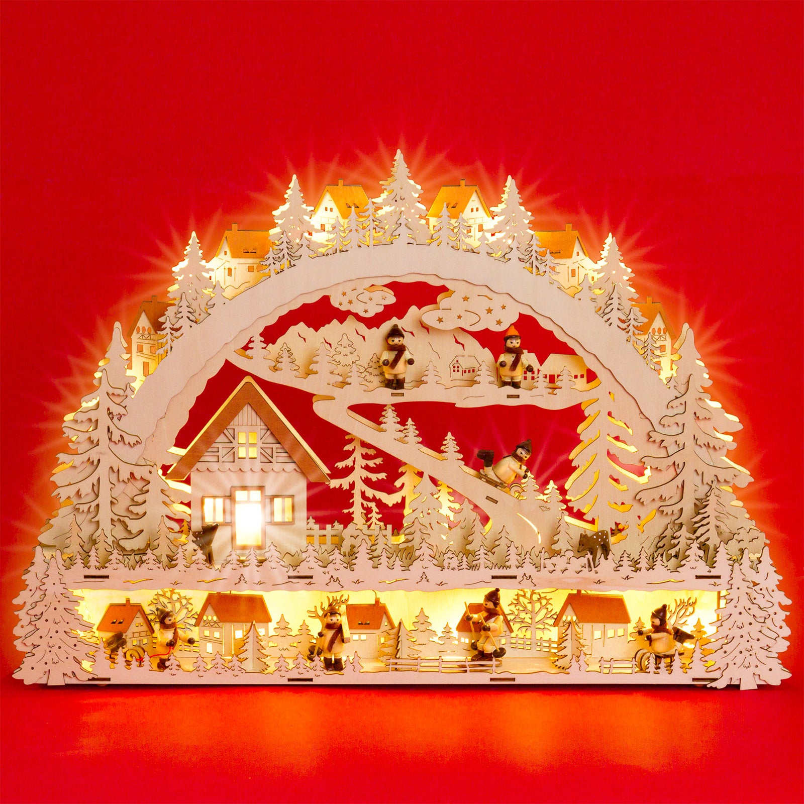 Wunderschöner, RIESIGER, klassischer Holz Lichterbogen mit verdeckt liegender Beleuchtung, eingebauter Erhöhung zur Verdeckung des Fensterrahmens und strom-sparender LED Technologie. Neben der ungewöhnlichen Größe und dem außergewöhnlich ansprechenden klassischen Design mit "angebauter" Schwibbogenbank, der guten Verarbeitung unter Verwendung vornehmlich natürlicher Materialien sind es vor allem die technischen Vorzüge, die diesen Lichterbogen zu einem echten Bestseller machen. Zur Ausstattung des Schwibbogens gehören 7 gedrechselte Holzfiguren und 2 handgeschnitzte Rehe. So benötigt er lediglich 6 Watt in der Stunde und verbreitet durch die verdeckt angeordneten Leuchten dennoch eine wunderbar weihnachtliche Stimmung. Dem Schwibbogen liegt ein Trafo zum Anschluss an die Haussteckdose bei. Die Maße des Lichterbogens sind: Höhe: ca. 43 cm, Breite: ca. 63 cm, Tiefe: ca. 9 cm. SIKORA Weihnachtswelt.