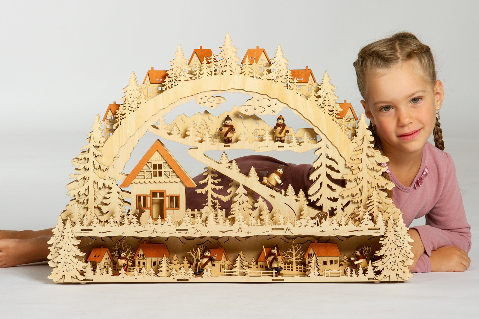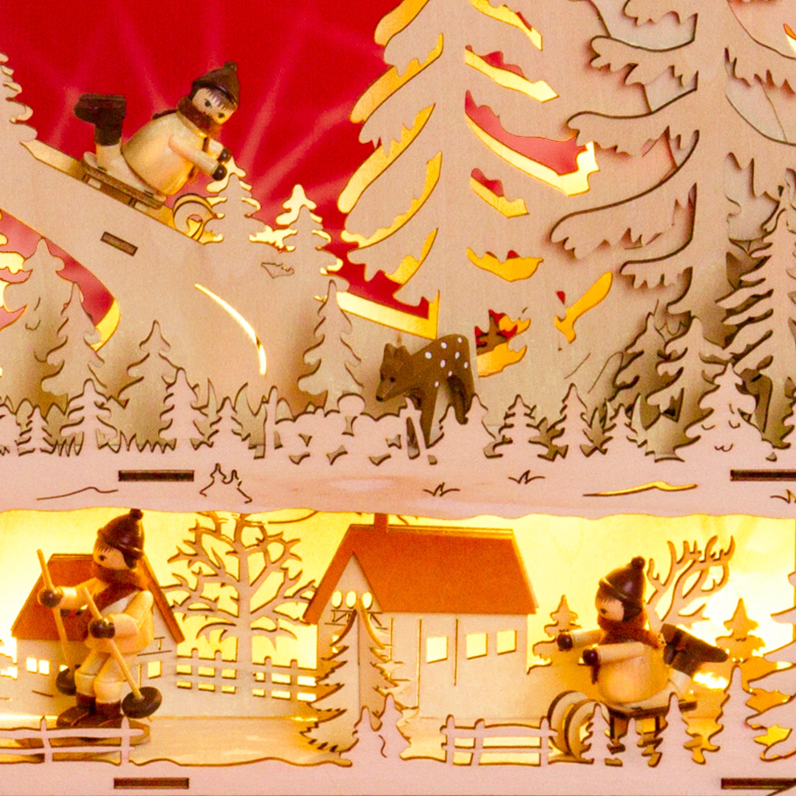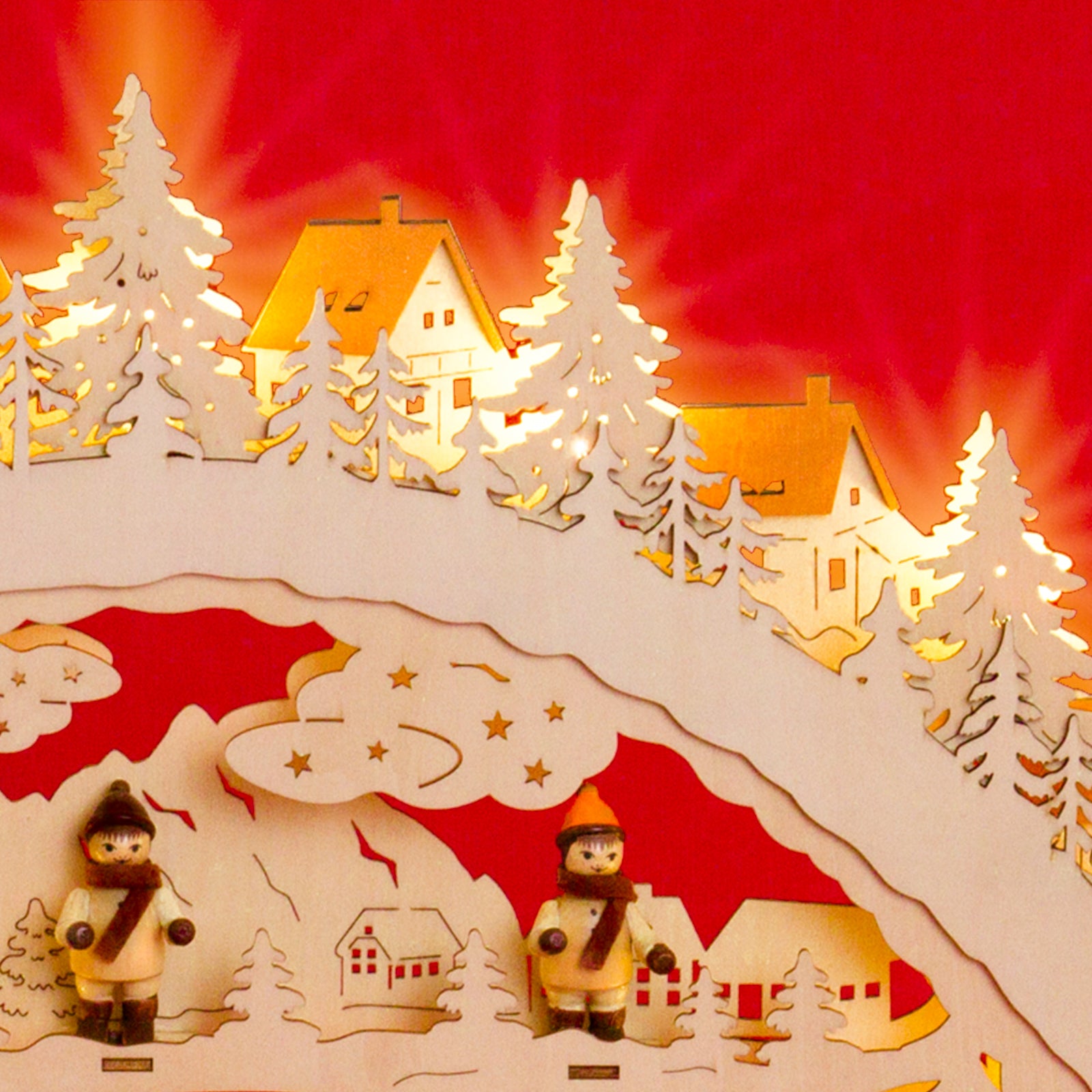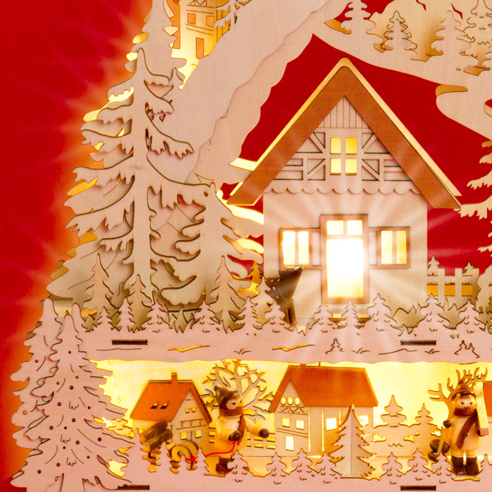 Wunderschöner, RIESIGER, klassischer Holz Lichterbogen mit verdeckt liegender Beleuchtung, eingebauter Erhöhung zur Verdeckung des Fensterrahmens und strom-sparender LED Technologie. Neben der ungewöhnlichen Größe und dem außergewöhnlich ansprechenden klassischen Design mit "angebauter" Schwibbogenbank, der guten Verarbeitung unter Verwendung vornehmlich natürlicher Materialien sind es vor allem die technischen Vorzüge, die diesen Lichterbogen zu einem echten Bestseller machen. Zur Ausstattung des Schwibbogens gehören 7 gedrechselte Holzfiguren und 2 handgeschnitzte Rehe. So benötigt er lediglich 6 Watt in der Stunde und verbreitet durch die verdeckt angeordneten Leuchten dennoch eine wunderbar weihnachtliche Stimmung. Dem Schwibbogen liegt ein Trafo zum Anschluss an die Haussteckdose bei. Die Maße des Lichterbogens sind: Höhe: ca. 43 cm, Breite: ca. 63 cm, Tiefe: ca. 9 cm. SIKORA Weihnachtswelt.