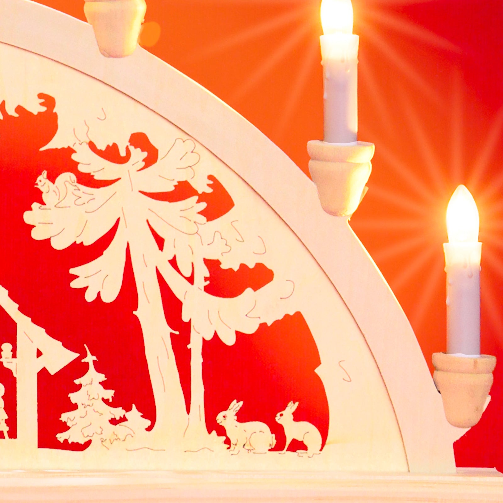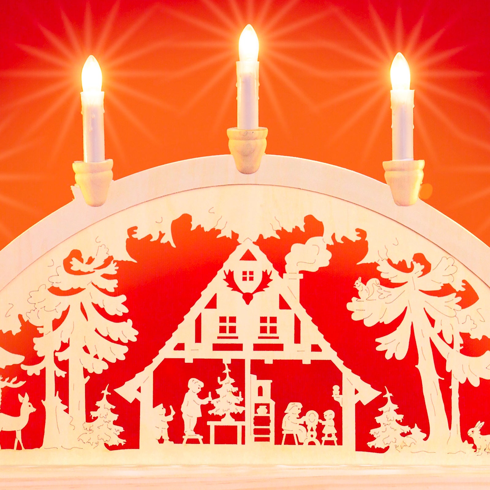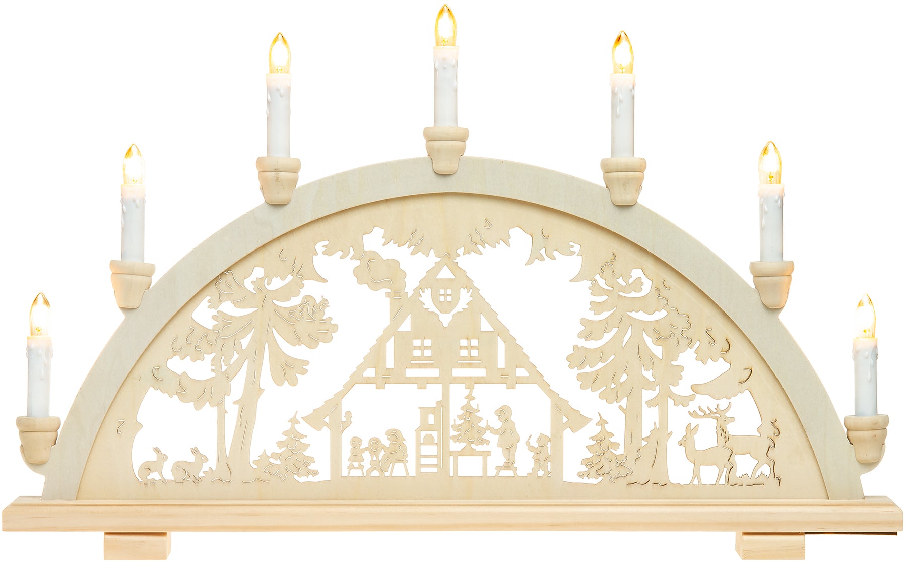 Wunderschöner, traditioneller Holz Lichterbogen mit 7 elektrischen Kerzen. Das klassische WALDHAUS Motiv hat seinen Ursprung im Erzgebirge und wird dort bereits seit langem als Motiv für ursprüngliche Weihnachts-Dekorationen und Figuren benutzt. Der Schwibbogen hat 7 Kerzen mit je 3 Watt, ist ca. 34,5 cm hoch und 57 cm lang. Eine passende Unterstellbank finden Sie unter dem Suchbegriff "SIKORA Schwibbogenbank". Ein niveauvolles Highlight für Ihre weihnachtliche Dekoration! Mit Anschlußleitung und An / Aus Schalter für das 220 V Hausnetz. SIKORA Weihnachtswelt.