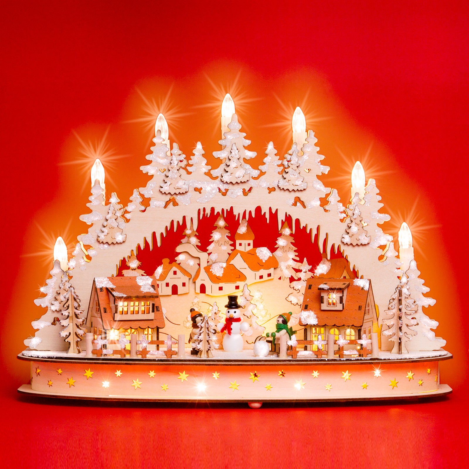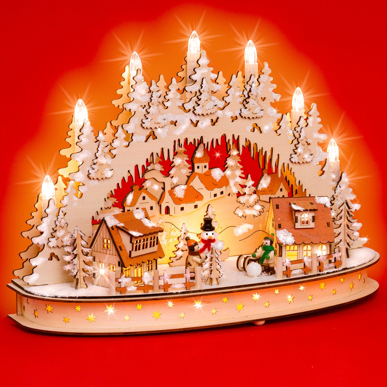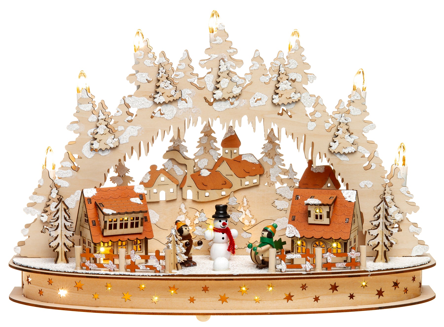 Wunderschöner, hochwertiger Holz Lichterbogen mit teilweise verdeckt liegender Beleuchtung und stromsparender LED Technologie. Der Schwibbogen besitzt einen halbrunden Sockel mit darauf stehenden beleuchteten Häusern und Figuren von spielenden Kindern. Die Beleuchtung besteht aus 7 sichtbaren Topkerzen, die auch mit Sternaufsteckern (nicht im Lieferumfang enthalten) versehen werden können sowie aus einer verdeckt liegenden Beleuchtung in Häusern und Sockel. Neben dem außergewöhnlich ansprechenden Design, der guten Verarbeitung unter Verwendung vornehmlich natürlicher Materialien sind es jedoch auch vor allem die technischen Vorzüge, die diesen Lichterbogen zu einem echten Bestseller machen. Er verbreitet eine wunderbar weihnachtliche Stimmung. Dem Schwibbogen liegt ein Trafo mit extra langer, transparenter und somit unauffälliger Zuleitung bei. Zusätzlich kann der Bogen auch mit handelsüblichen Batterien betrieben werden (nicht im Lieferumfang enthalten) was eine Benutzung ohne nahegelegene Steckdose ermöglicht. Die Maße des Lichterbogens sind: Höhe: ca. 30 cm, Breite: ca. 42 cm, Tiefe: ca. 13 cm. SIKORA Weihnachtswelt.