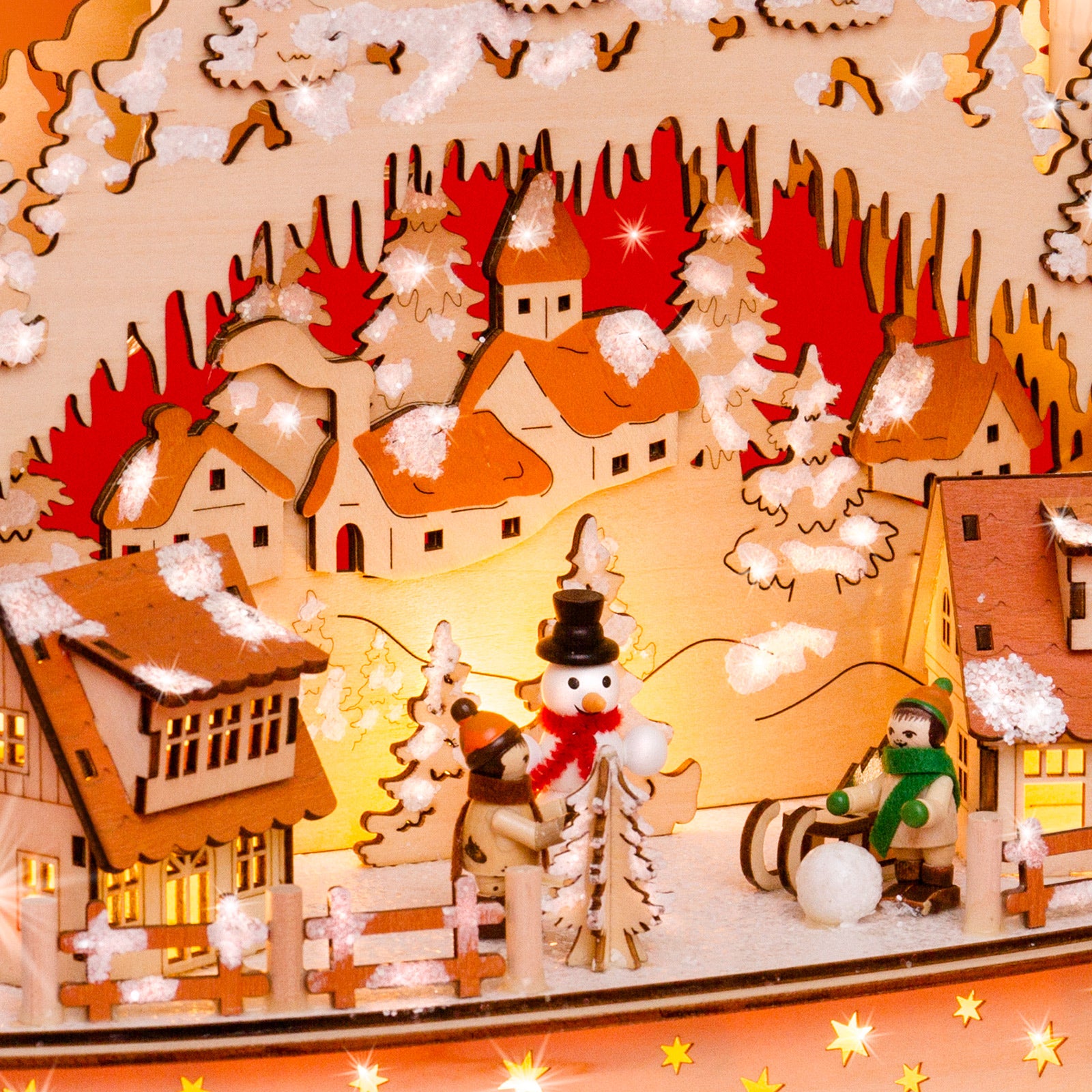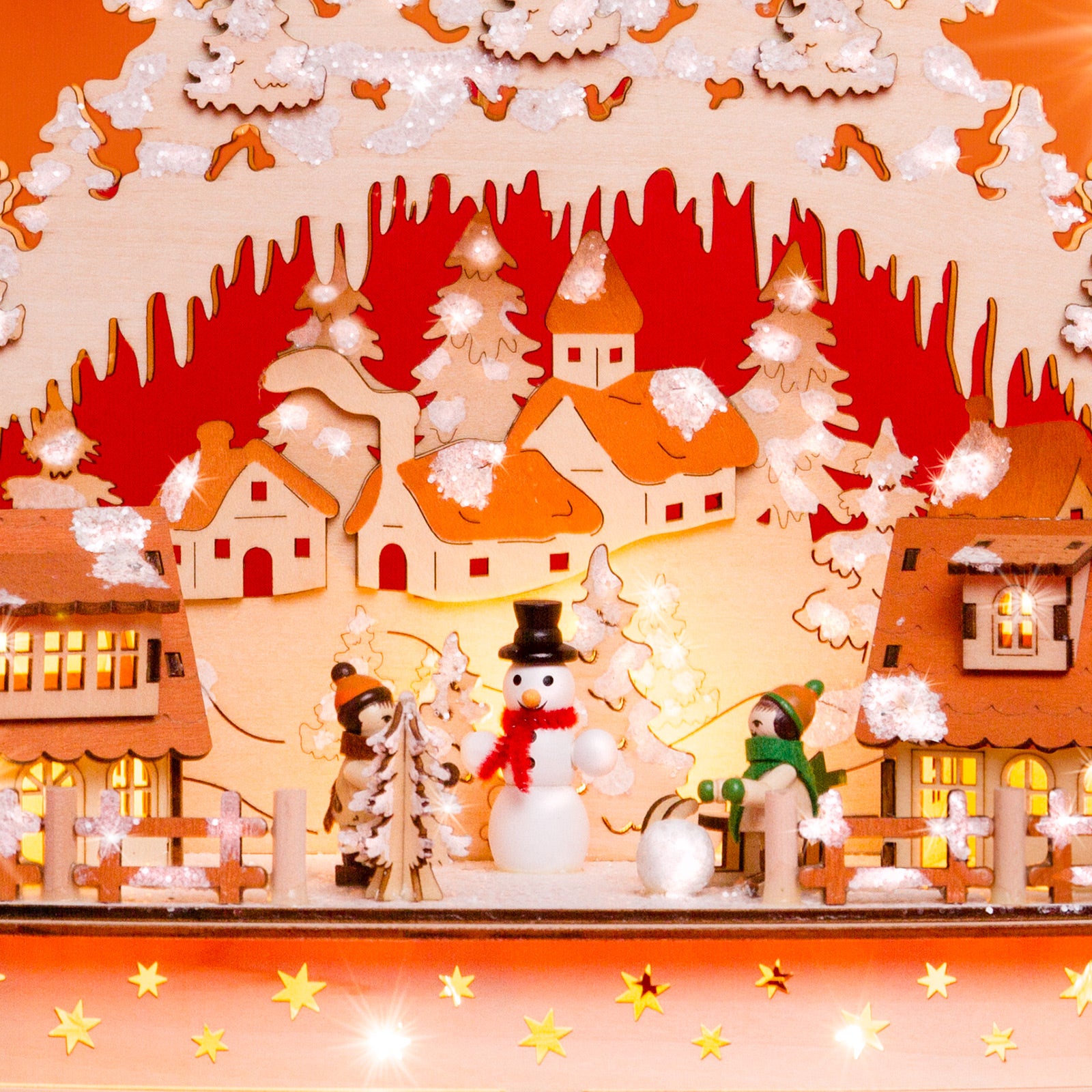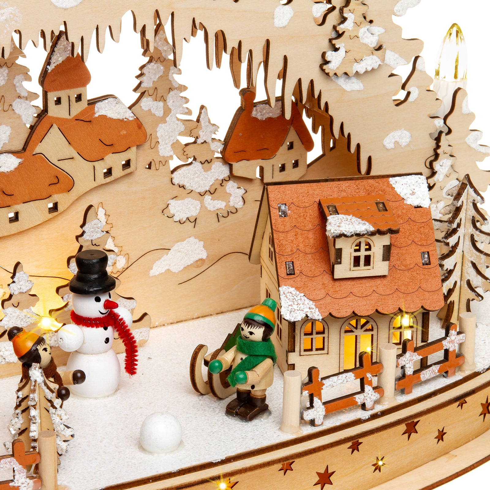 Wunderschöner, hochwertiger Holz Lichterbogen mit teilweise verdeckt liegender Beleuchtung und stromsparender LED Technologie. Der Schwibbogen besitzt einen halbrunden Sockel mit darauf stehenden beleuchteten Häusern und Figuren von spielenden Kindern. Die Beleuchtung besteht aus 7 sichtbaren Topkerzen, die auch mit Sternaufsteckern (nicht im Lieferumfang enthalten) versehen werden können sowie aus einer verdeckt liegenden Beleuchtung in Häusern und Sockel. Neben dem außergewöhnlich ansprechenden Design, der guten Verarbeitung unter Verwendung vornehmlich natürlicher Materialien sind es jedoch auch vor allem die technischen Vorzüge, die diesen Lichterbogen zu einem echten Bestseller machen. Er verbreitet eine wunderbar weihnachtliche Stimmung. Dem Schwibbogen liegt ein Trafo mit extra langer, transparenter und somit unauffälliger Zuleitung bei. Zusätzlich kann der Bogen auch mit handelsüblichen Batterien betrieben werden (nicht im Lieferumfang enthalten) was eine Benutzung ohne nahegelegene Steckdose ermöglicht. Die Maße des Lichterbogens sind: Höhe: ca. 30 cm, Breite: ca. 42 cm, Tiefe: ca. 13 cm. SIKORA Weihnachtswelt.