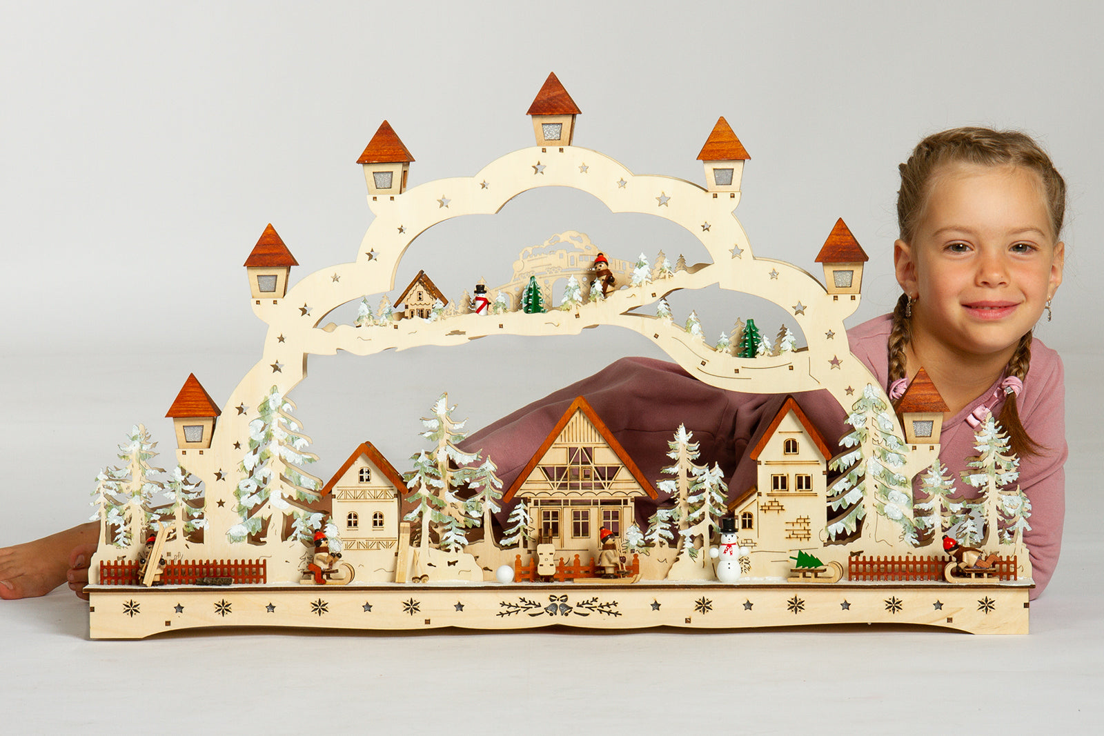Wunderschöner, RIESIGER, klassischer Holz Lichterbogen mit verdeckt liegender Beleuchtung und stromsparender LED Technologie. Neben der ungewöhnlichen Größe und dem außergewöhnlich ansprechenden klassischen Design mit den harmonischen Pastelltönen, der guten Verarbeitung unter Verwendung vornehmlich natürlicher Materialien sind es vor allem die technischen Vorzüge, die diesen Lichterbogen zu einem echten Bestseller machen. Zur Ausstattung des Schwibbogens gehören 4 beleuchtete Häuschen, 7 beleuchtete Laternen sowie zahlreiche gedrechselte Holzfiguren. Der Lichterbogen hat einen beleuchteten Sockel und eine Zwischenebene mit Häuschen und Eisenbahn. Oben am Bogen zieren den Bogen zahlreiche Laternen mit entzückenden roten Dächern. Er verbreitet durch die verdeckt angeordneten Leuchten eine wunderbar weihnachtliche Stimmung. Dem Schwibbogen liegt ein Trafo mit extra langer, transparenter und somit unauffälliger Zuleitung bei. Die Maße des Lichterbogens sind: Höhe: ca. 46 cm, Breite: ca. 78 cm, Tiefe: ca. 9 cm. SIKORA Weihnachtswelt.