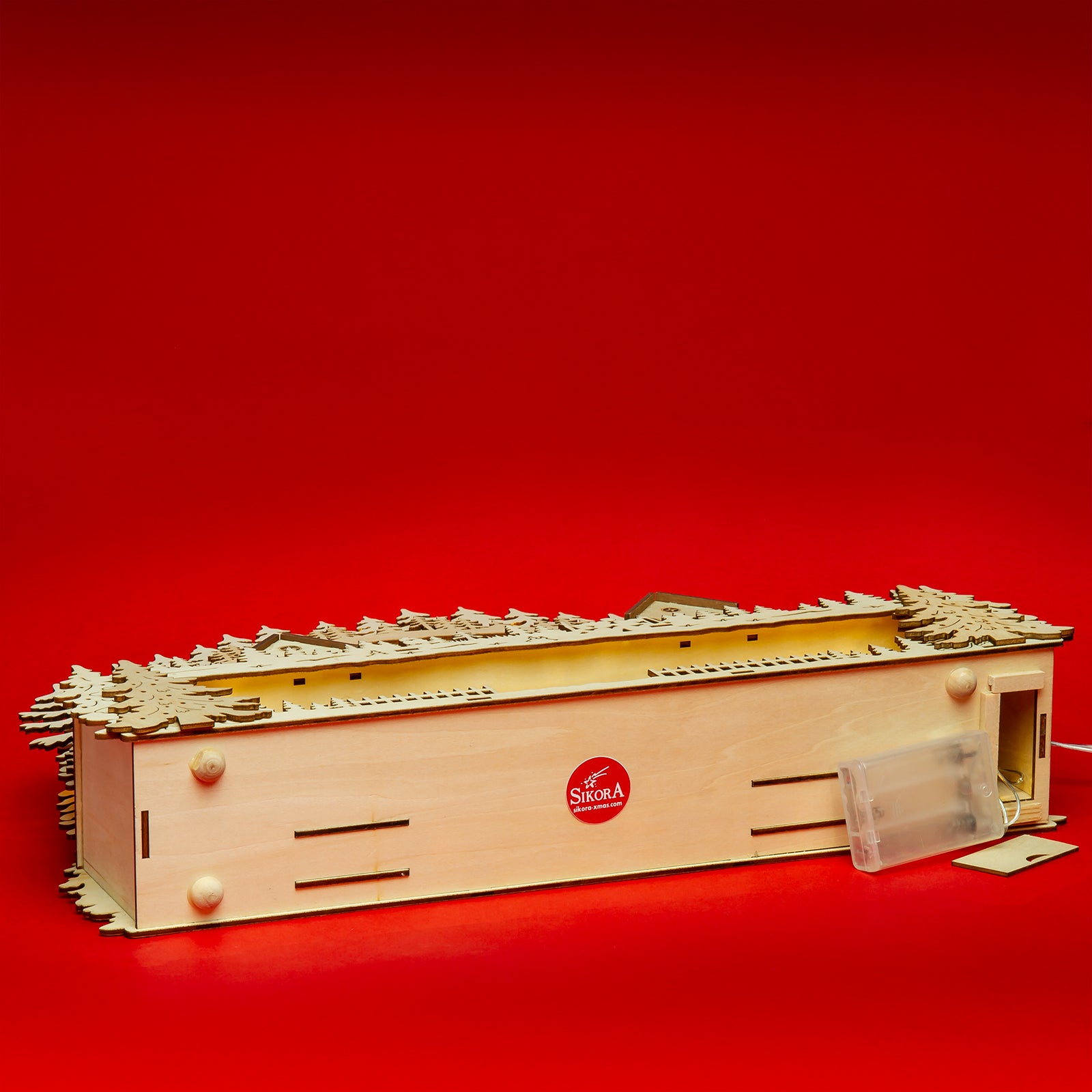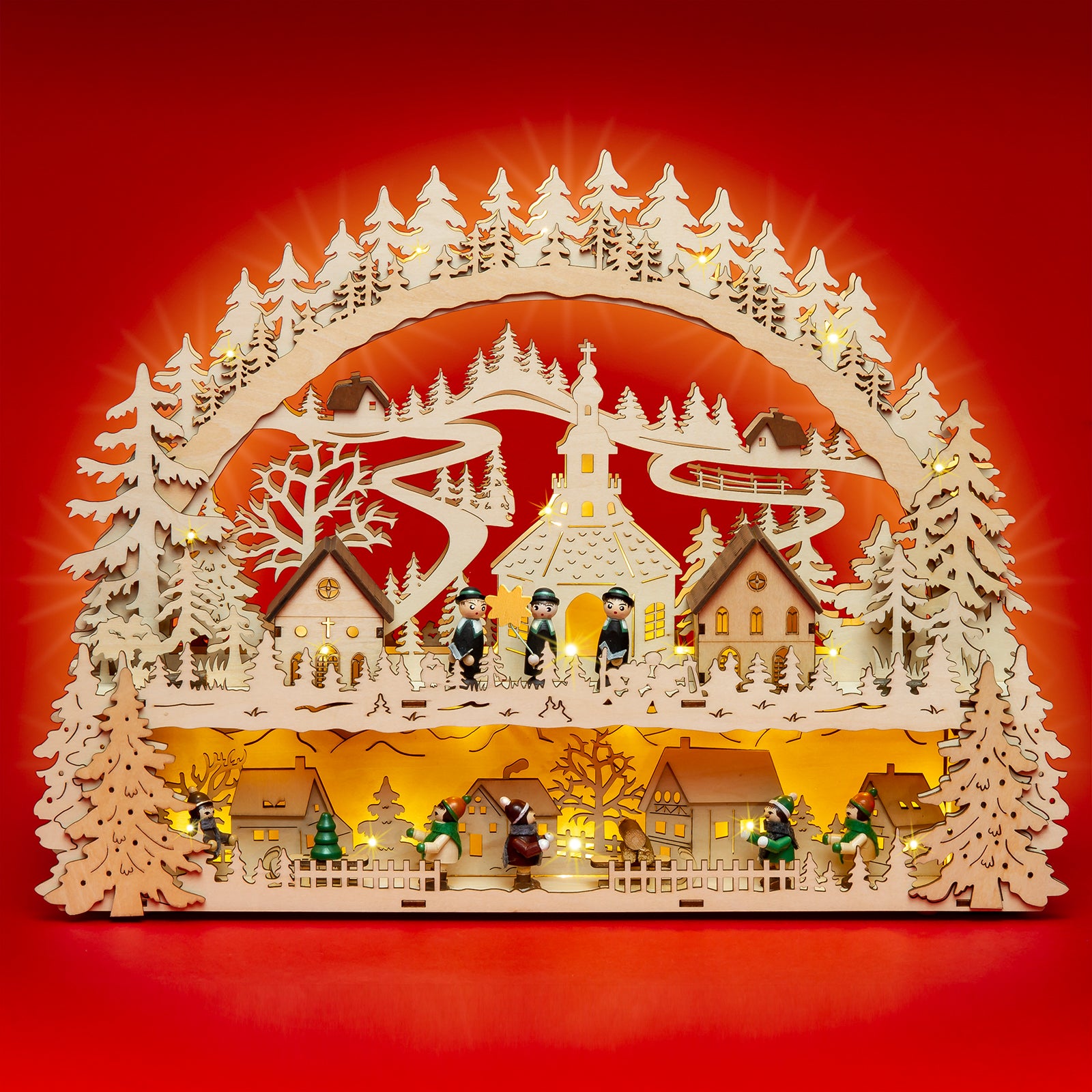 Holz-Lichterbogen mit verdeckt liegender LED-Beleuchtung und geringem Energieverbrauch. Das Design umfasst kleine Häuschen, zahlreiche handgedrechselte Figuren sowie einen beleuchteten Sockel mit Winterlandschaft. Der Lichterbogen benötigt nur ca. 5 Watt pro Stunde und sorgt durch die verdeckt angeordneten Leuchten für eine gleichmäßige Ausleuchtung.