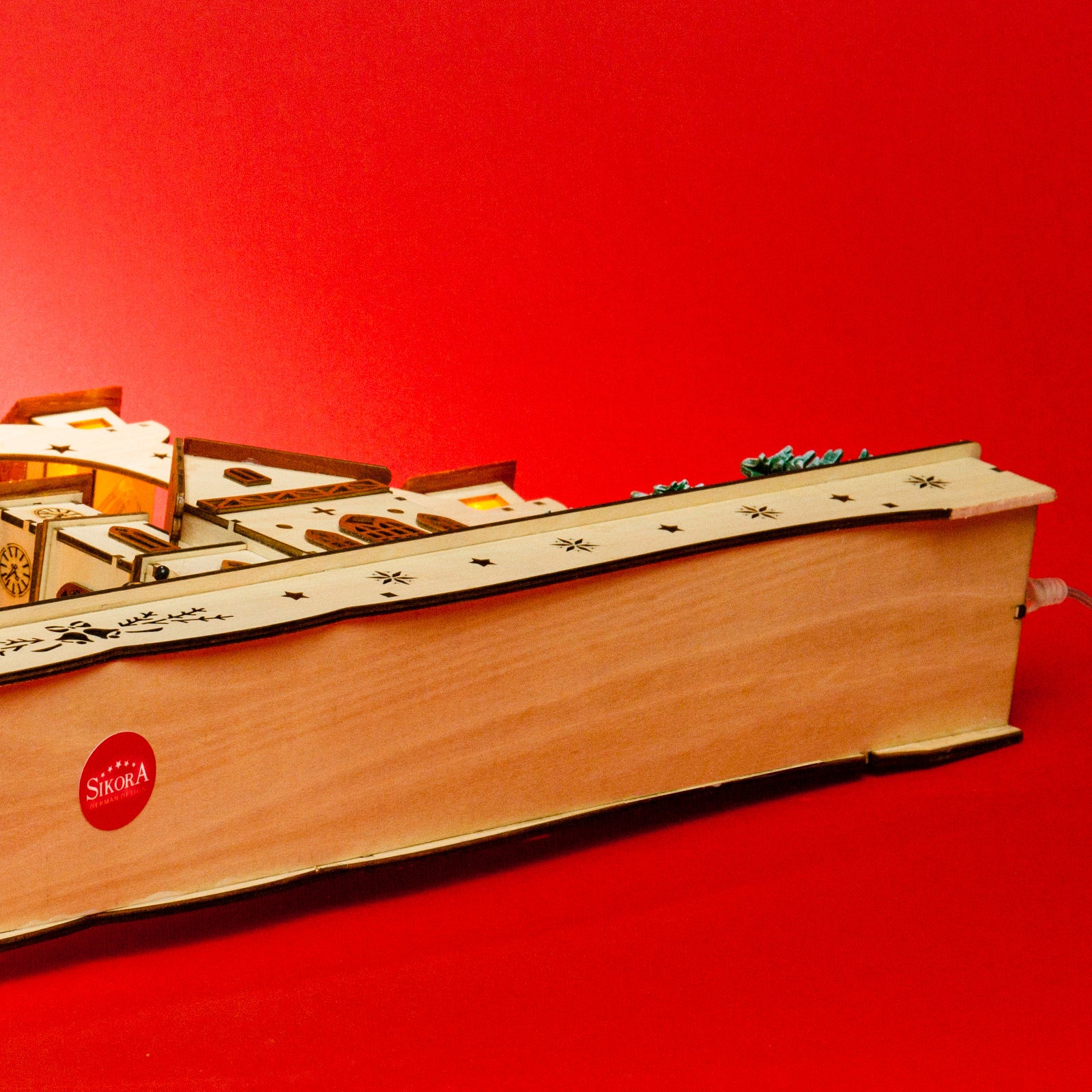 Wunderschöner, RIESIGER, klassischer Holz Lichterbogen mit verdeckt liegender Beleuchtung und stromsparender LED Technologie. Neben der ungewöhnlichen Größe und dem außergewöhnlich ansprechenden klassischen Design mit den harmonischen Pastelltönen, der guten Verarbeitung unter Verwendung vornehmlich natürlicher Materialien sind es vor allem die technischen Vorzüge, die diesen Lichterbogen zu einem echten Highlight machen. Zur Ausstattung des Schwibbogens gehören eine beleuchtete Kirche, beleuchtete Häuschen und Laternen sowie zahlreiche gedrechselte Holzfiguren. Der Lichterbogen hat einen beleuchteten Sockel und eine Zwischenebene mit Häuschen und Eisenbahn. Oben am Bogen zieren gibt es 7 beleuchtete Laternen mit entzückenden baraunroten Dächern. Der Bogen benötigt Dank der LED Technik nur wenig Strom und verbreitet durch die verdeckt angeordneten Leuchten dennoch eine wunderbar weihnachtliche Stimmung. Dem Schwibbogen liegt ein Trafo mit extra langer, transparenter und somit unauffälliger Zuleitung bei. Die Maße des Lichterbogens sind: Höhe: ca. 46 cm, Breite: ca. 78 cm, Tiefe: ca. 9 cm. SIKORA Weihnachtswelt.