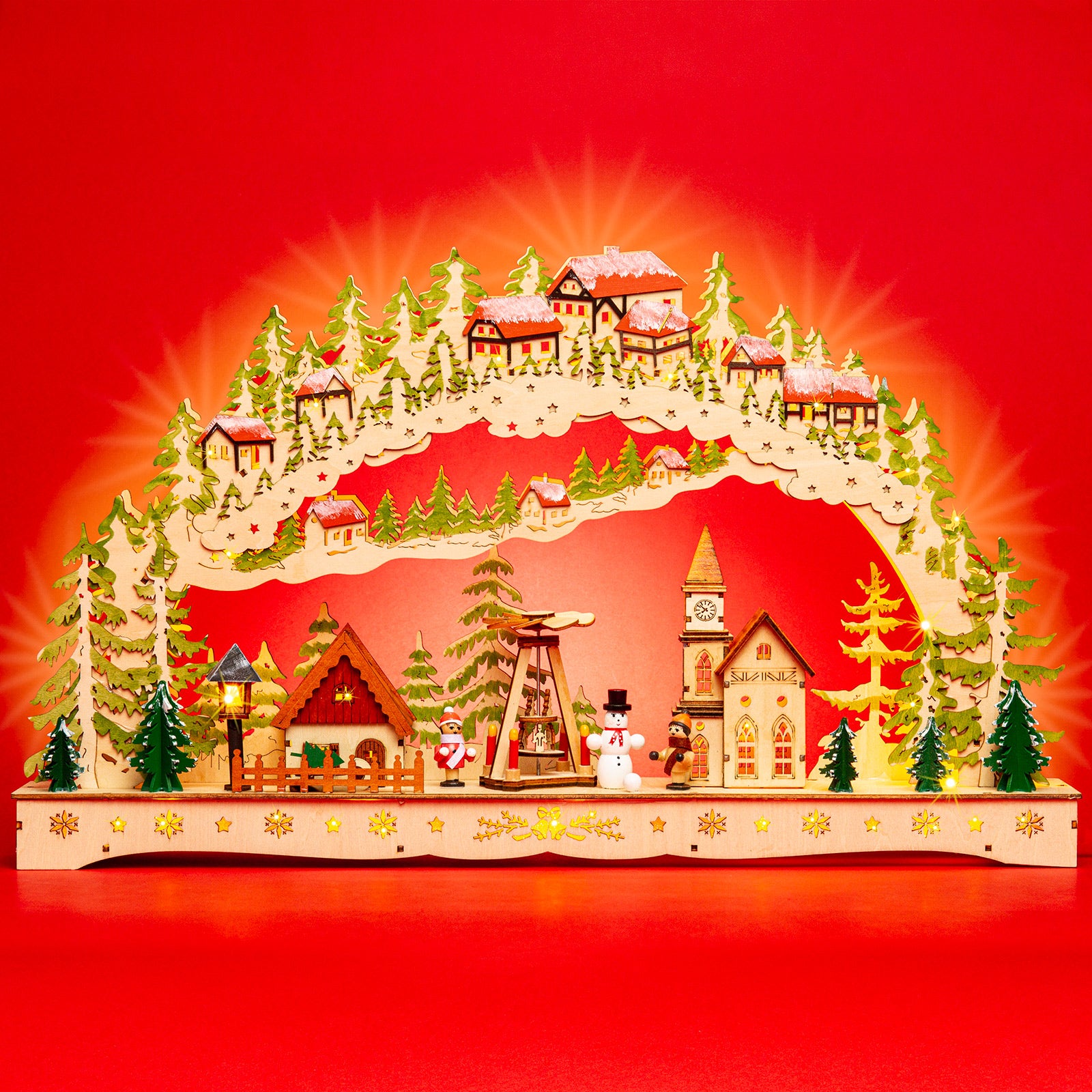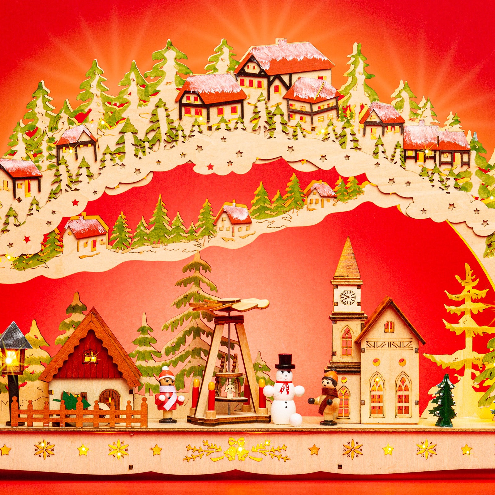 Wunderschöner, großer, klassischer Holz Lichterbogen mit verdeckt liegender Beleuchtung, und stromsparender LED Technologie. Neben der beachtlichen Größe und dem außergewöhnlich ansprechenden Design mit harmonischen Pastelltönen, der guten Verarbeitung unter Verwendung vornehmlich natürlicher Materialien sind es vor allem die technischen Vorzüge, die diesen Lichterbogen zu einem echten Highlightmachen. Zur Ausstattung des Schwibbogens gehören eine beleuchtete Kirche, ein beleuchtetes Haus, eine beleuchtete Laterne sowie 3 handgedrechselte Minatur Figuren. Der Bogen benötigt lediglich 6 Watt in der Stunde und verbreitet durch die verdeckt angeordneten Leuchten dennoch eine wunderbar weihnachtliche Stimmung. Dem Schwibbogen liegt ein Trafo mit extra langer, transparenter und somit unauffälliger Zuleitung bei. Die Maße des Lichterbogens sind: Höhe: ca. 33 cm, Breite: ca. 57 cm, Tiefe: ca. 8 cm. SIKORA Weihnachtswelt.