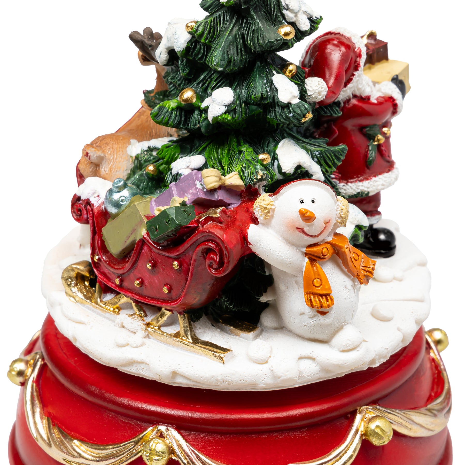 Diese liebevoll gestaltete Weihnachtsspieldose aus hochwertiger Gießkeramik ist ein bezaubernder Blickfang für jede Winterdekoration. Die festliche Szene zeigt den Weihnachtsmann mit einem Rentier vor einem geschmückten Tannenbaum - umgeben von Geschenken, einem Schlitten und einem fröhlichen Schneemann. Die Dose ist detailreich handbemalt und beeindruckt mit ihrer nostalgischen Ausstrahlung. Die aufwendig verzierte, rote Basis mit goldfarbenen Akzenten und Sternenausschnitten rundet das klassische Weihnachtsmotiv perfekt ab. Durch Aufziehen des Spielwerks erklingt eine stimmungsvolle Weihnachtsmelodie und die Figur beginnt sich zu drehen. Ob auf dem Sideboard, der Fensterbank oder als Geschenk - diese Spieldose verbreitet festliche Stimmung und weckt Kindheitserinnerungen.