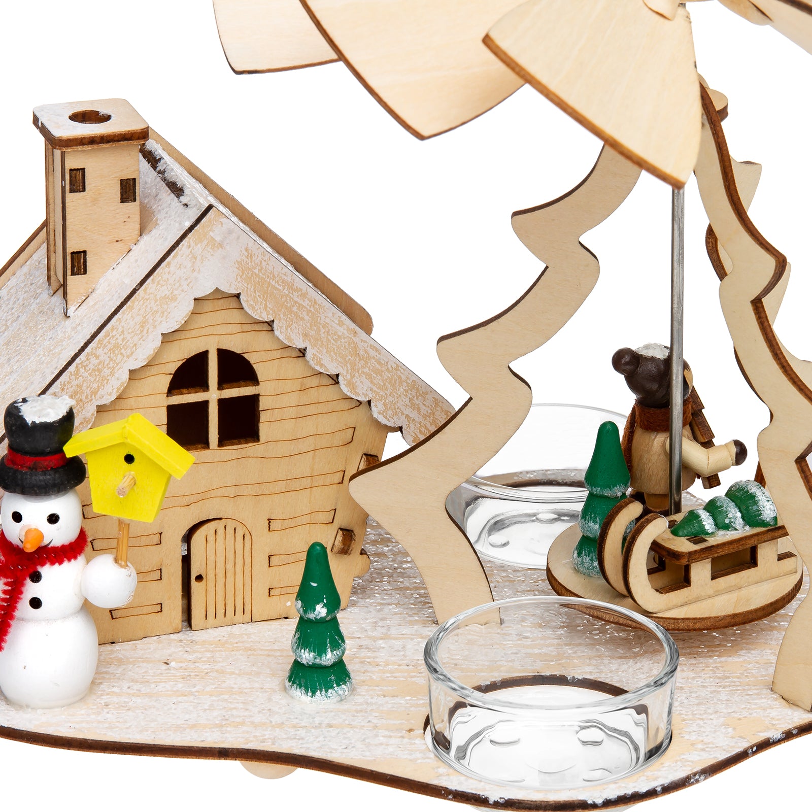 Durch den Schein von drei Teelichtern (nicht im Lieferumfang enthalten) beginnen sich die Flügel sanft zu drehen und setzen die kleine Märchenszene stimmungsvoll in Bewegung. Gleichzeitig kann das Haus als Räuchermännchen genutzt werden – einfach einen handelsüblichen Räucherkegel einsetzen und das Häuschen verströmt weihnachtlichen Duft.