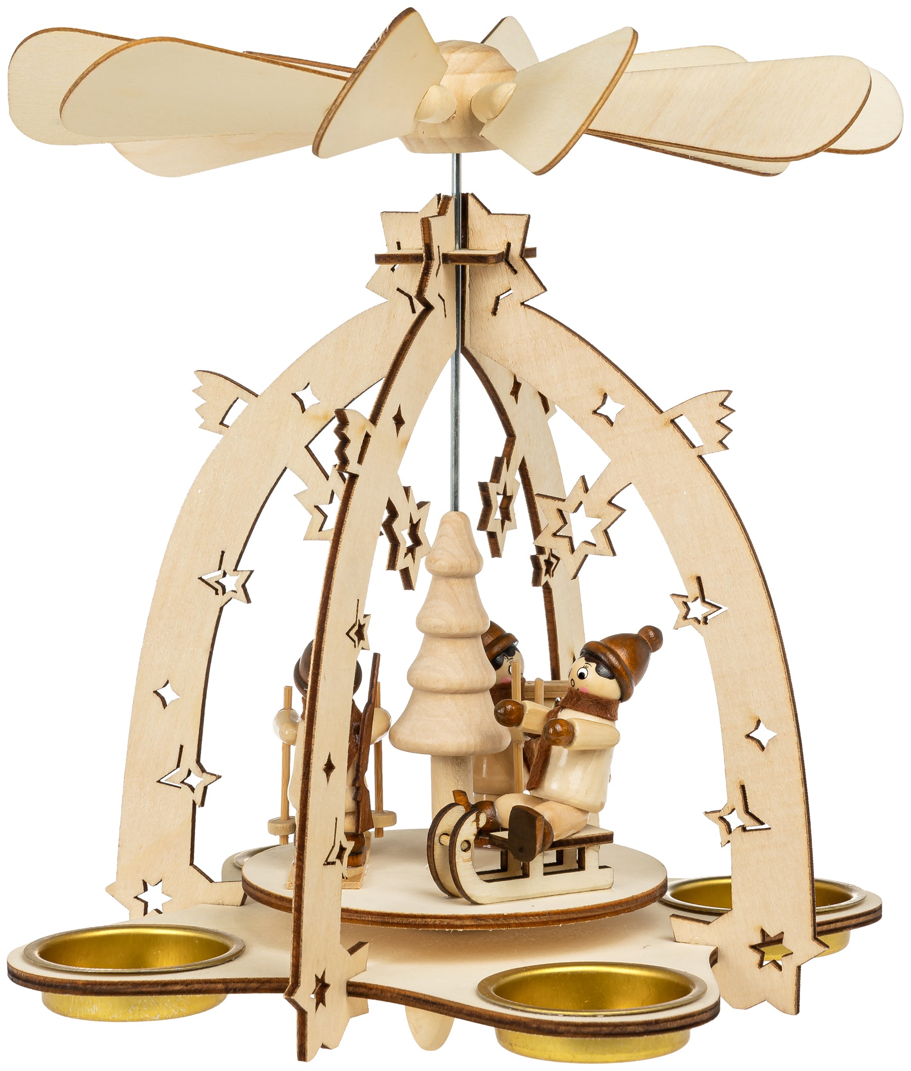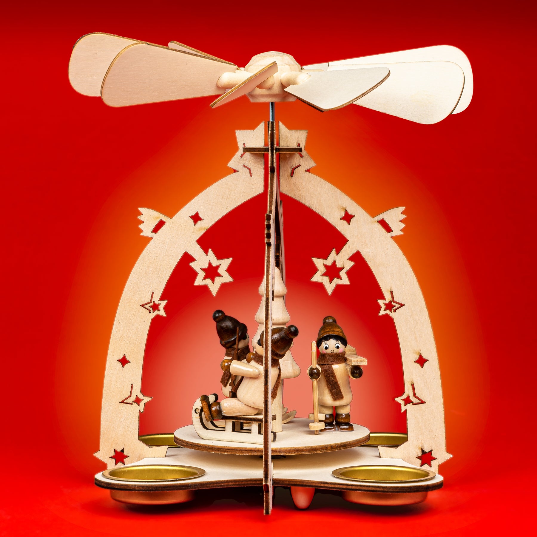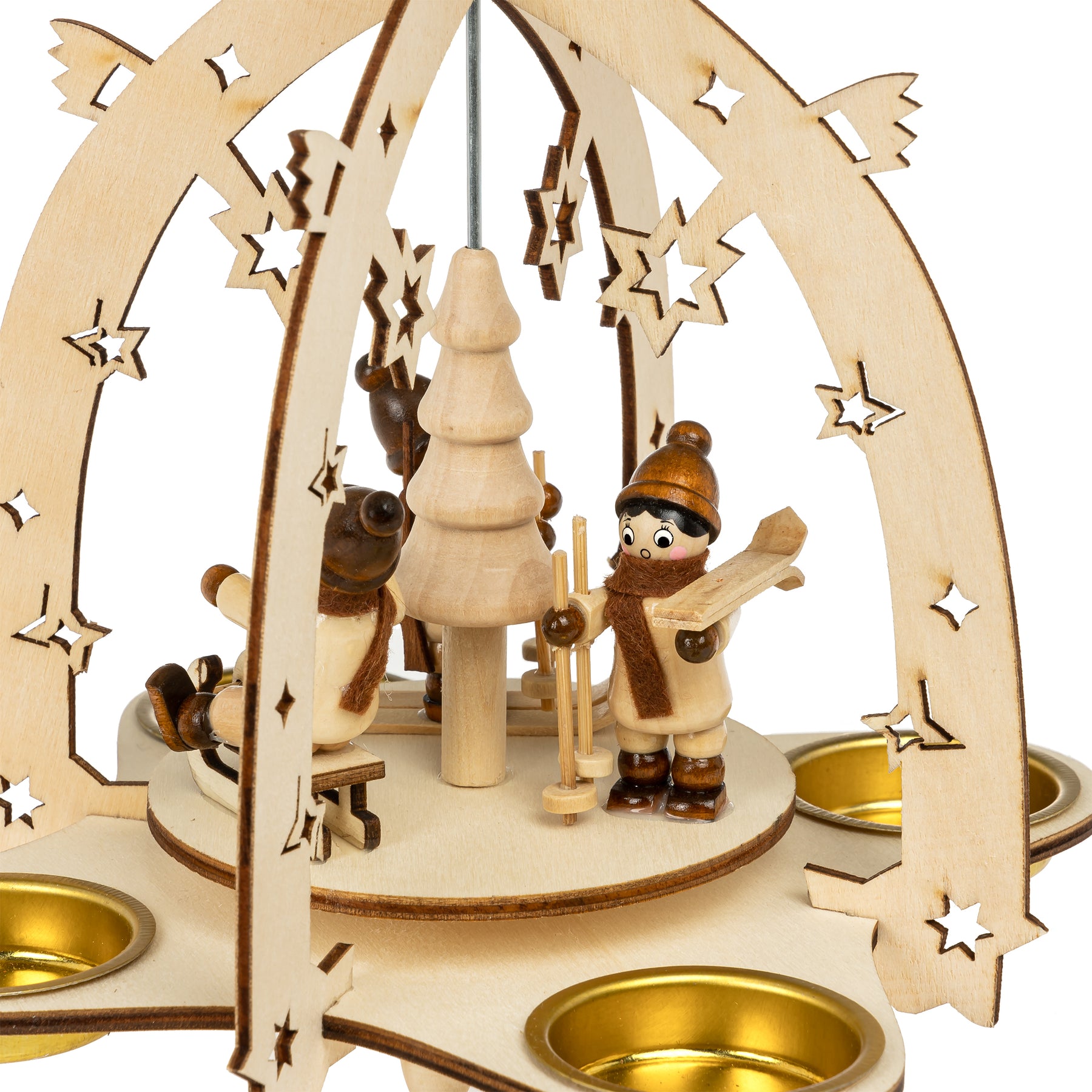 Wunderschöne, kompakte Teelicht Weihnachtspyramide aus hochwertigem Birken Sperrholz. Diese Weihnachtspyramide bringt nicht nur Kinderaugen zum Leuchten... Die sich durch den warmen Kerzenschein langsam drehende Pyramide, bestückt mit verschiedenen anmutigen Szenen unter den mit Sternen verzierten Bögen verbreitet eine angenehm ruhige, weihnachtliche Stimmung. Die Pyramide ist zur praktischen Benutzung mit 3 Teelichtern vorgesehen (nicht im Lieferumfang enthalten). Die Pyramide hat eine Höhe von ca. 21 cm. SIKORA Weihnachtswelt.