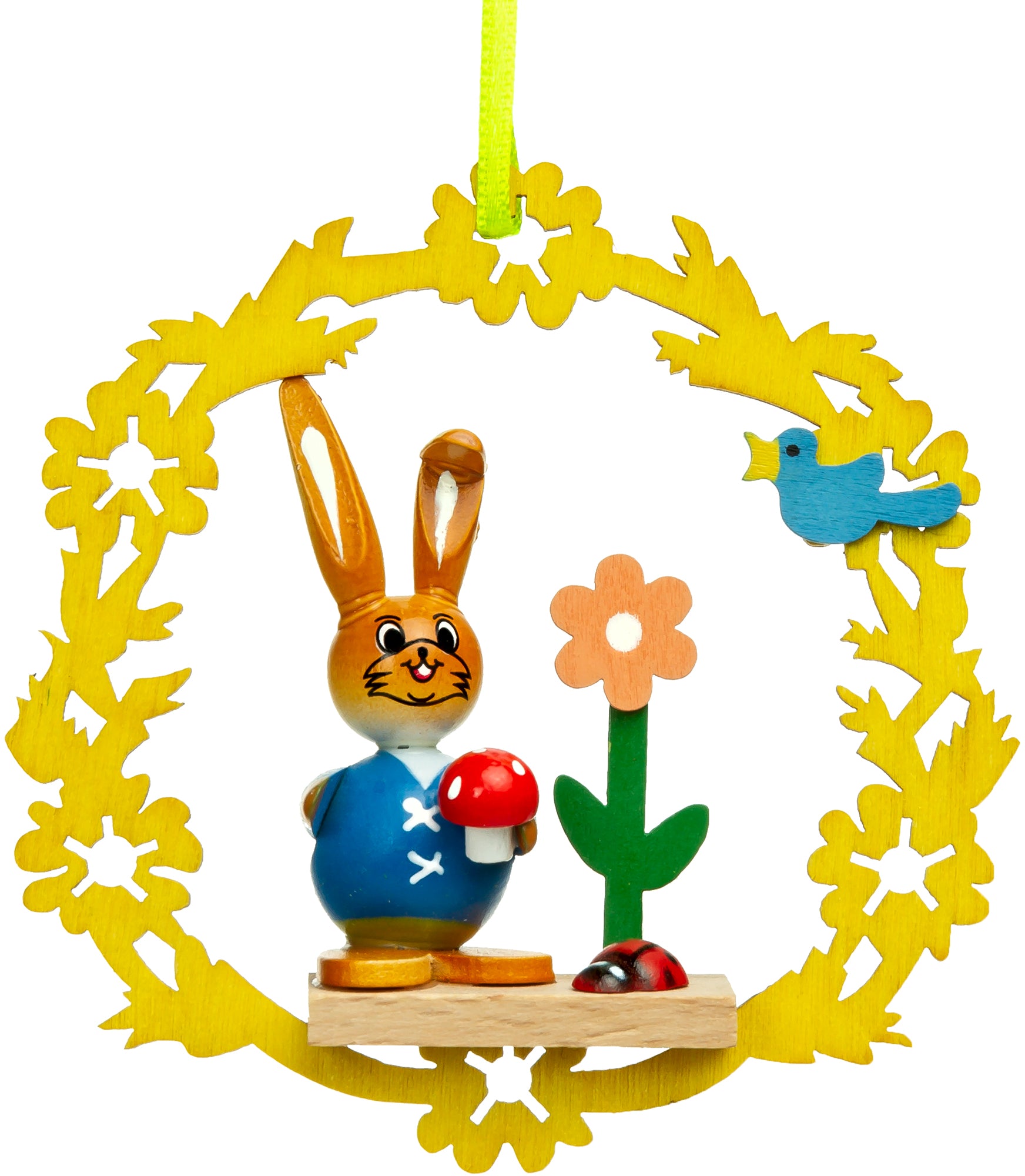 Lustige kleine Osterhasen Figuren im Blumenkranz zum Anhängen an den Osterstrauß im farbsortierten 4er Set. Diese kleinen Kunstwerke werden in aufwändiger Handarbeit mit frühlingshaft bunten Farben bemalt. Zuvor werden sie aus kleinen Holzkugeln gefertigt und mit lustigen Accessoires wie Ostereiern, Pinseln, Farbtöpfen und Blumen detailreich bestückt. Die Häschen besitzen ca. 8 cm lange Fadenschlaufen an denen sie bequem aufgehängt werden können. Sie erhalten die Anhänger in einem praktischen kleinen Karton in dem sie sicher bis zum nächsten Jahr aufbewahrt werden können. Material: Holz, Höhe ca. 9,5 cm. SIKORA Home.