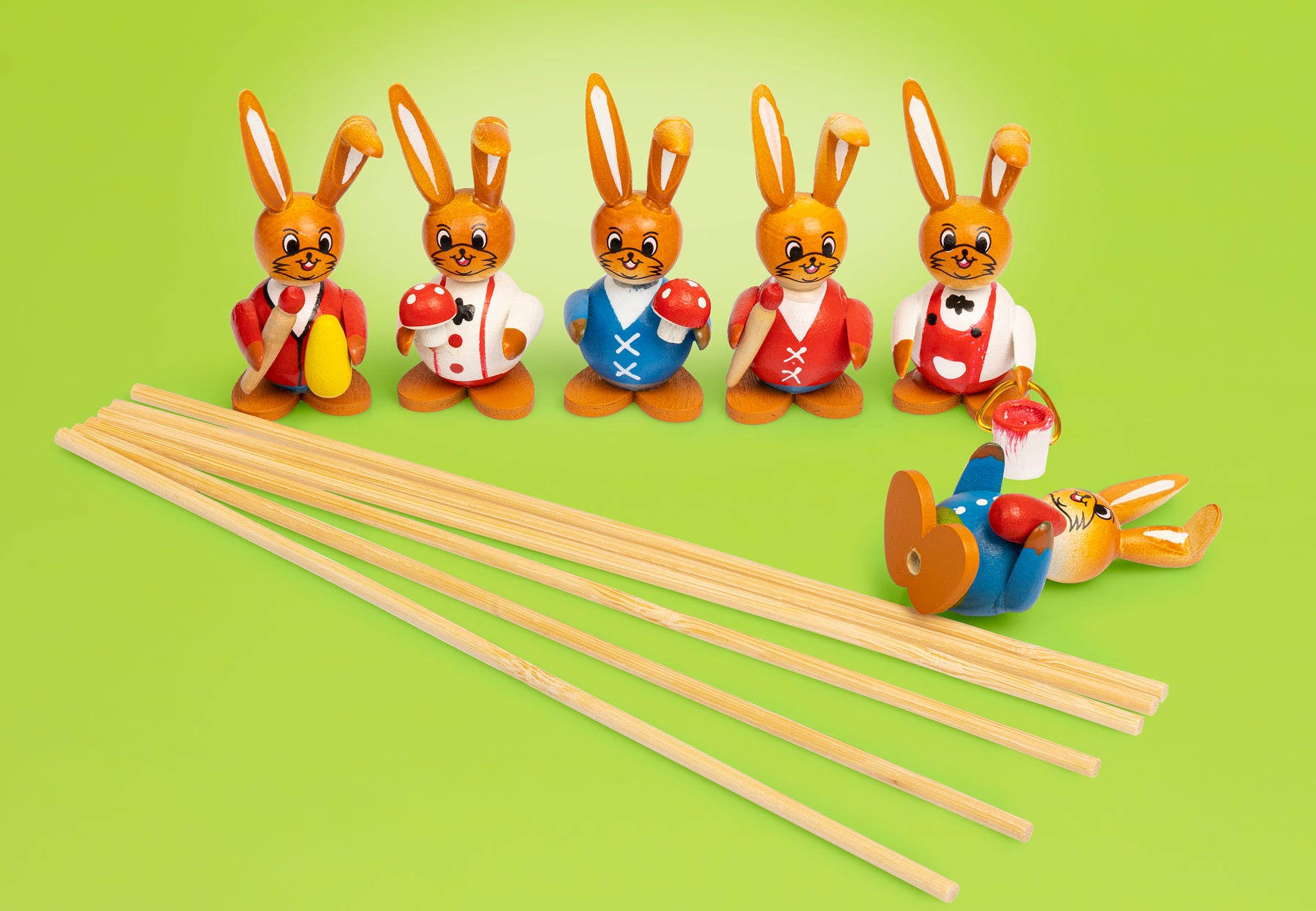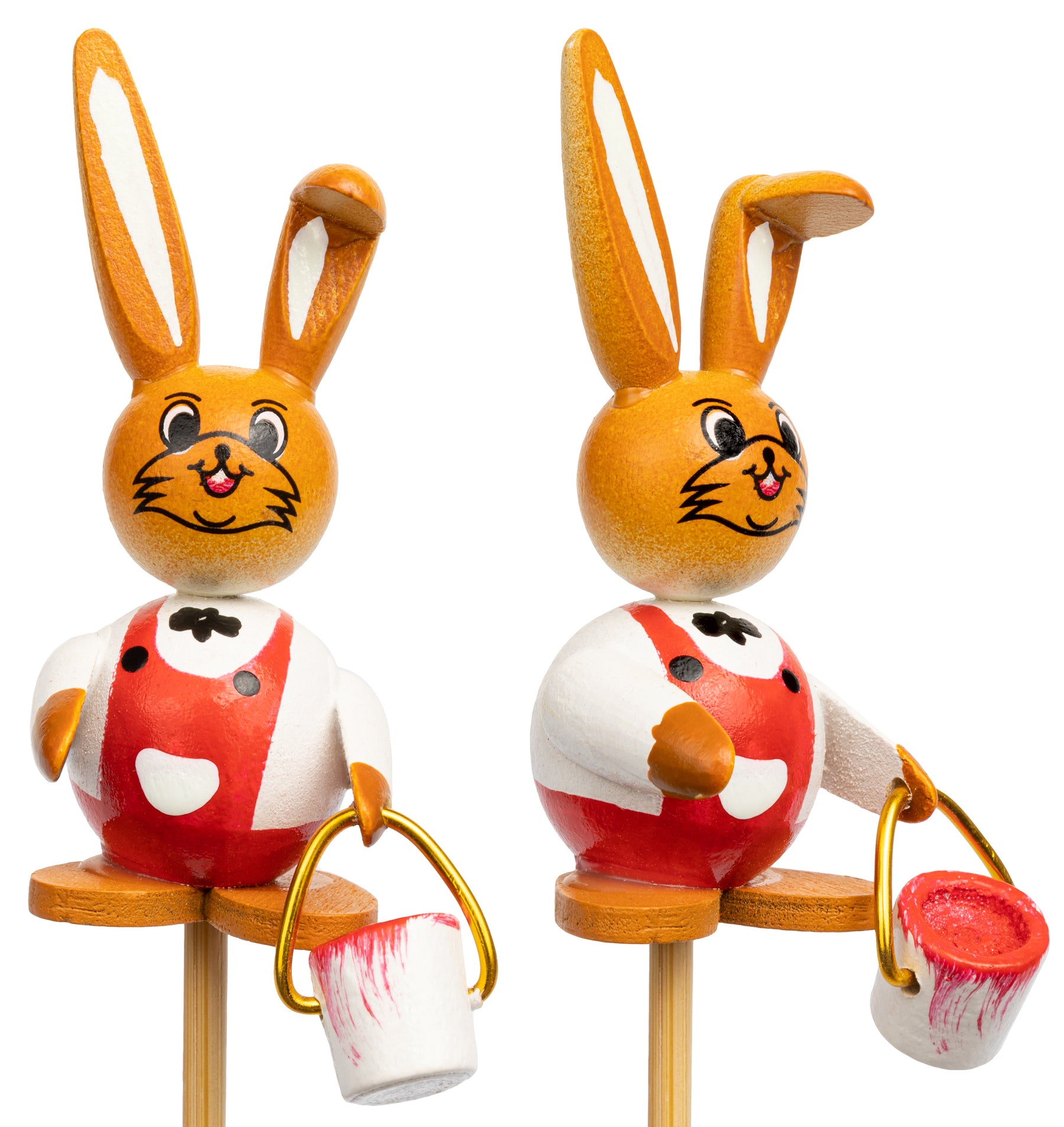 Lustige kleine Osterhasen Figuren zum Hinstellen oder zum Einstecken mit Holzstab (Länge: 18cm). Diese kleinen Kunstwerke werden in aufwändiger Handarbeit mit frühlingshaft bunten Farben bemalt. Zuvor werden sie aus kleinen Holzkugeln gefertigt und mit lustigen Accessoires wie Ostereiern, Pinseln, Farbtöpfen und Pinseln detailreich bestückt. Den Häschen liegen passende Holzstäbe zum Einstecken bei. So können Sie Ihre Pflanze und Blumentöpfe herrlich österlich dekorieren. Sie erhalten die Figuren in einem praktischen kleinen Karton in dem sie sicher bis zum nächsten Jahr aufbewahrt werden können. Material: Holz, Höhe ca. 6 cm. SIKORA Home.