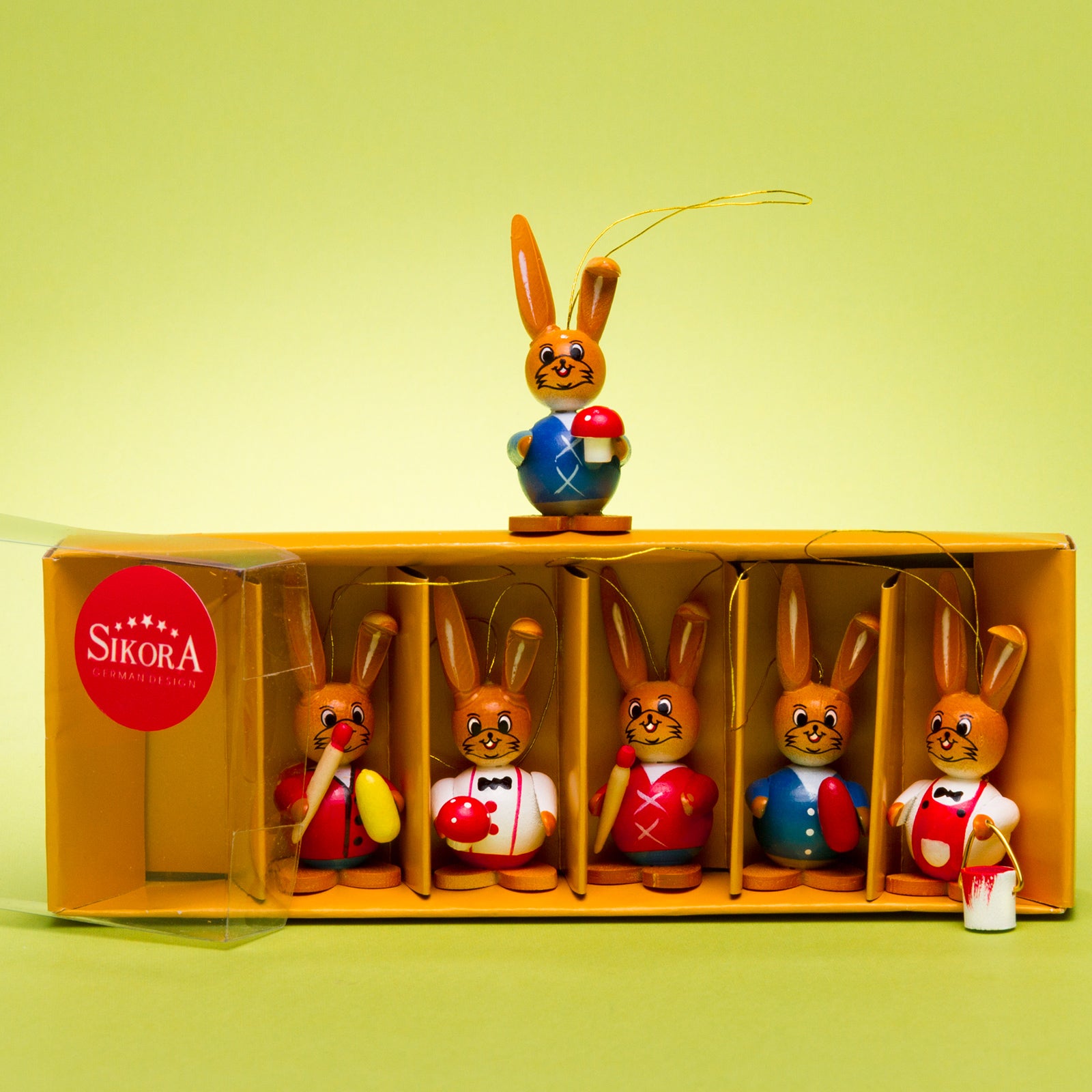 Lustige kleine Osterhasen Figuren zum Anhängen an den Osterstrauss. Diese kleinen Kunstwerke werden in aufwändiger Handabeit mit frühlingshaft bunten Farben bemalt. Zuvor werden sie aus kleinen Holzkugeln gefertigt und mit lustigen Accessoires wie Ostereiern, Pinseln, Farbtöpfen und Pinseln detaillreich bestückt. Die Häschen besitzen goldfarbene ca. 6 cm lange Fadenschlaufen an denen sie bequem aufgehängt werden können. Sie erhalten die Anhänger in einem praktischen kleinen Karton in dem sie sicher bis zum nächsten Jahr aufbewahrt werden können. Material: Holz, Höhe ca. 6 cm. Ein Markenprodukt von SIKORA Home.